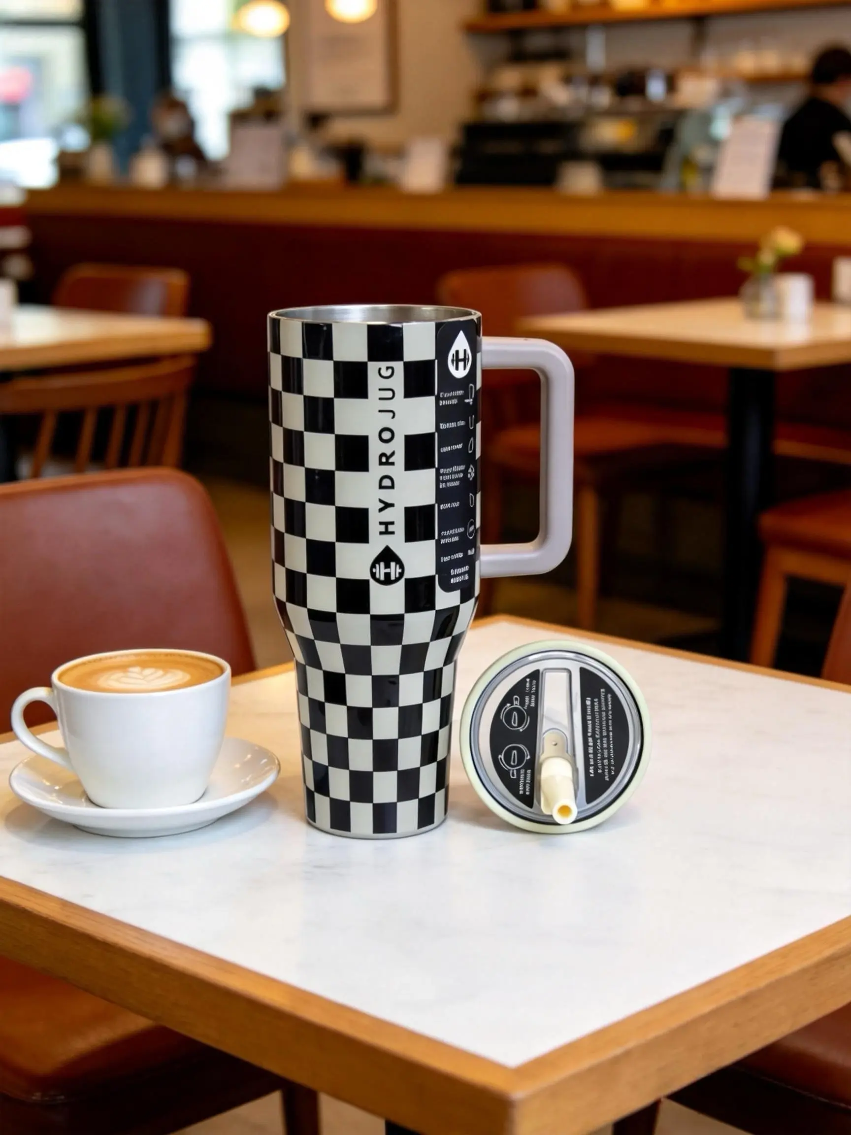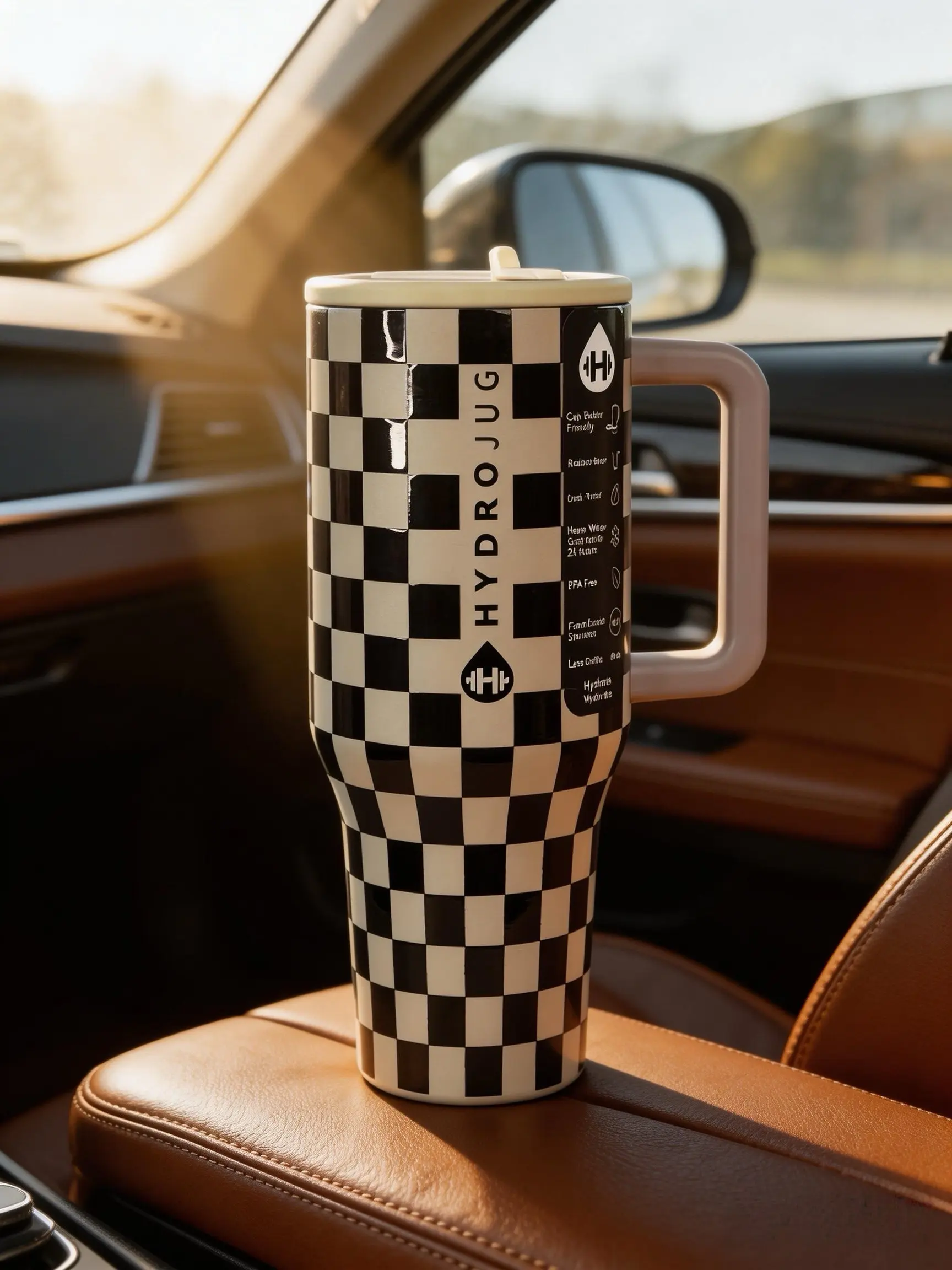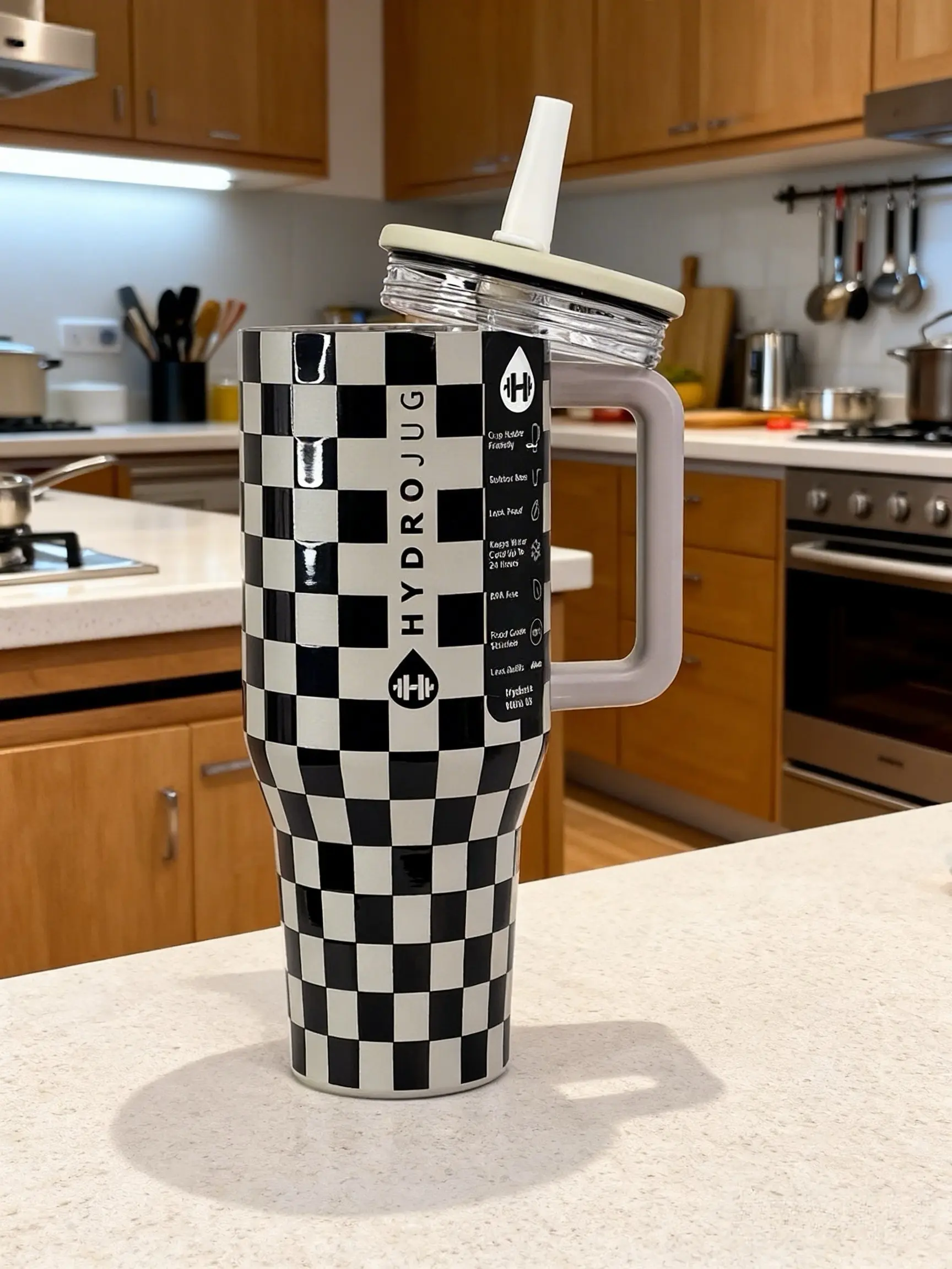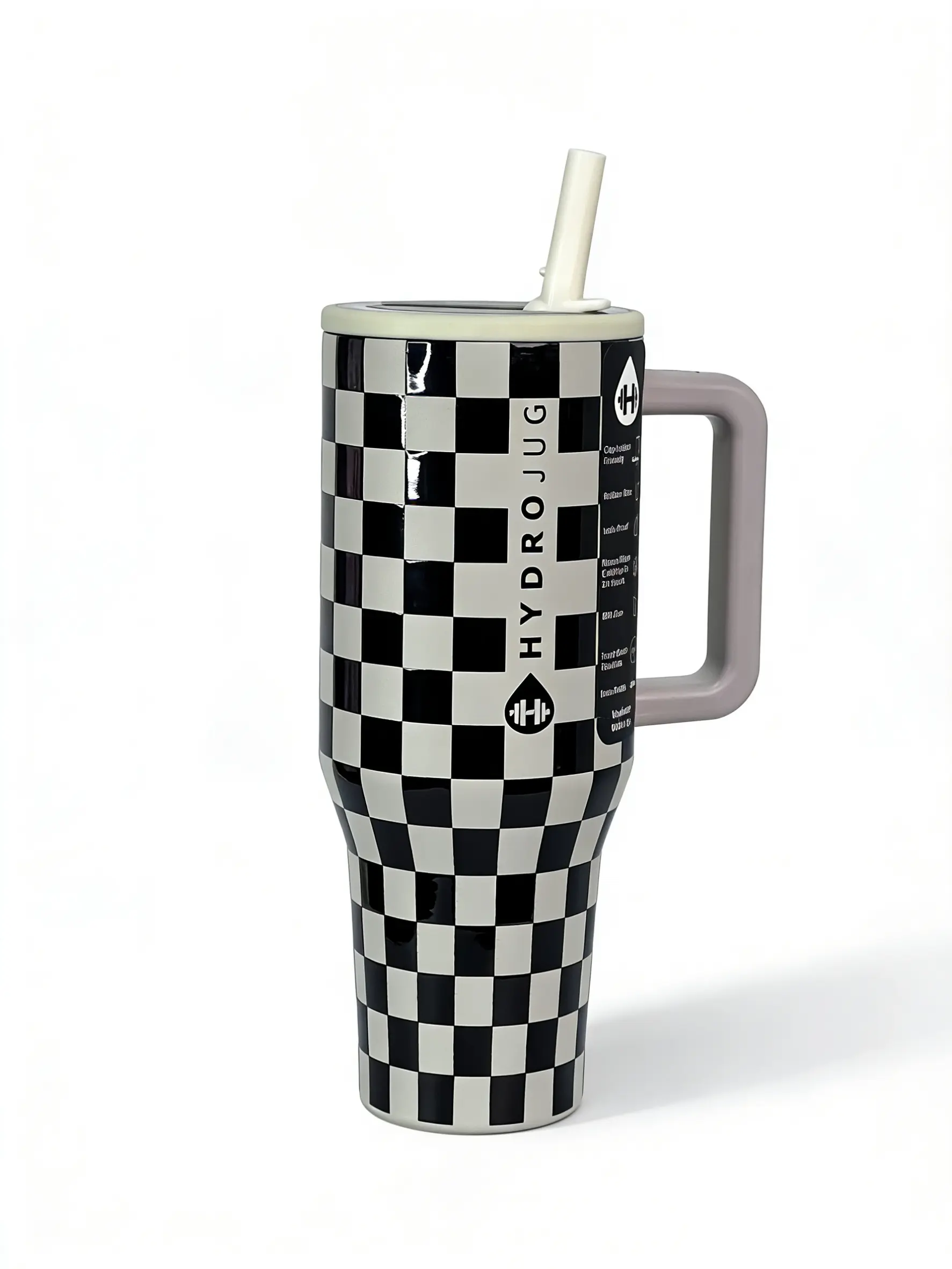 HydroJug 40oz black and white checkered straw cup made of stainless steel, with insulation and cooling functions, a sealed straw lid to prevent leakage. The handle design is convenient for carrying. Suitable for use in cars, offices, and travel.
