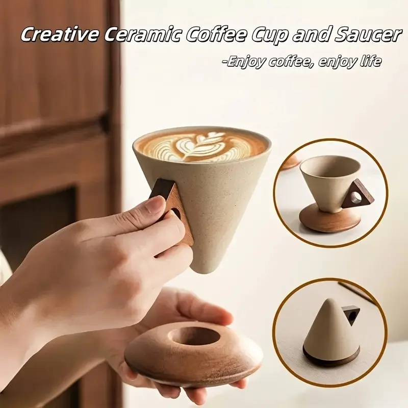 250ML Handmade Ceramic Coffee Cup, Wide Mouth Latte Mug with Heat-Resistant Wooden Handle, Ideal for Home & Office, Perfect Gift