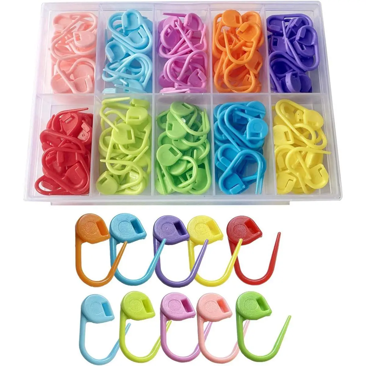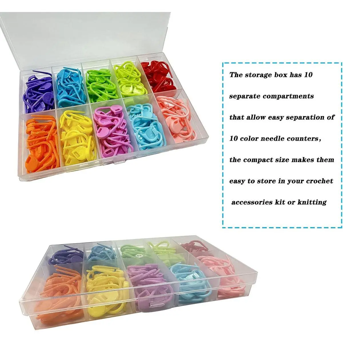 FEATURES:the storage box has 10 separate compartments that allow easy separation of 10 color needle counters,the compact size makes them easy to store in your crochet accessories kit or knitting supplies bag