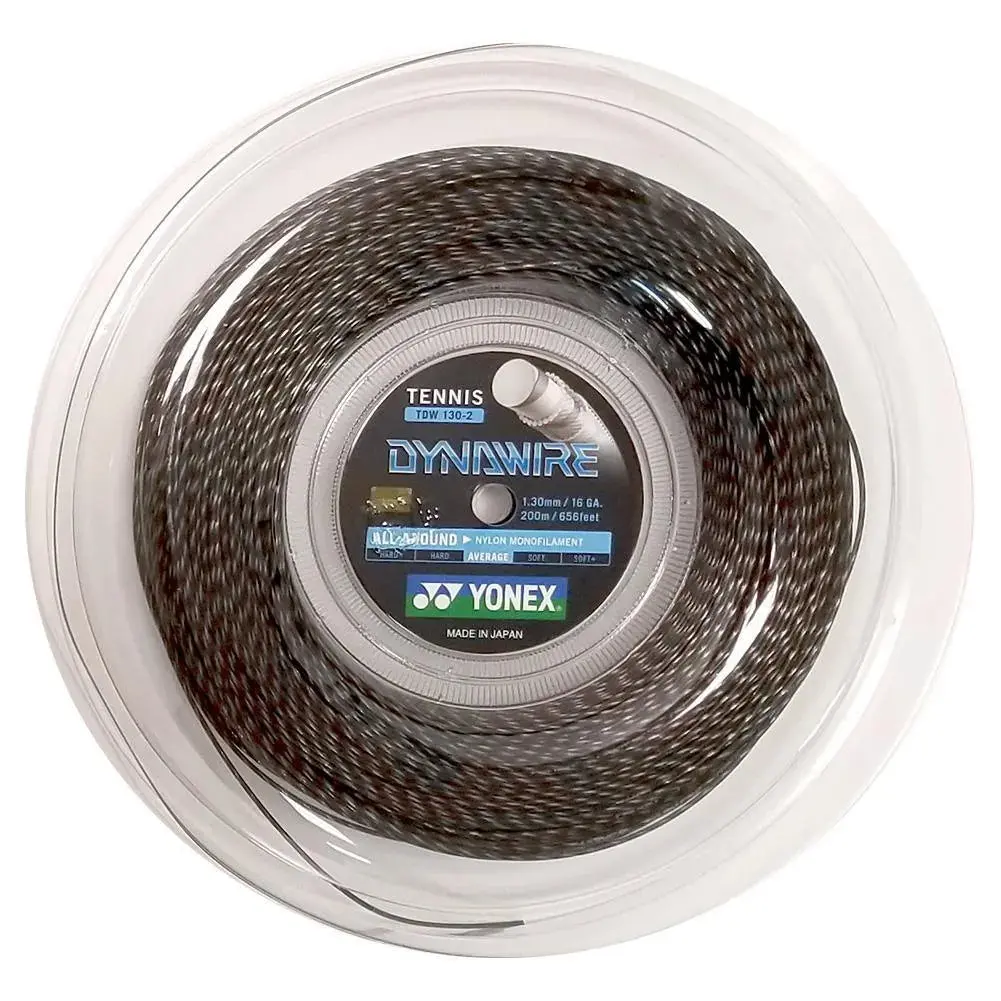 Yonex Dynawire. This string features a nylon monofilament core surrounded by metal film with winding nylon wraps. The metallic film around the string's core generates sharp repulsion with high durability.