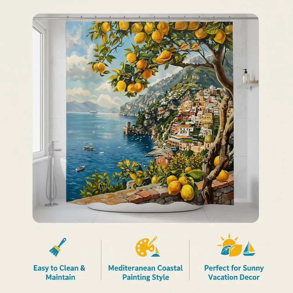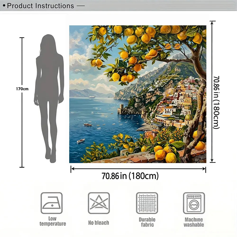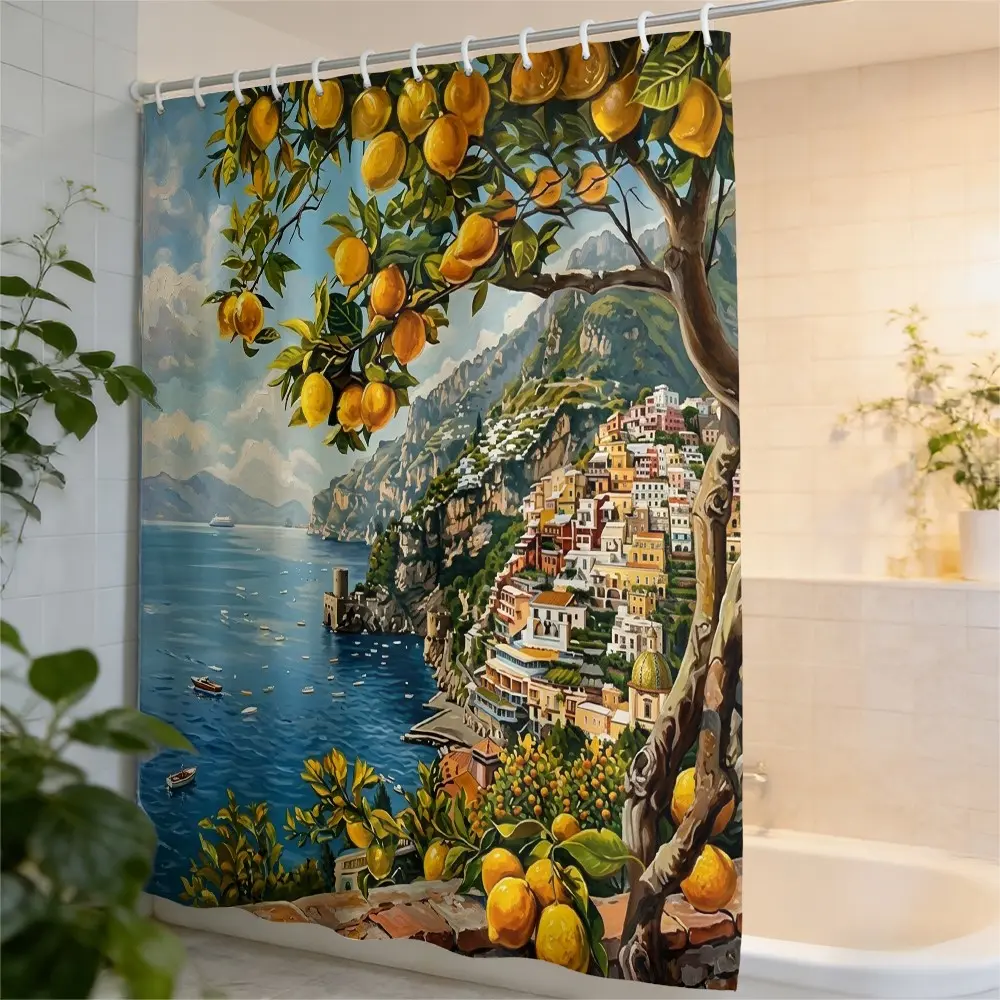 Vintage Amalfi Lemon Coast Bath Curtain, Italian Sea View Fabric Bathroom Curtain, Soft Polyester, Home Decor, Hotel Bathroom Decor
