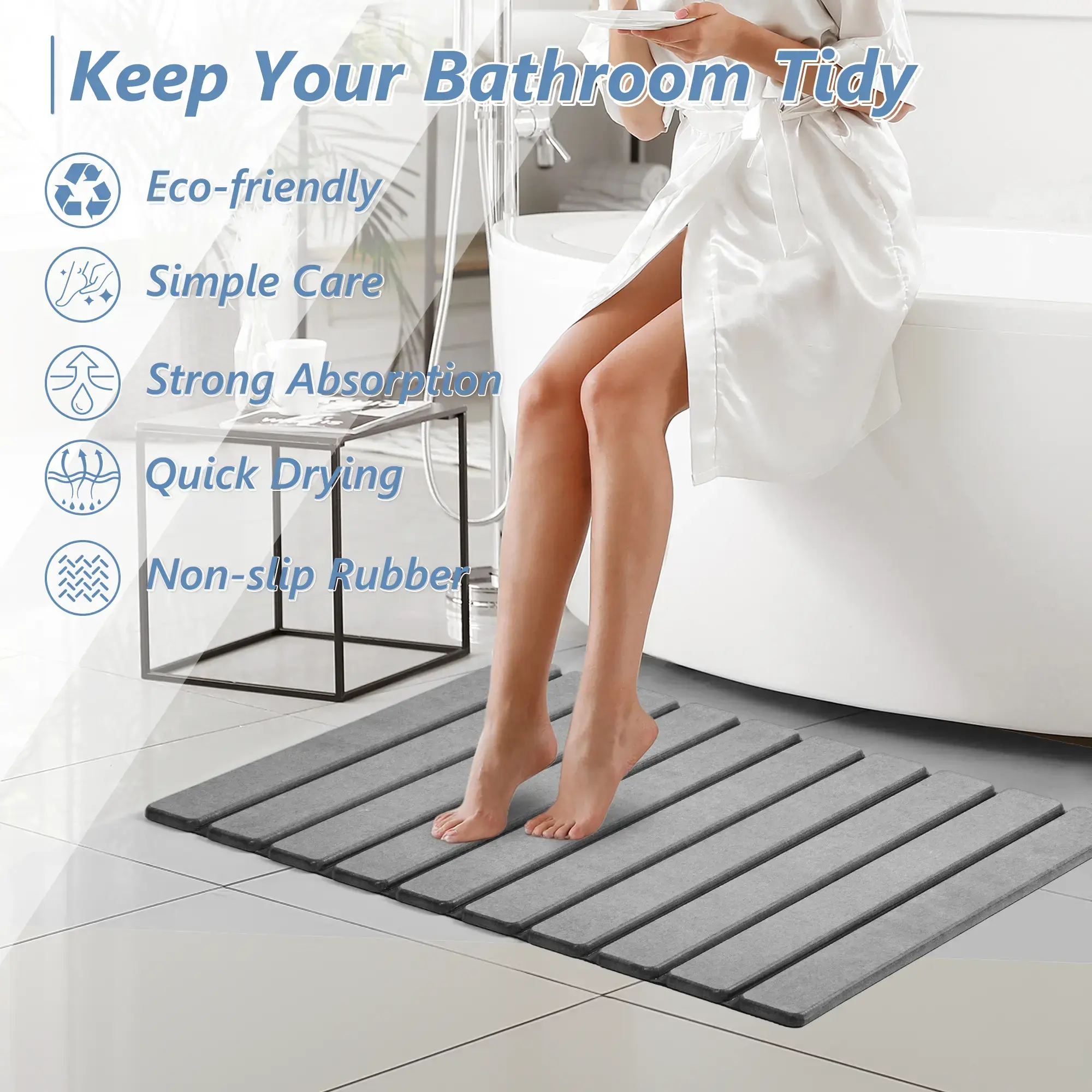 ·QUICK-DRY STONE FEEL (DIATOMACEOUS EARTH CORE) – Pulls water off feet fast and helps the surface dry quickly to keep bathroom floors feeling clean and less damp (drying speed varies with airflow/humidity).