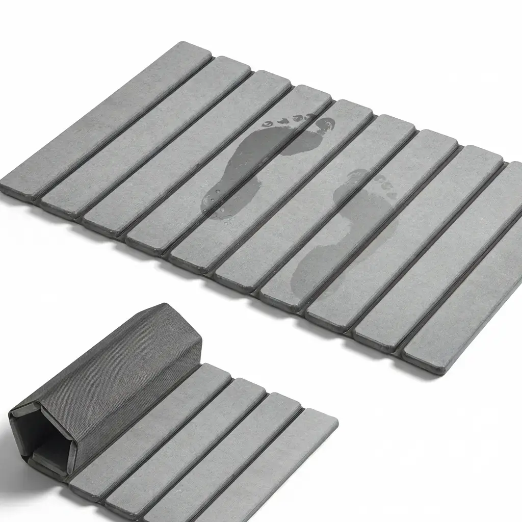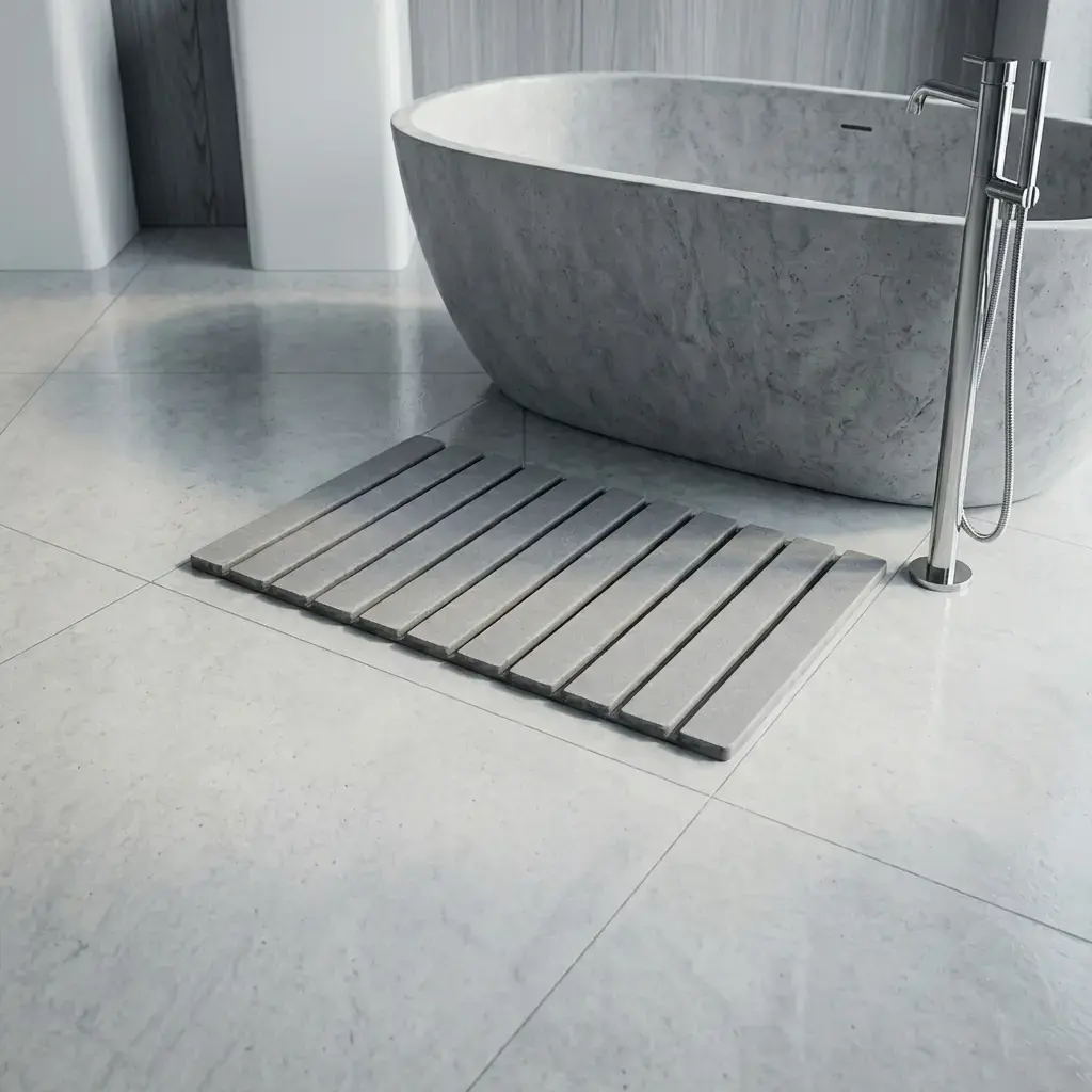 ·CENTER SEAM CARE TIP (FAST FIX IN 1 STEP) – With heavier splashes, a small amount of water may sit briefly at the center seam. Simply sweep it onto the stone surface and it will dry. In very humid bathrooms, stand the mat upright for faster evaporation.
