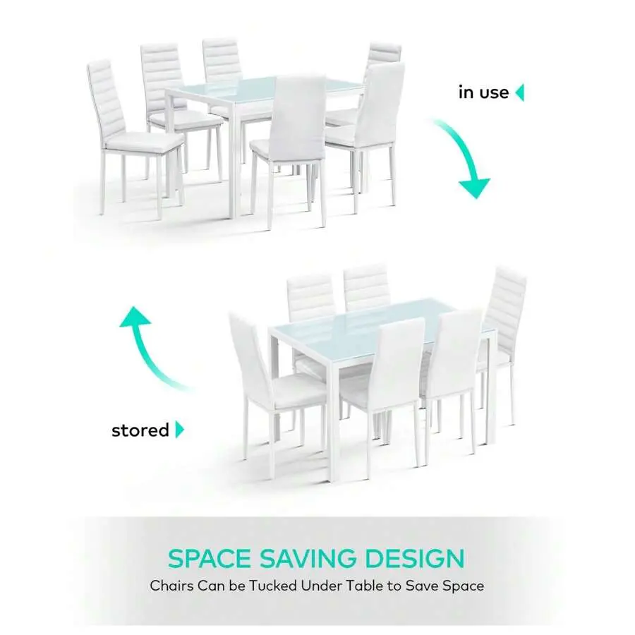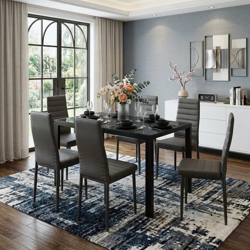A stylish and functional dining set is the heart of any home-serving as a gathering spot for meals, family conversations, and small gatherings, while also elevating your overall home décor.Our 4-chair and 6-chair dining sets are designed to fit every family’s needs, featuring a sleek glass dining table paired with comfortable high-back PU leather chairs, perfect for both dining rooms and living rooms.