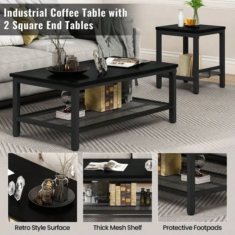3-Piece Industrial Coffee Table Set with 2 Square End Tables