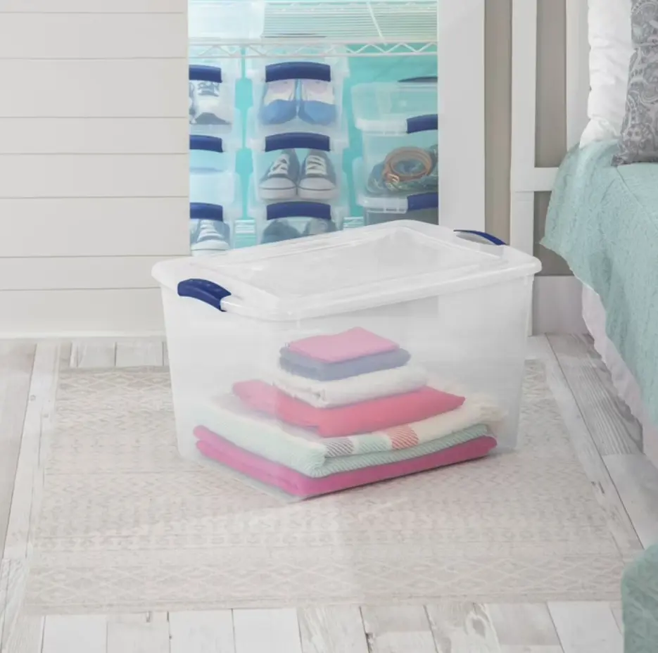 Step up to Sterilite’s 66 Quart Clear Latching Storage Bin with Lid and get organized! The clear base and lid allow you to easily view and locate stored contents from any angle. Color-accented latches securely attach the lid to the base, keeping items contained while providing a comfortable grip for easy carrying. The recessed lid design allows storage bins to stack neatly, maximizing vertical storage space. This plastic storage container is perfect for clothing, boots, sporting gear, and more, helping bring order to closets, bedrooms, and dorm rooms with ease.