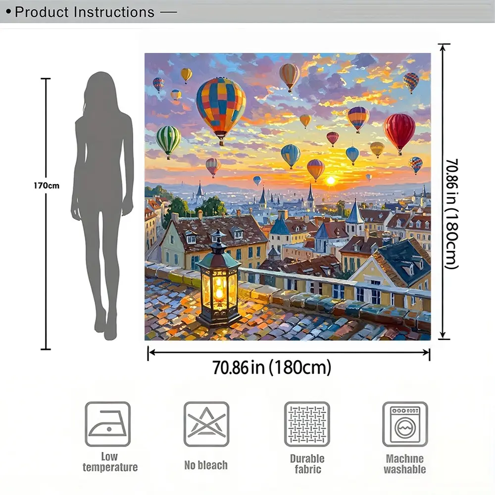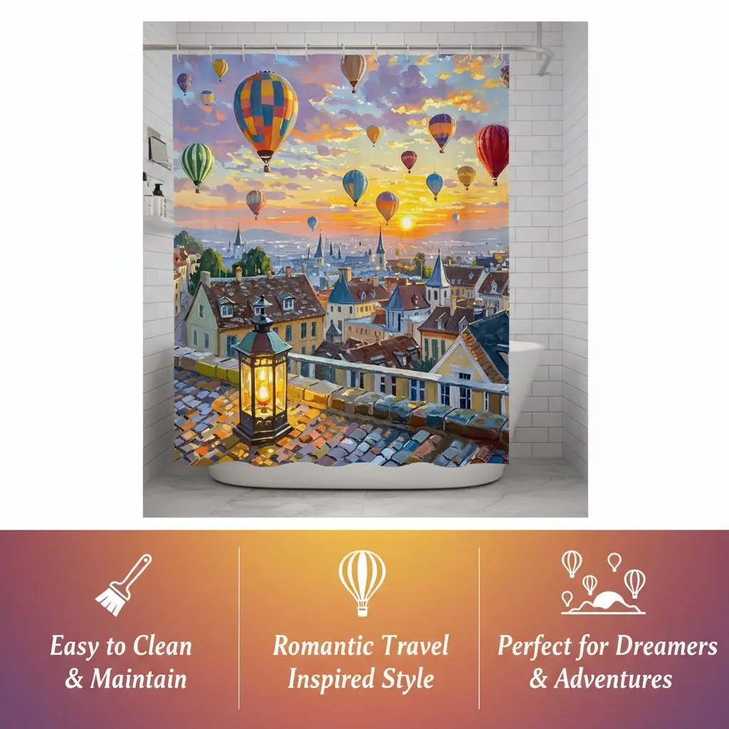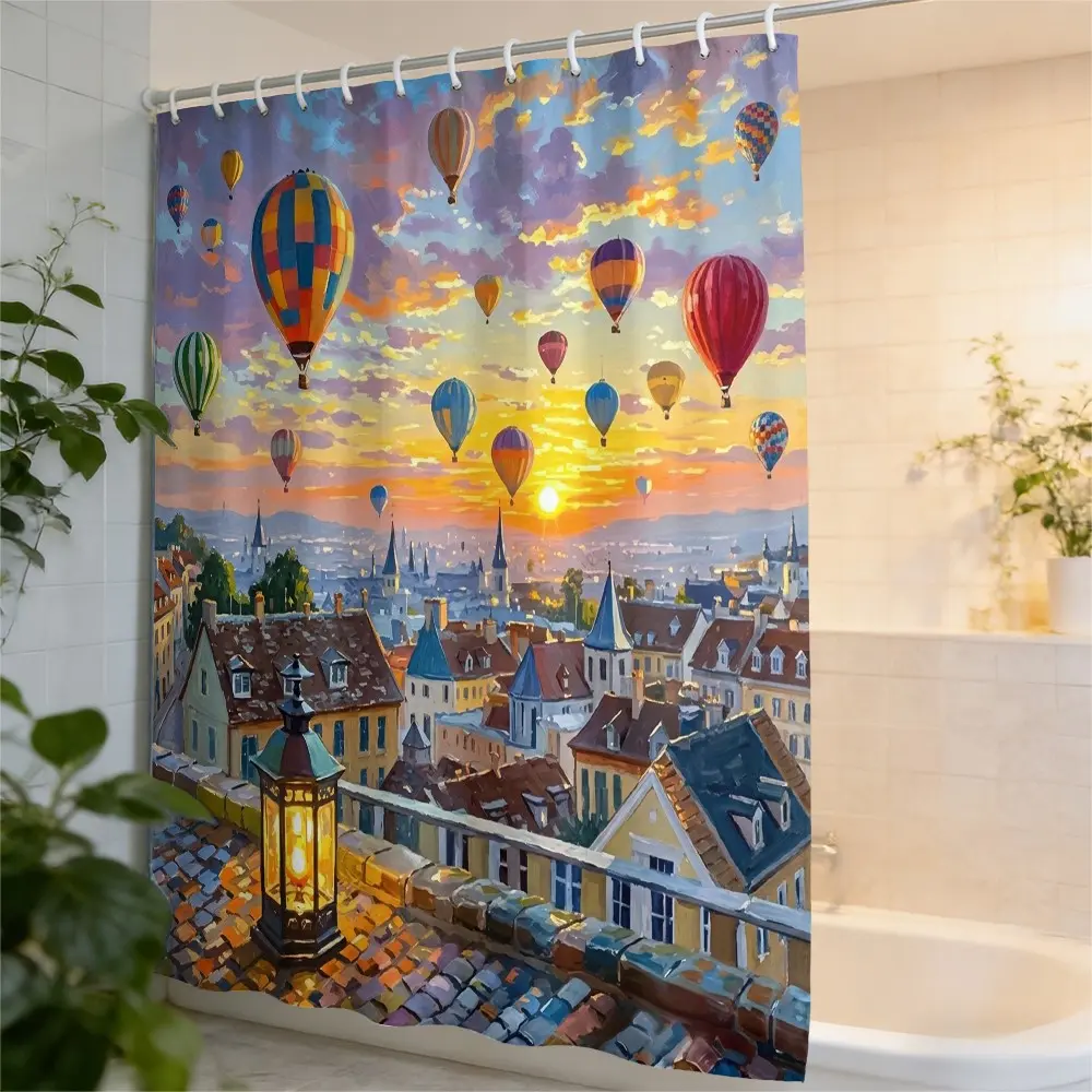 Vintage Hot Air Balloon Bath Curtain, Dreamy European Town Design, Soft Polyester, High-Definition Print, Romantic Bathroom Decor
