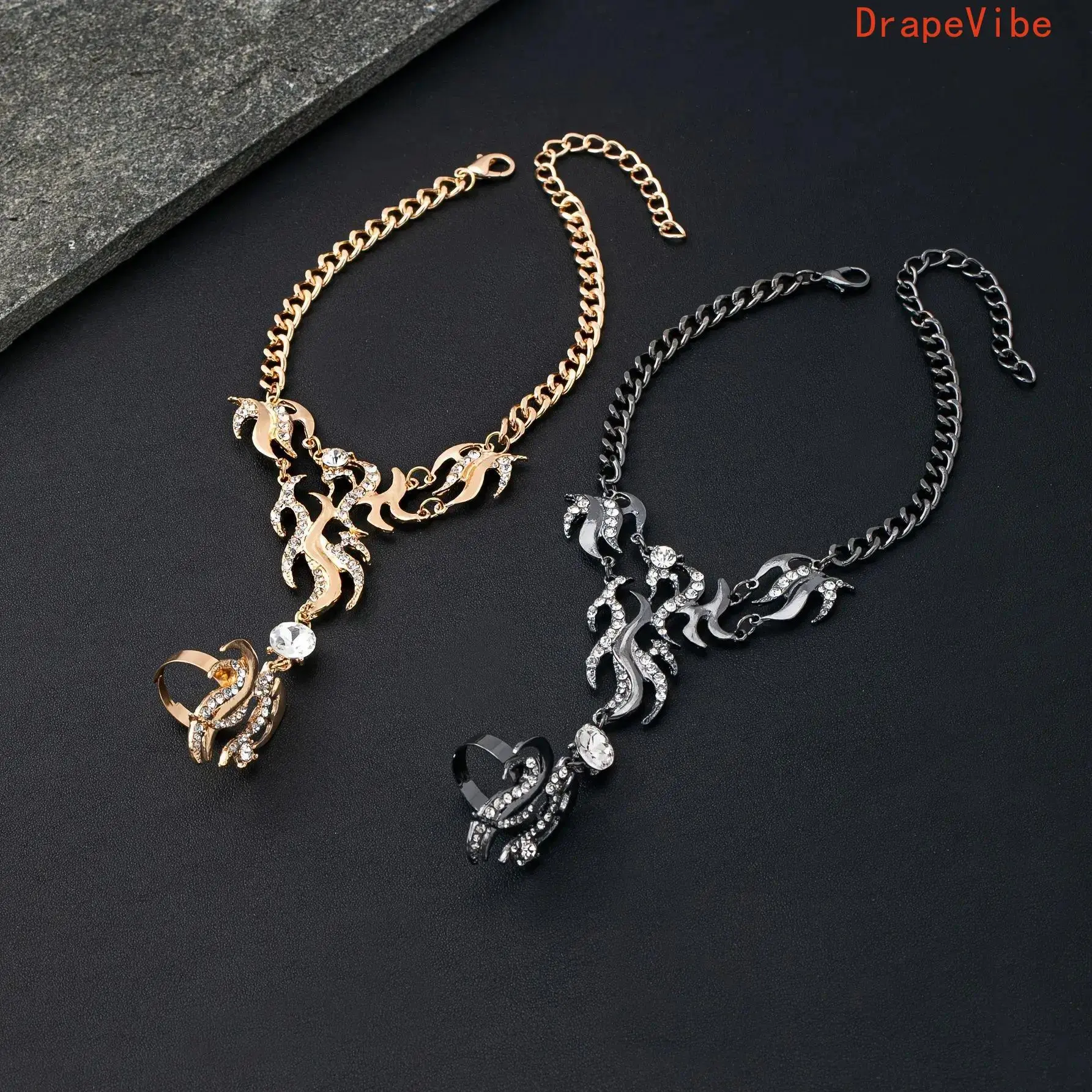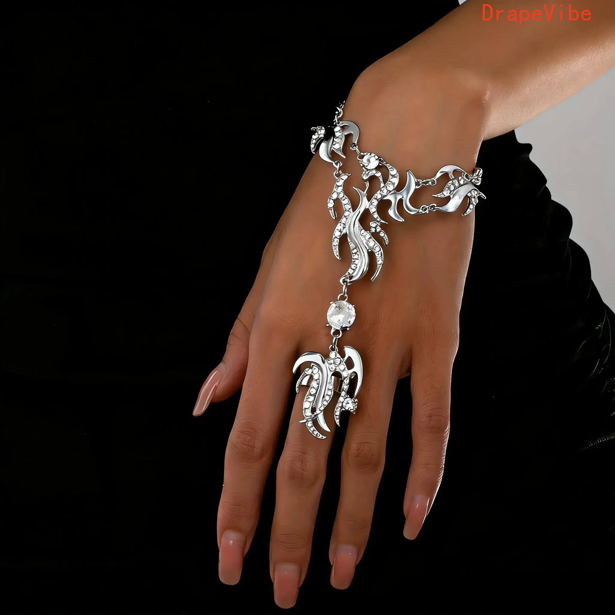 European and American Fashion Design Bohemian Style Niche: This hand-back chain finger connector is a versatile women's hand accessory. It combines European and American fashion designs, offering a unique bohemian style. Perfect for adding a niche touch to your outfit. Versatile and Stylish Women's Hand Accessory: The accessory is designed for women, making it a versatile addition to any wardrobe. It can be used in various settings, from casual outings to more stylish events. Enhance your look with this fashionable piece. Product Details Product Code: 372. This hand-back chain finger connector is a must-have for those who appreciate European and American fashion designs. It is a niche item that adds a touch of bohemian style to your accessories.