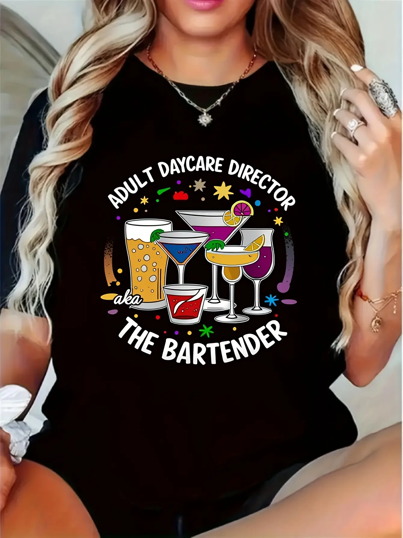Funny Bartender T-Shirt - Adult Daycare Director & The Bartender Cocktail Party Graphic Tee - Women's Black Crewneck Shirt - Soft Breathable Loose Fit Top for Bartenders, Waitresses, Party Outfit