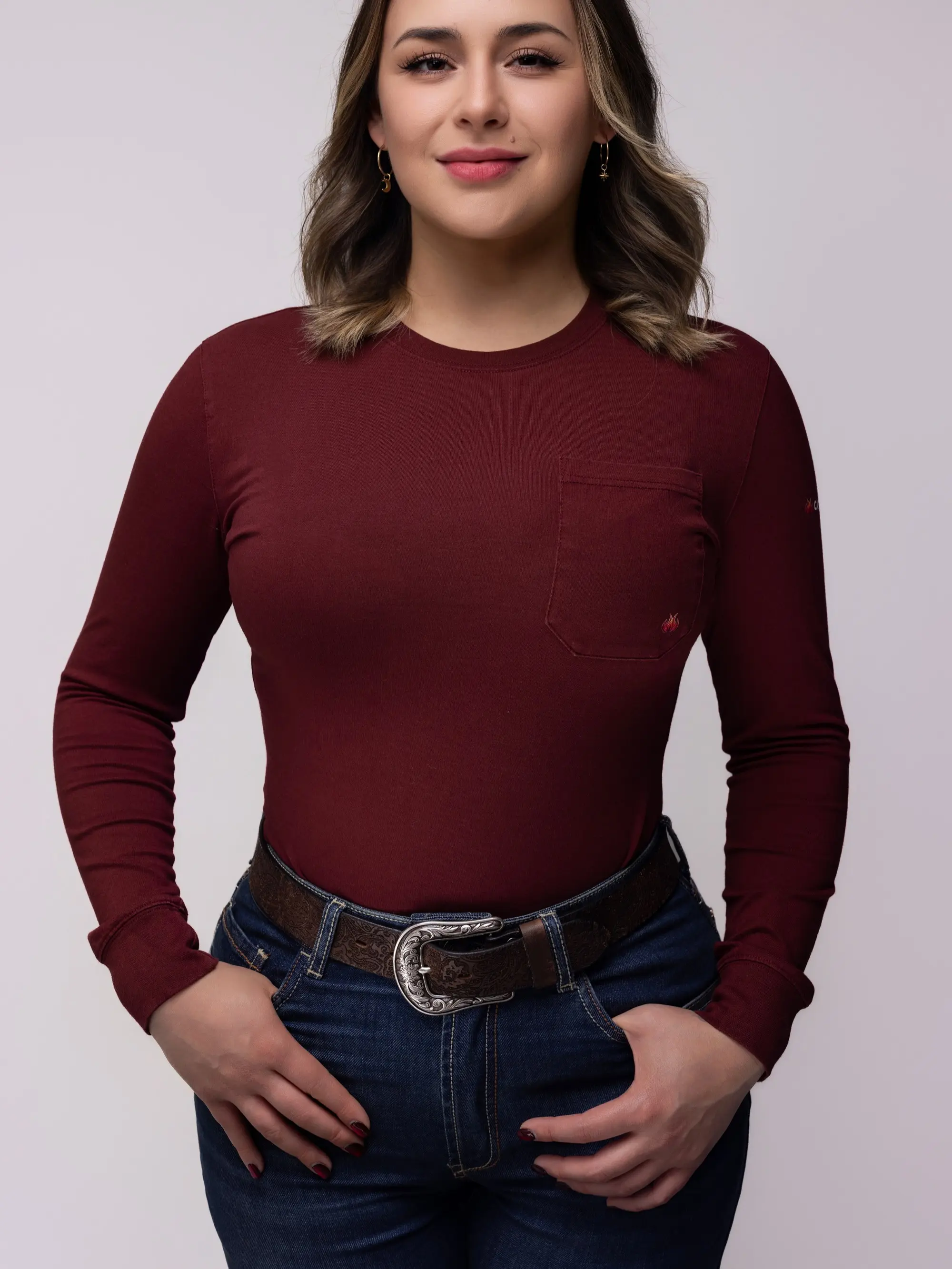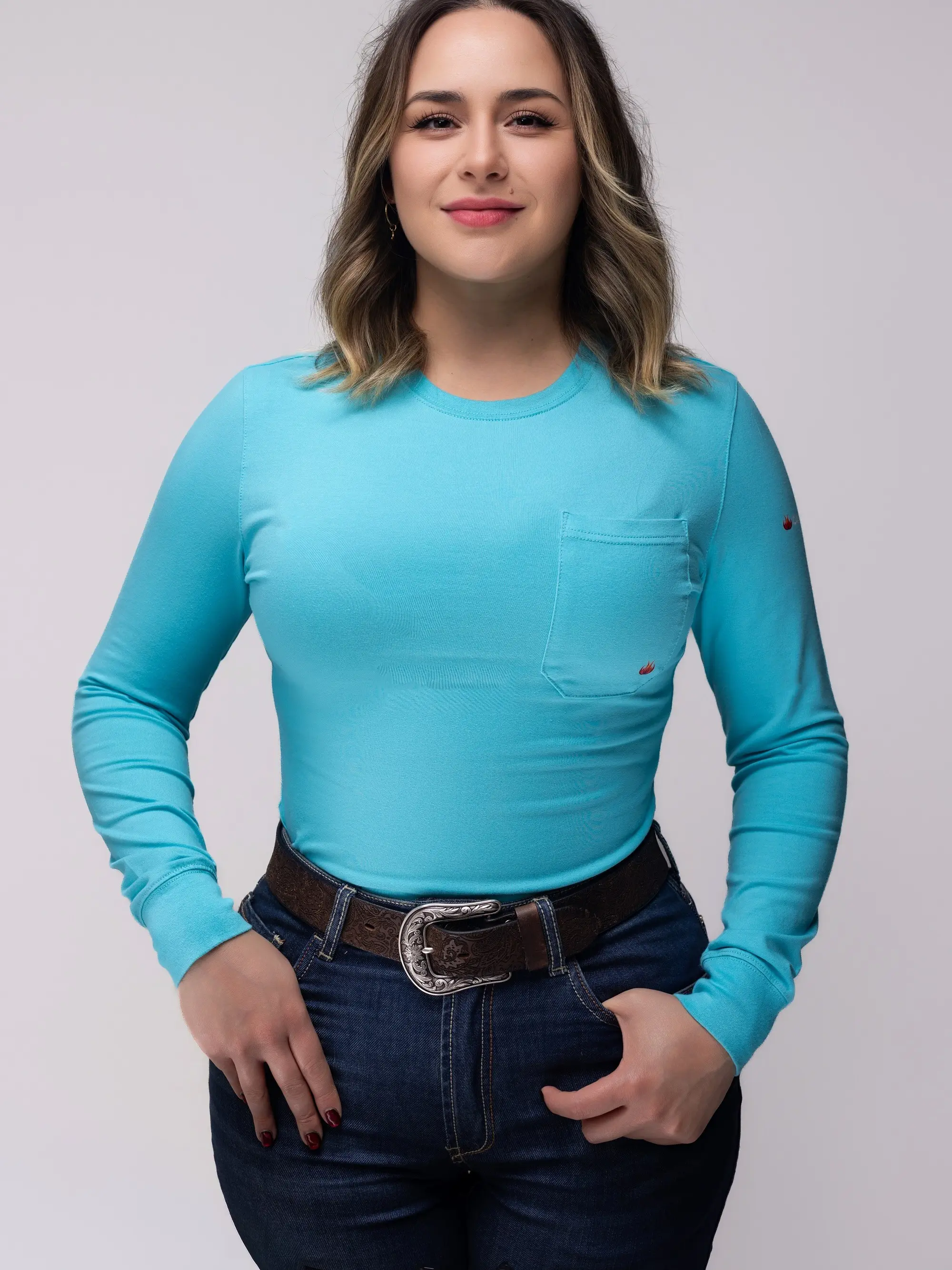 This Women’s Flame Resistant (FR) Long Sleeve Work Shirt was designed specifically for women in refineries, welding, oilfield, and industrial environments — not just resized men’s gear.