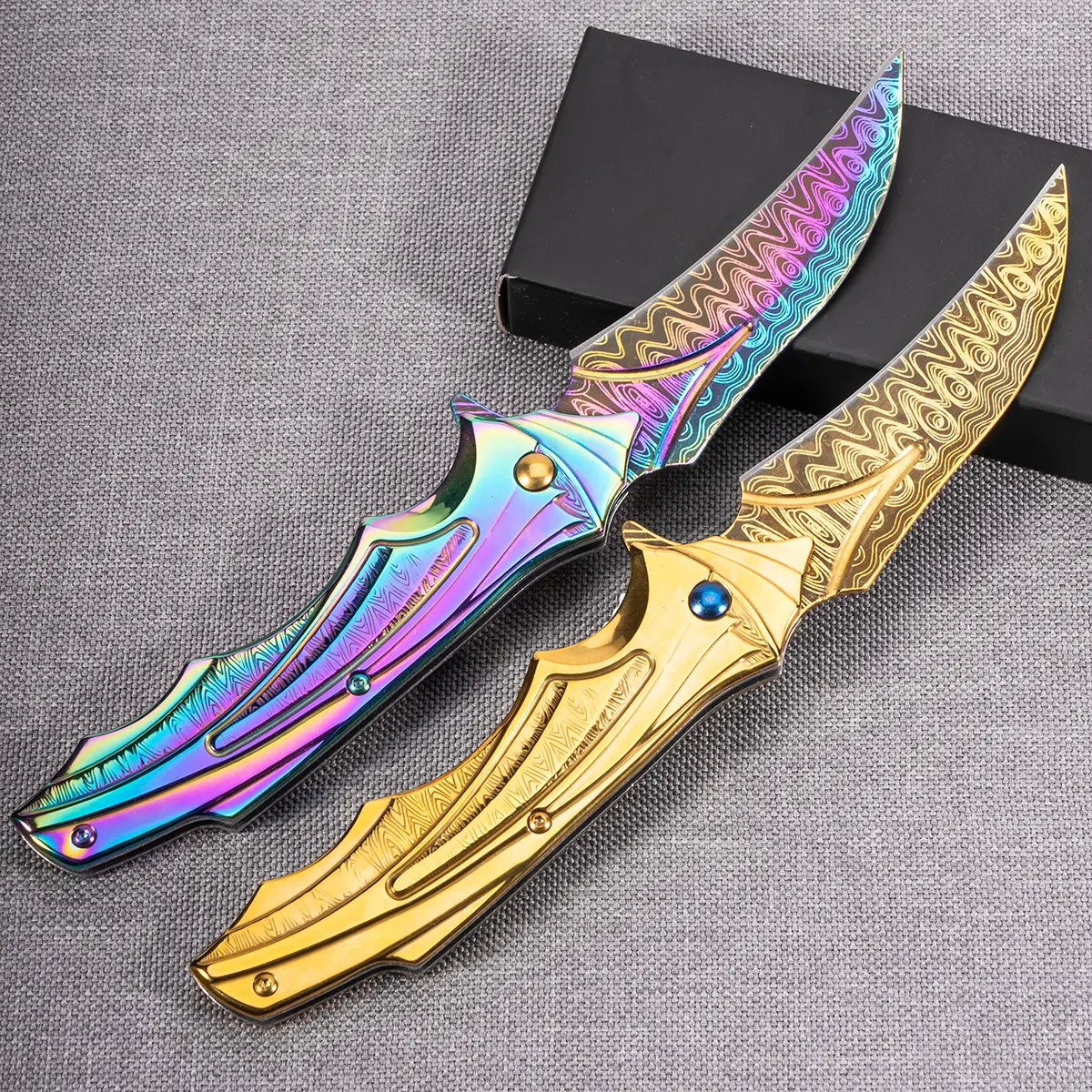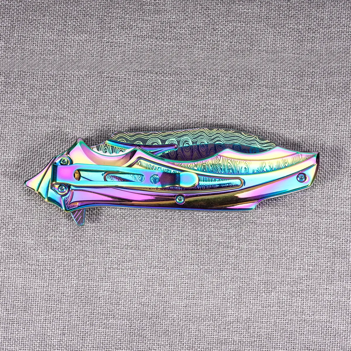 Vibrant Rainbow/Gold Damascus Folding Knife, Perfect for Hiking Camping & EDC