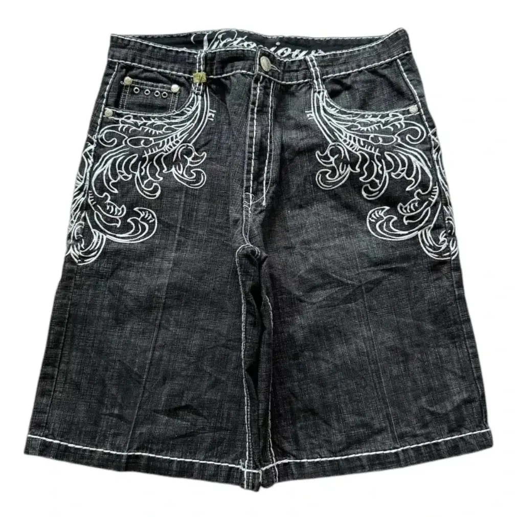These American vintage denim shorts feature a unique embroidery pattern that adds a distinctive and stylish touch to your casual look. The classic baggy fit pairs well with various outfits, making them perfect for a street fashion-inspired wardrobe.