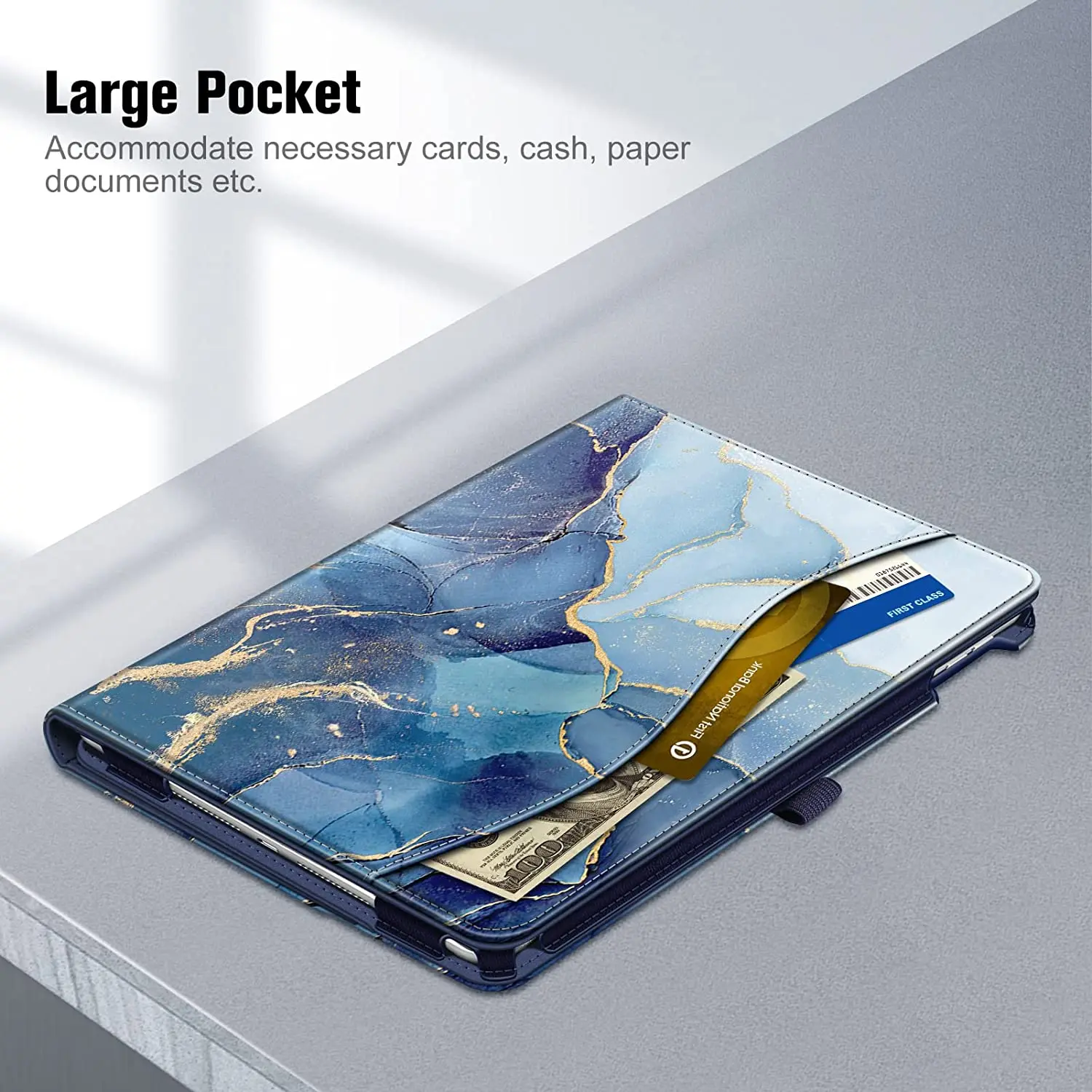 ·This case allows you to adjust the iPad to multiple angles securely. Document Card Pocket is designed for you to store your business cards, bank cards, notes or bills while on the go.