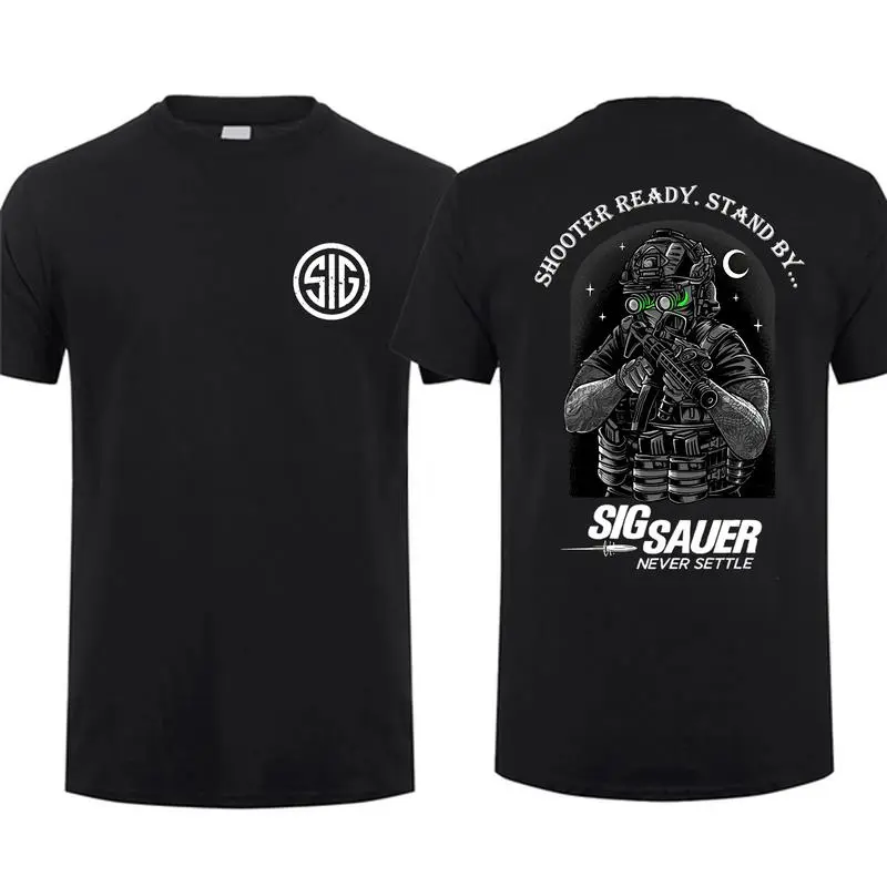Features a striking "Shooter Ready, Stand By" tactical operator graphic on the back, paired with a classic Sig Sauer logo on the chest.The bold, high-quality print blends vintage tactical style with modern streetwear vibes, letting you wear your passion loud and proud.