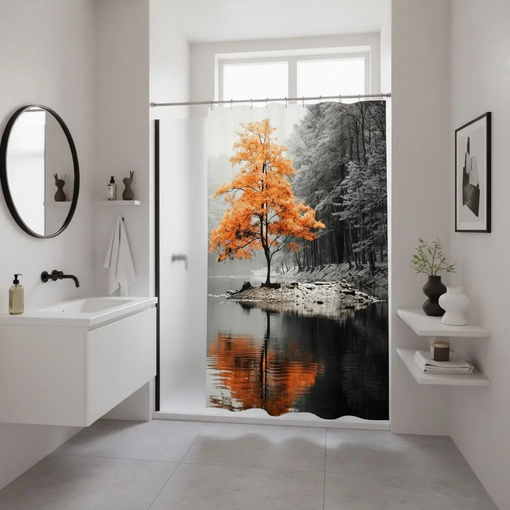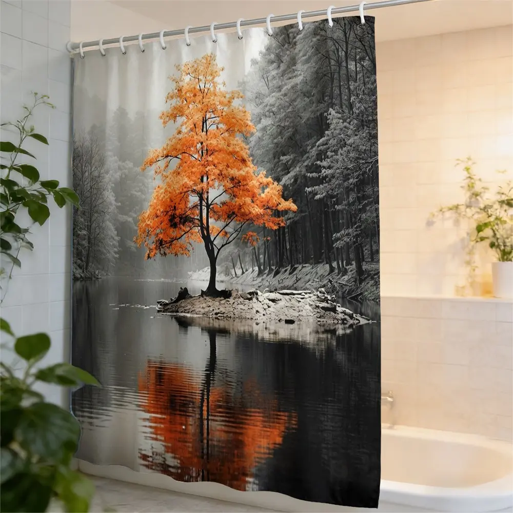 1pc Lonely Tree Bath Curtain, Minimalist Artistic Landscape, Soft Polyester, High Clarity Digital Print, Home Hotel Bathroom Decor