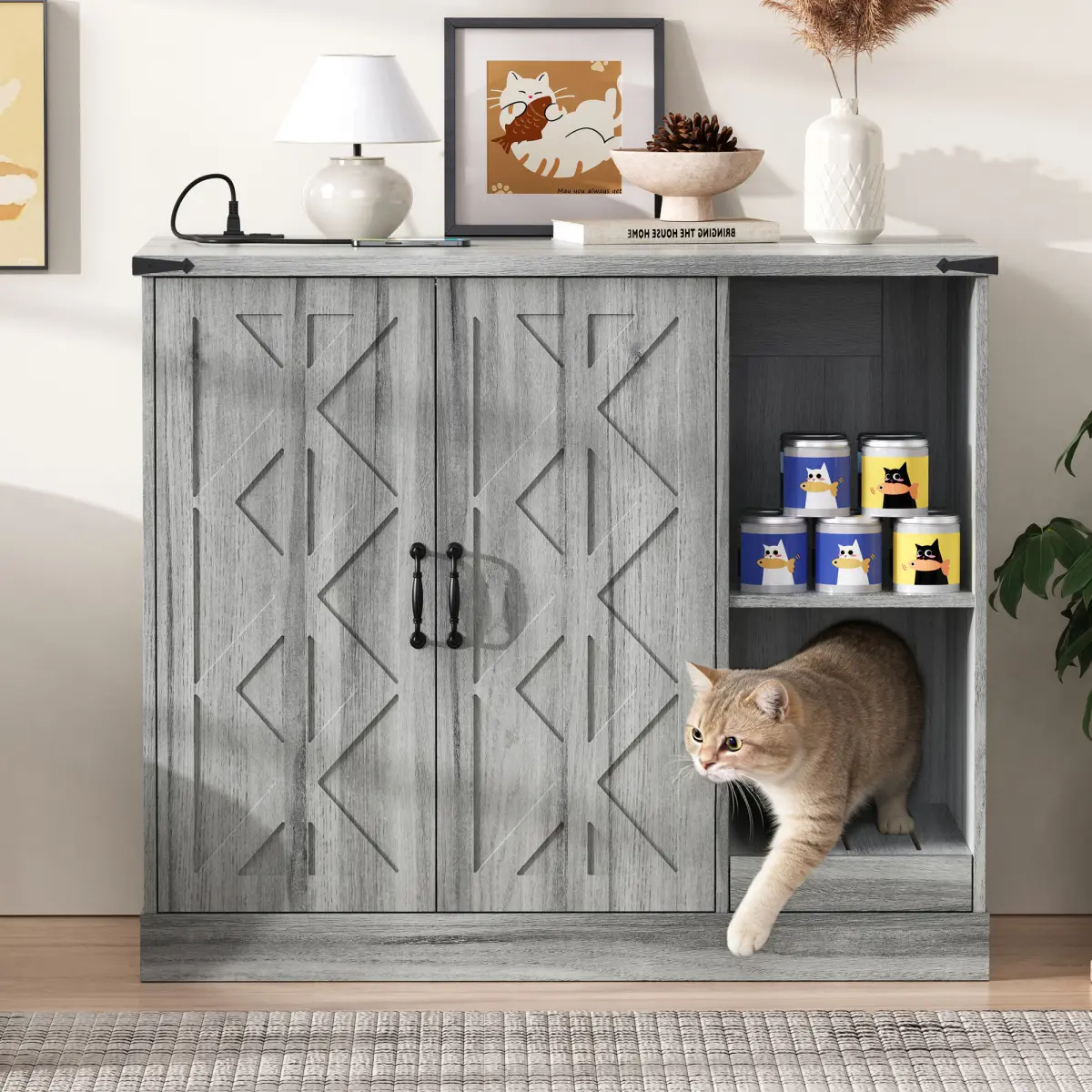 ·Modern & Stylish Design: This sleek, contemporary cat litter box cabinet features a sophisticated geometric pattern on the doors, blending seamlessly into any home decor.The neutral grey wood finish offers a minimalist look while providing practical functionality for your pet.