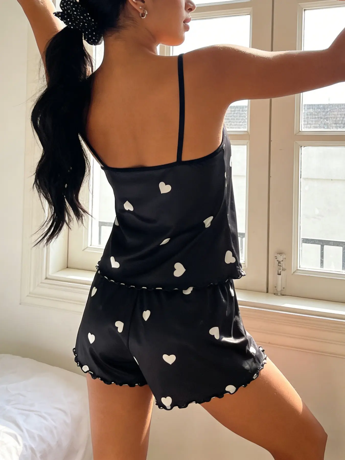 Heart Print Pajama Set, Wave Edge Design, Soft Comfortable Home Sleepwear, Breathable Two-Piece for All Seasons