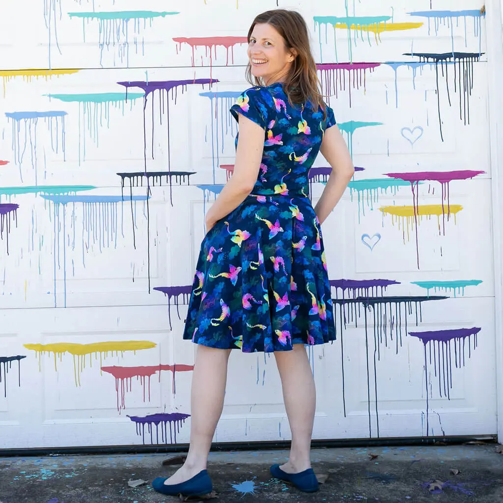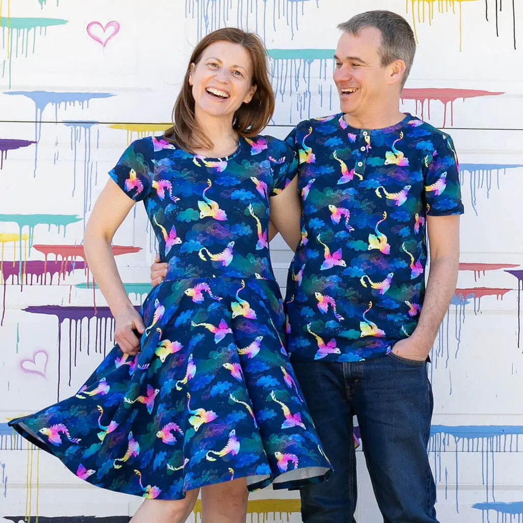 ·A blue-dark night sky speckled with stars, peeping through storm clouds and swirls of rainbow dust...coasting upward on the breezes, amphiptere dragons soar on watercolor sunset wings, their large eyes gently searching, seeking. On lightweight 95% cotton, 5% spandex with deep side pockets and a twirly skirt so you can float as carefree as the amphipteres.