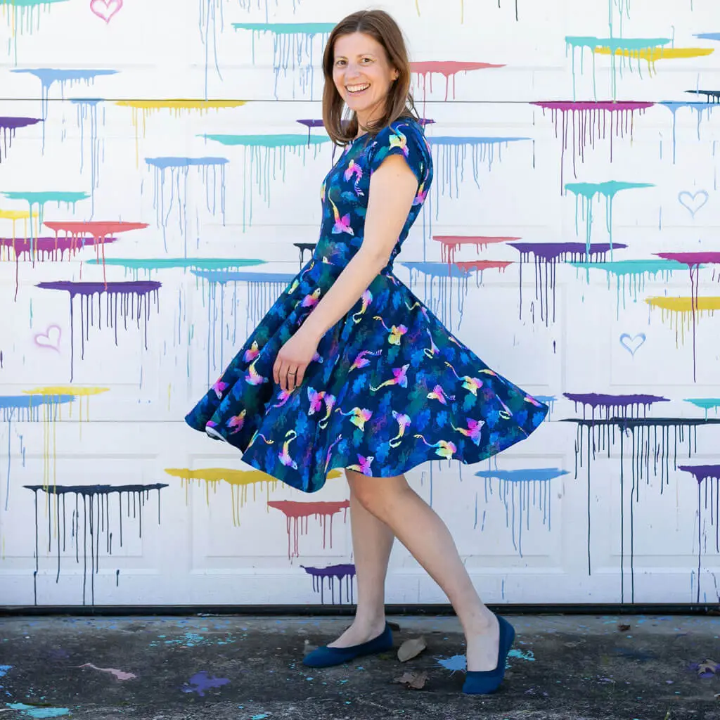 ·95% cotton, 5% spandexDeep side pocketsShort sleeve dress with a knee-length twirly skirt