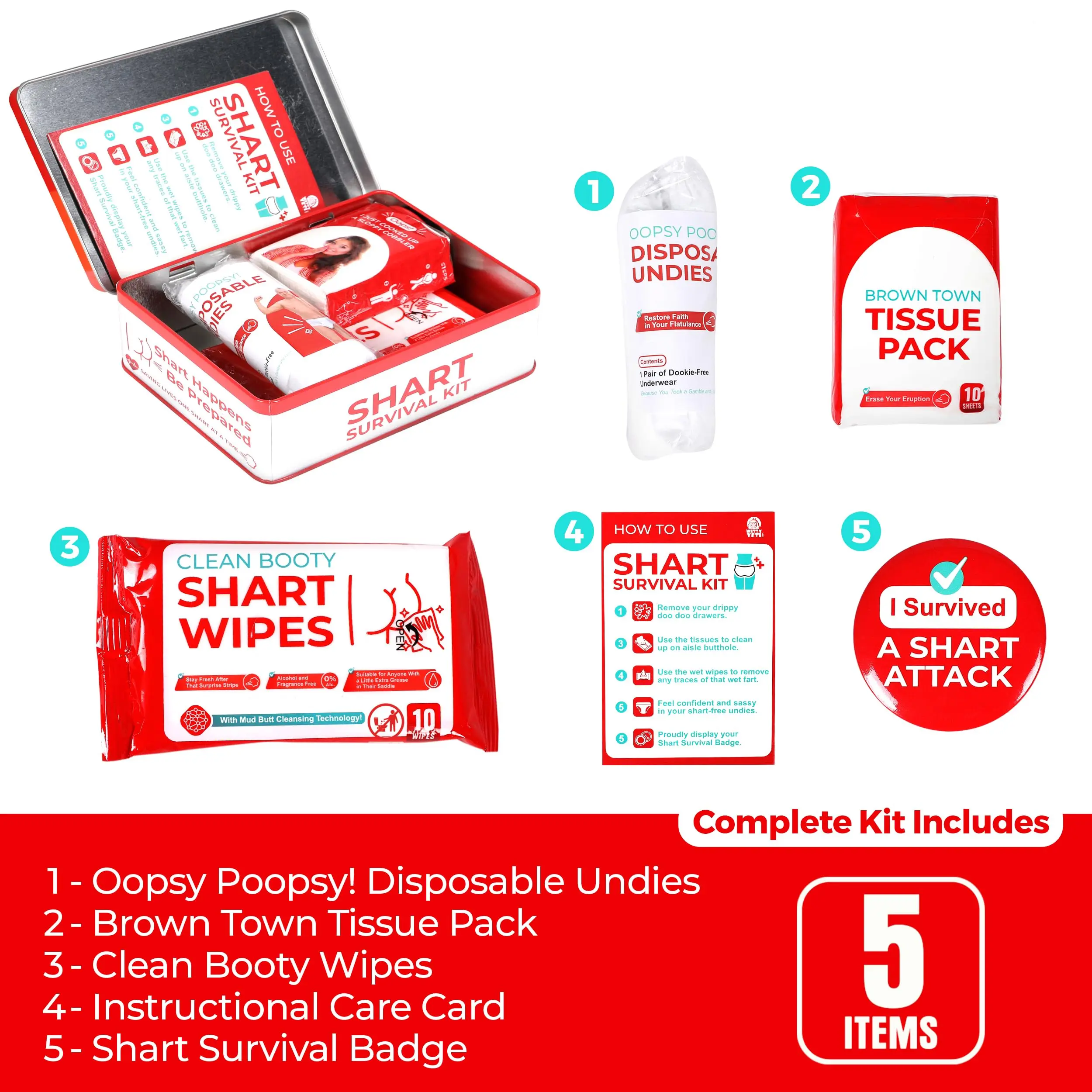 ·Complete joke kit includes tissues moist towelettes disposable underwear and a humorous survival badge for maximum prank impact