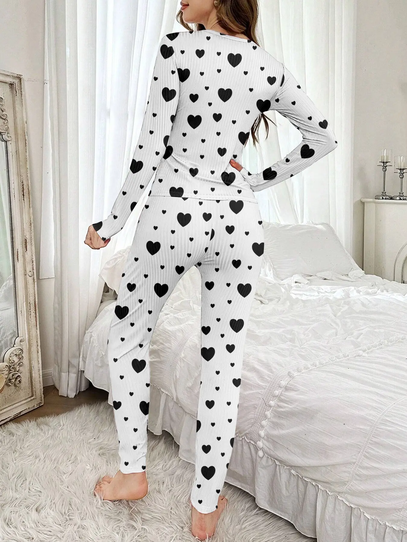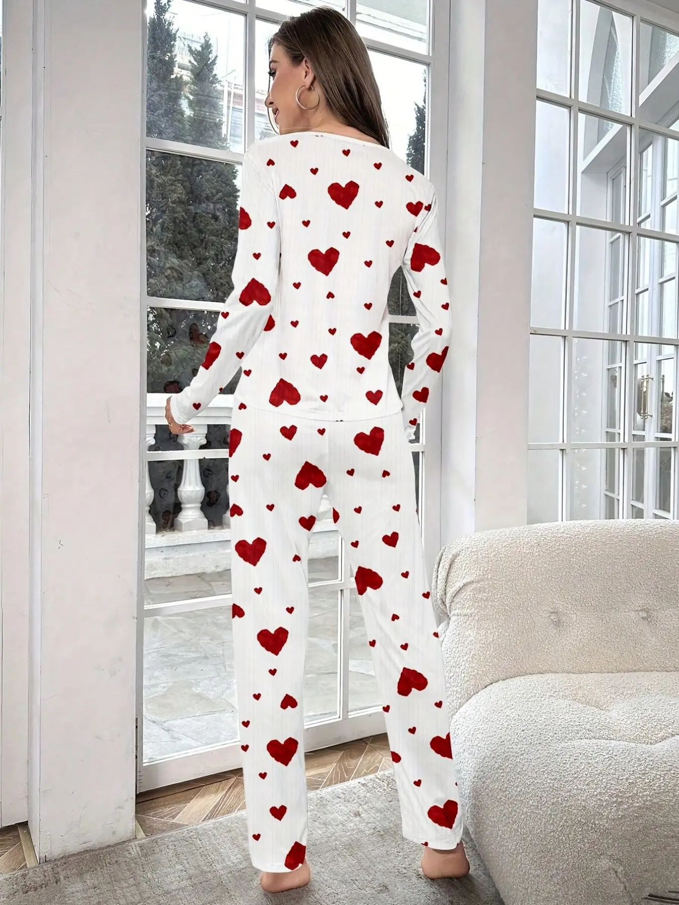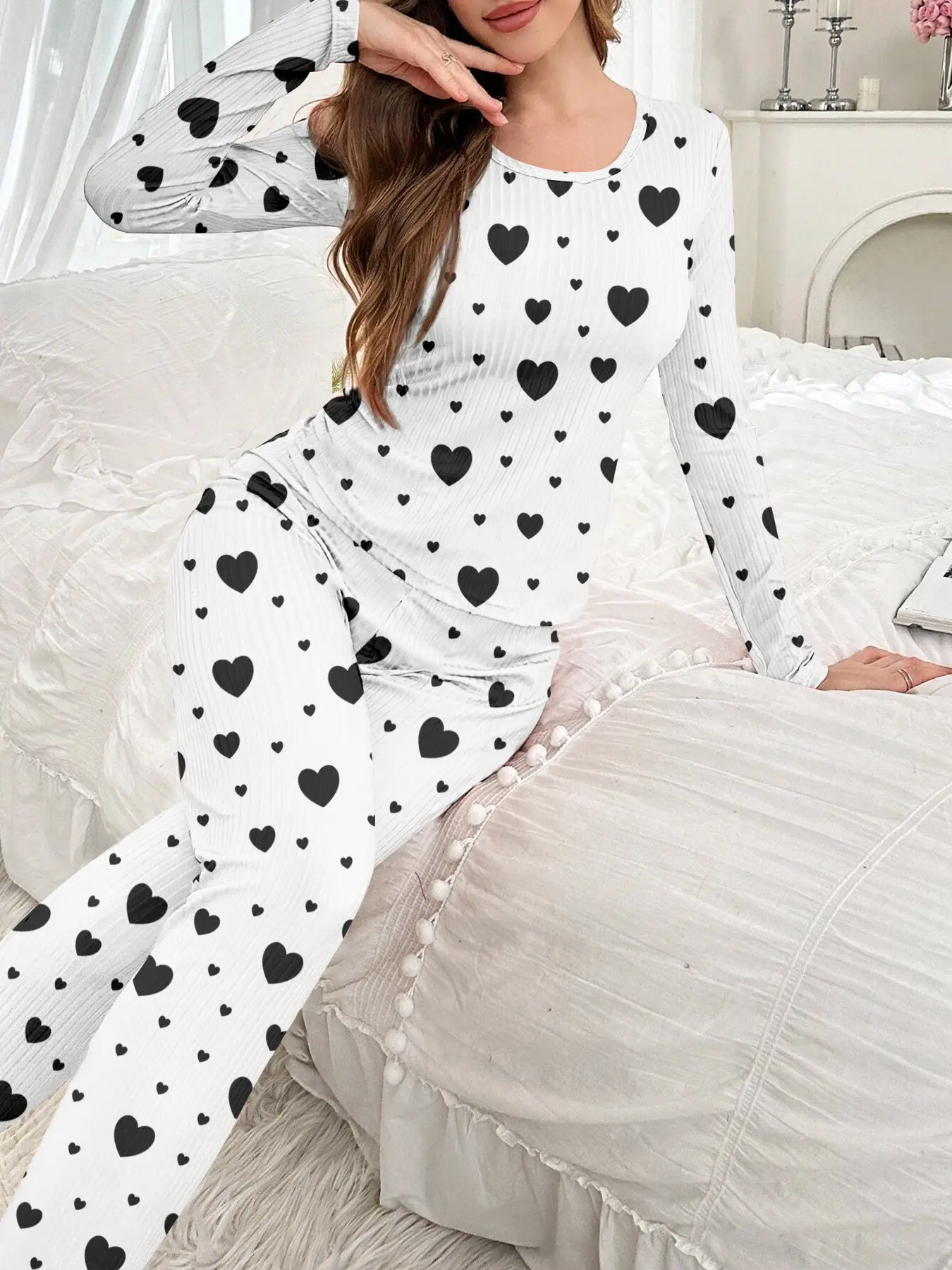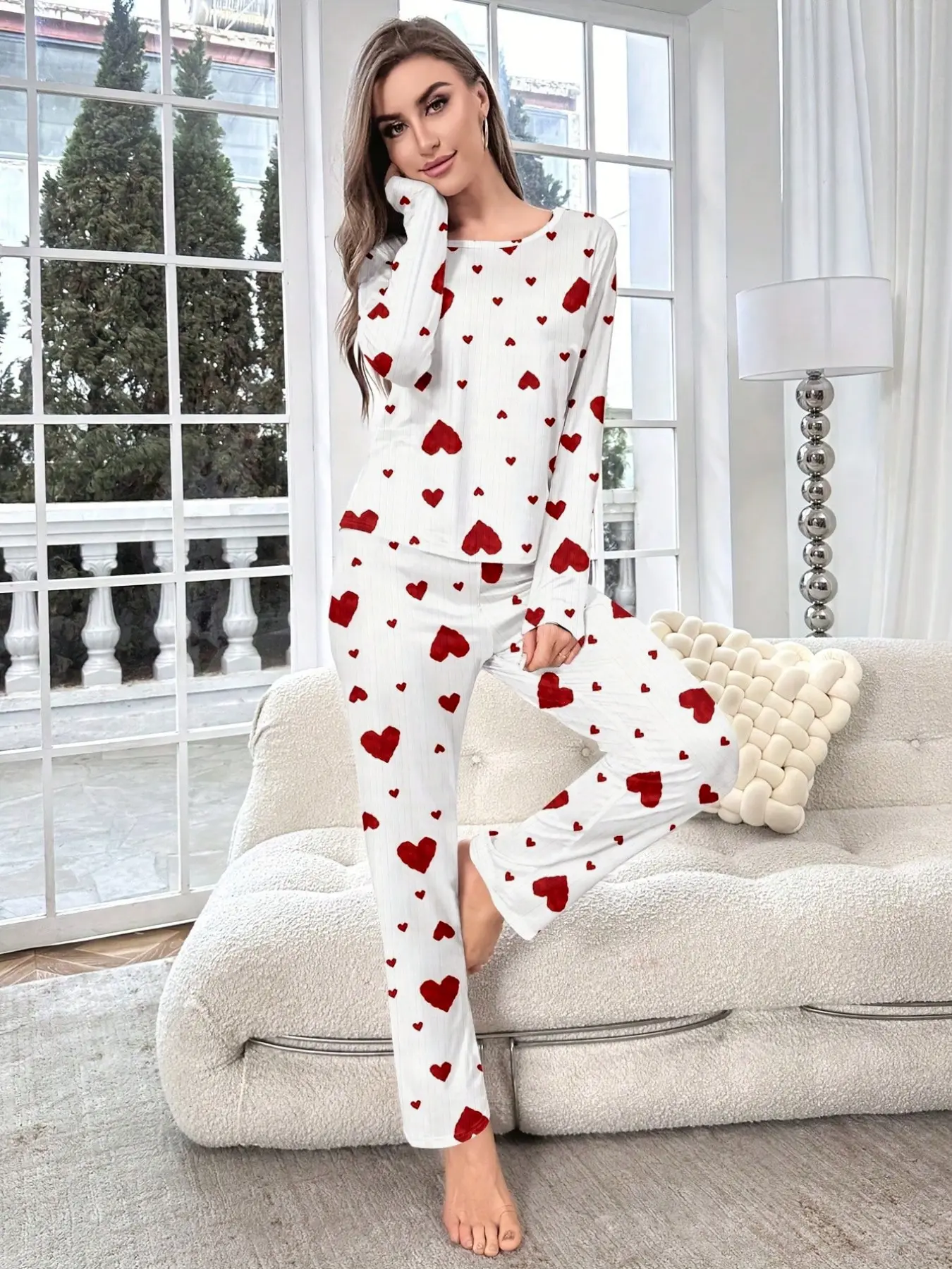 Women's Sleepwear Set, Casual Round Neck Long Sleeve Pants, Romantic Heart Print, Soft Elegant Comfortable, Wearable at Home