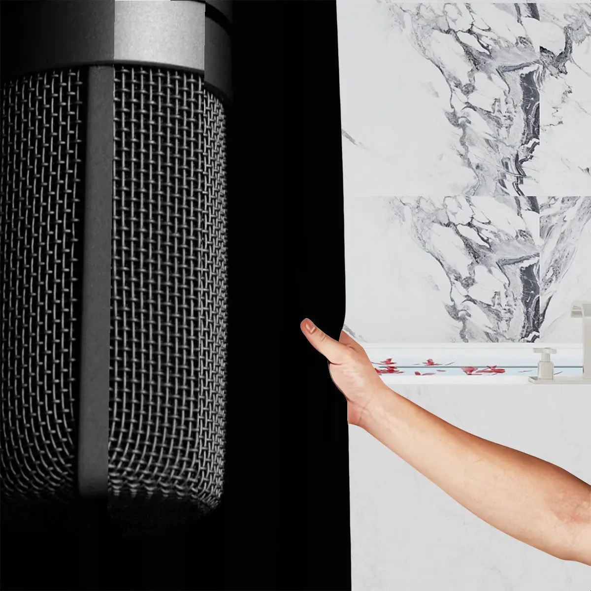 A bold, studio-inspired shower curtain that brings the low-light drama of a recording booth into your bathroom. Deep blacks and textured mesh details create a tactile, cinematic look—like a close-up of a microphone or speaker grille frozen in midnight tones. It absorbs attention without shouting, giving a minimalist, musician-ready space a quiet focal point. Hang it to channel late-night creativity, to set a moody backdrop for a home studio bathroom, or to add an industrial edge to a modern apartment. The heavyweight polyester drapes cleanly and dries quickly, so the curtain looks sharp day after day.