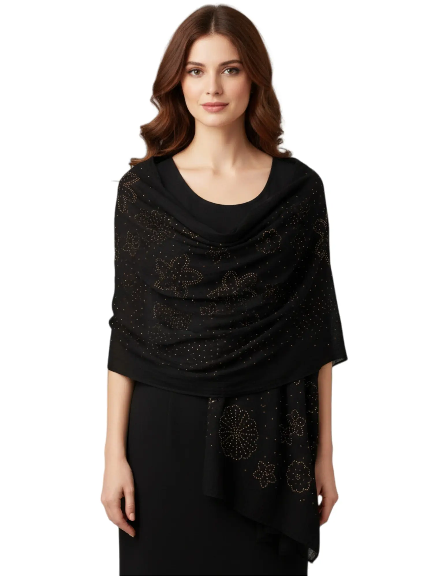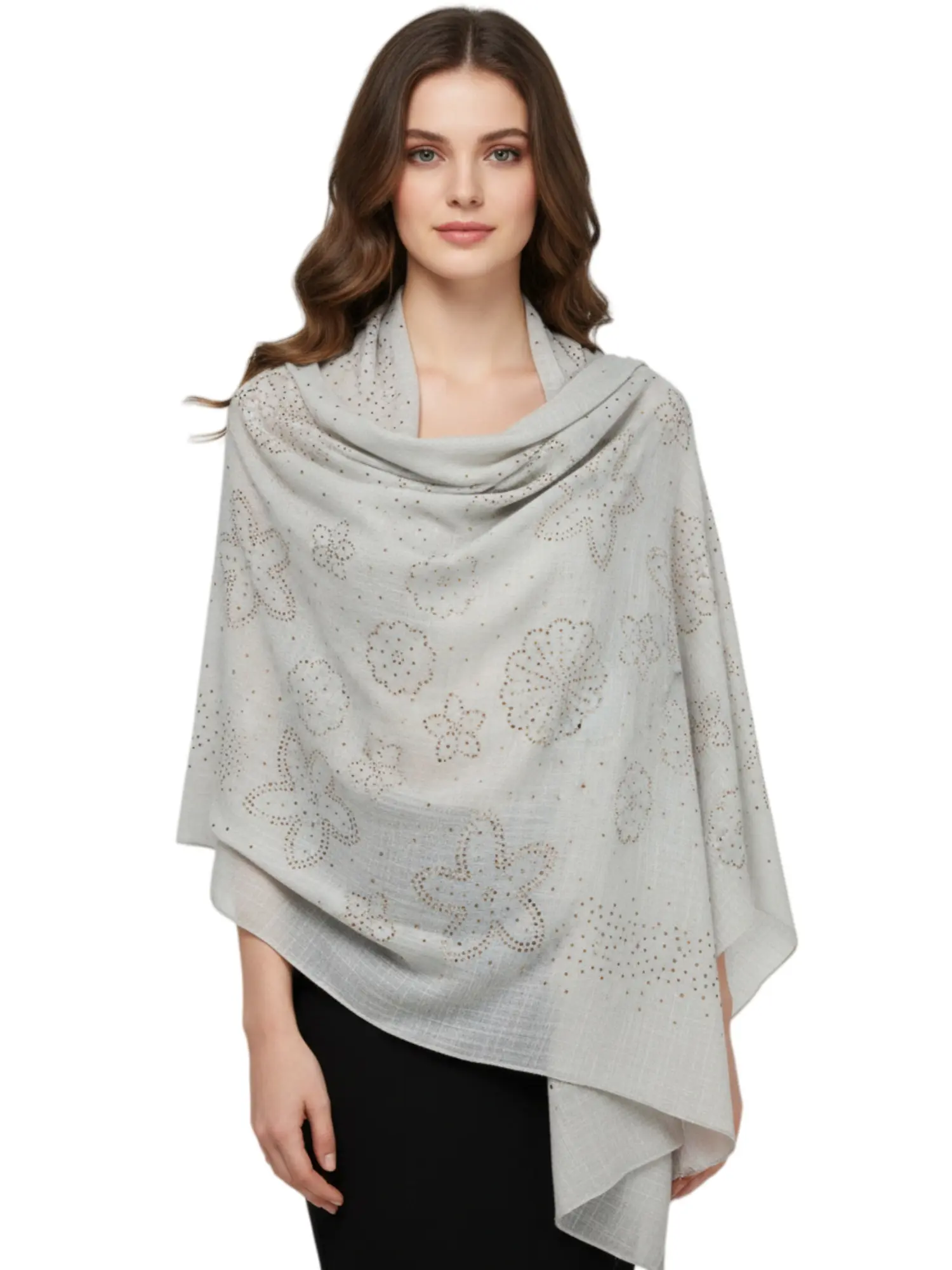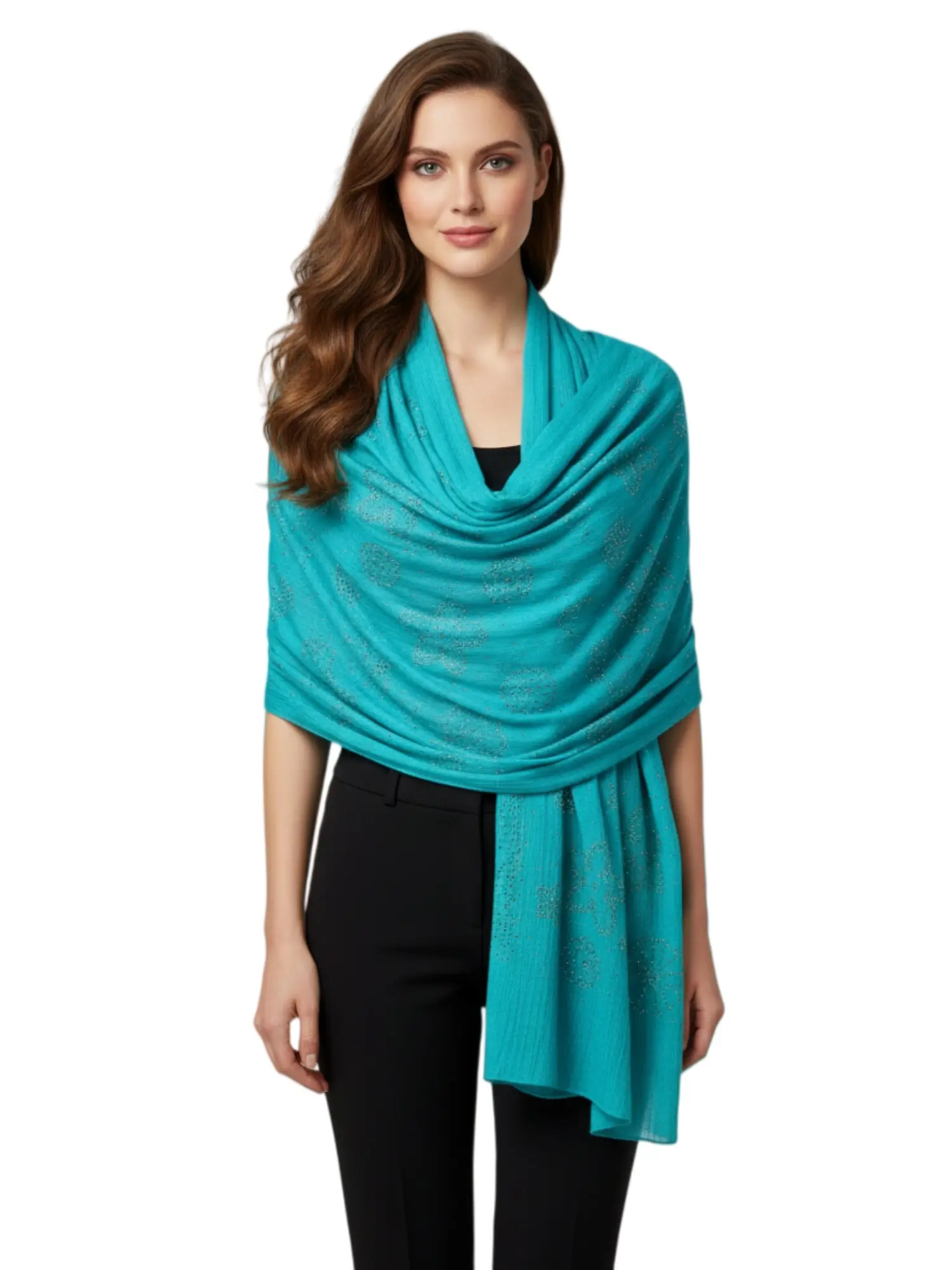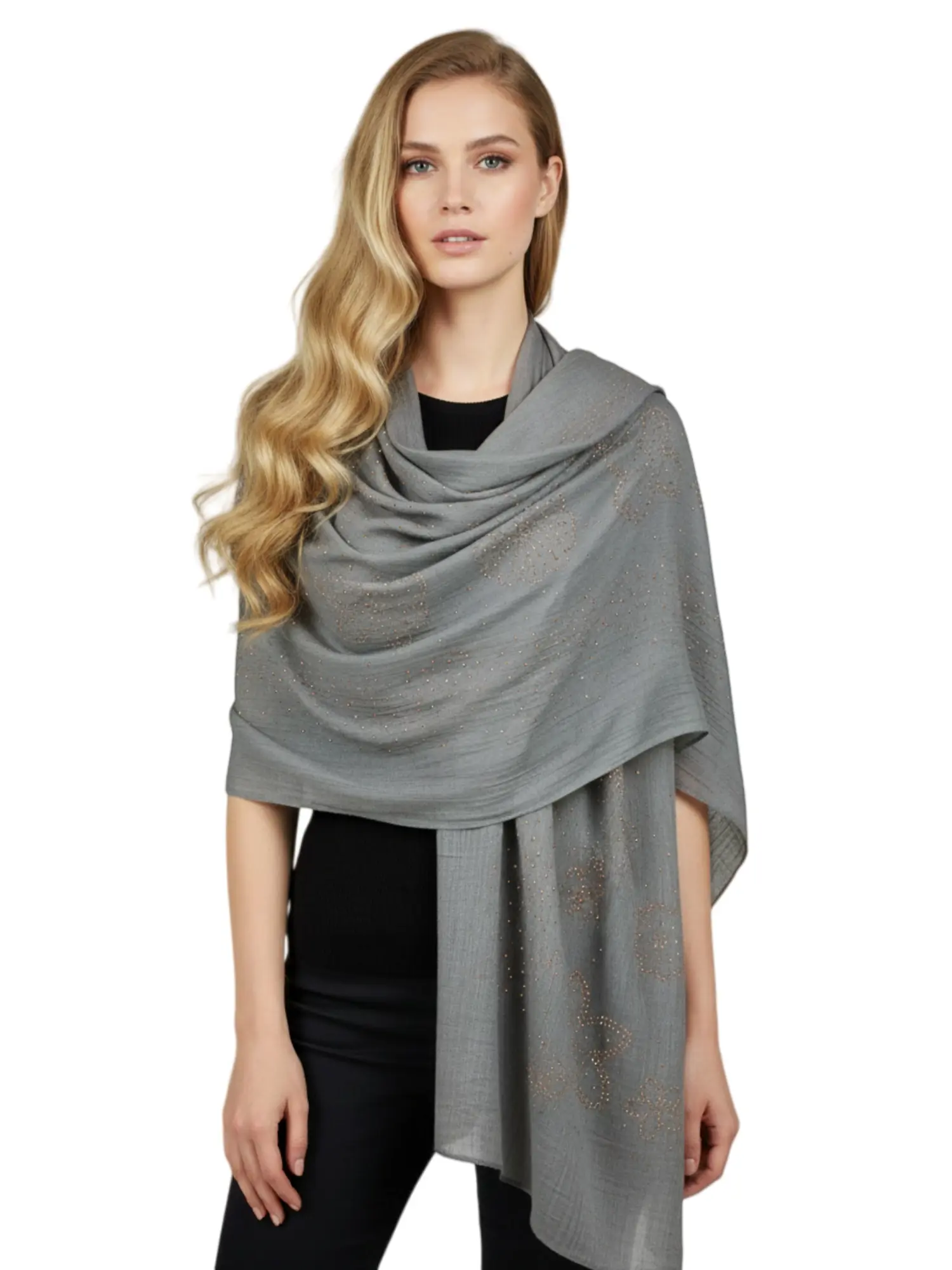 Enhance your wardrobe with this elegant large-size pashmina shawl. Featuring delicate rhinestone accents, this soft and silky lightweight scarf is perfect for weddings, evening events, or as a stylish layering piece for any season. Measuring in a generous size for versatile styling as a wrap or a traditional scarf.