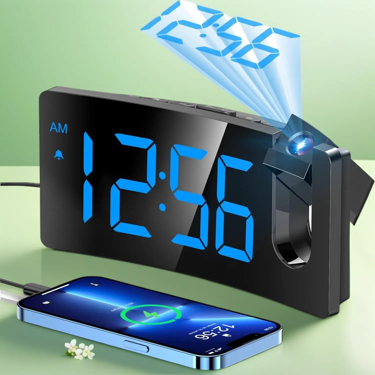 Projection Alarm Clock, Digital Clock with 180° Rotatable Projector, 3-Level Brightness Dimmer, Clear LED Display, USB Charger, Progressive Volume, 9mins Snooze,12/24H, for Bedroom
