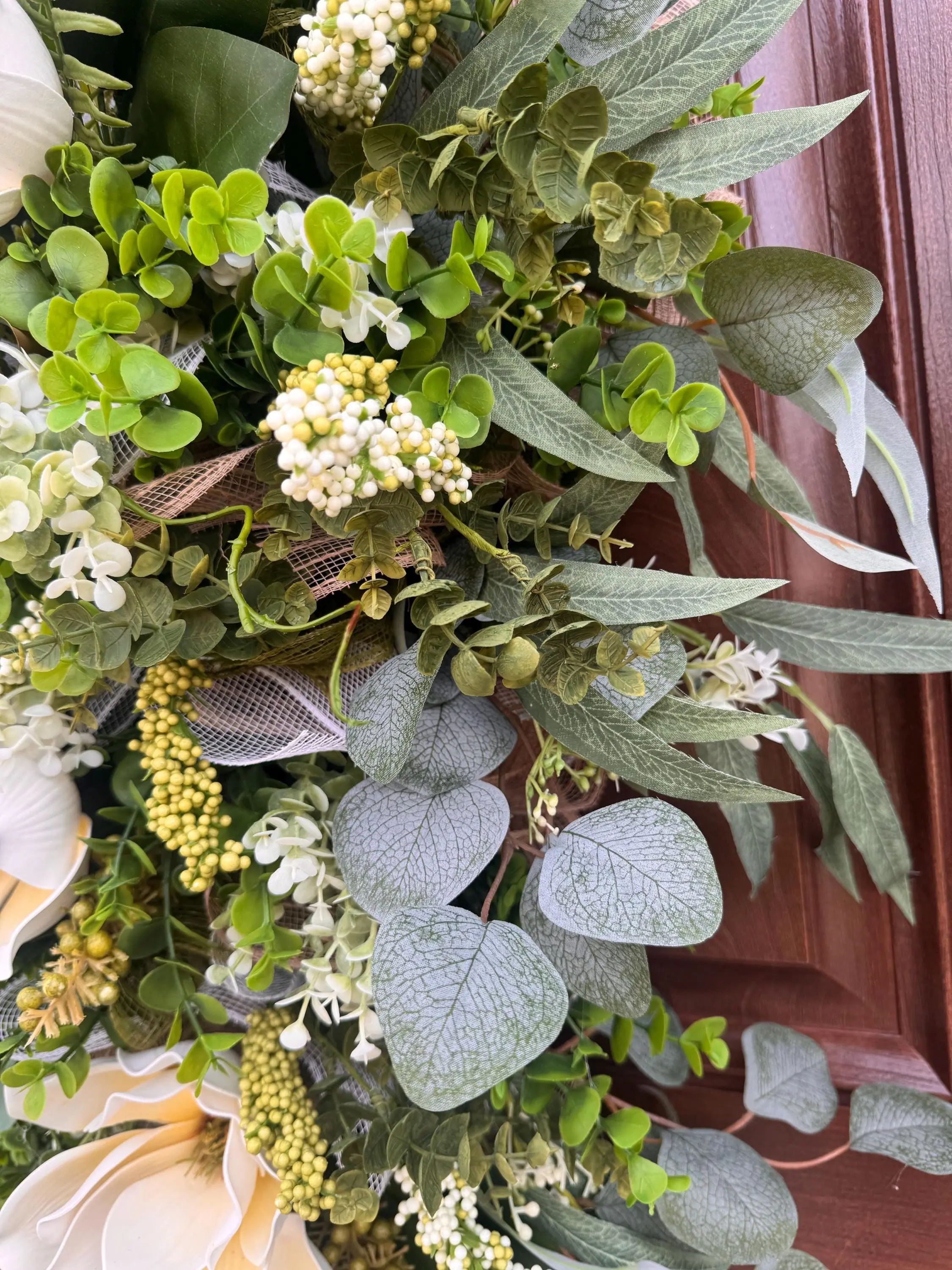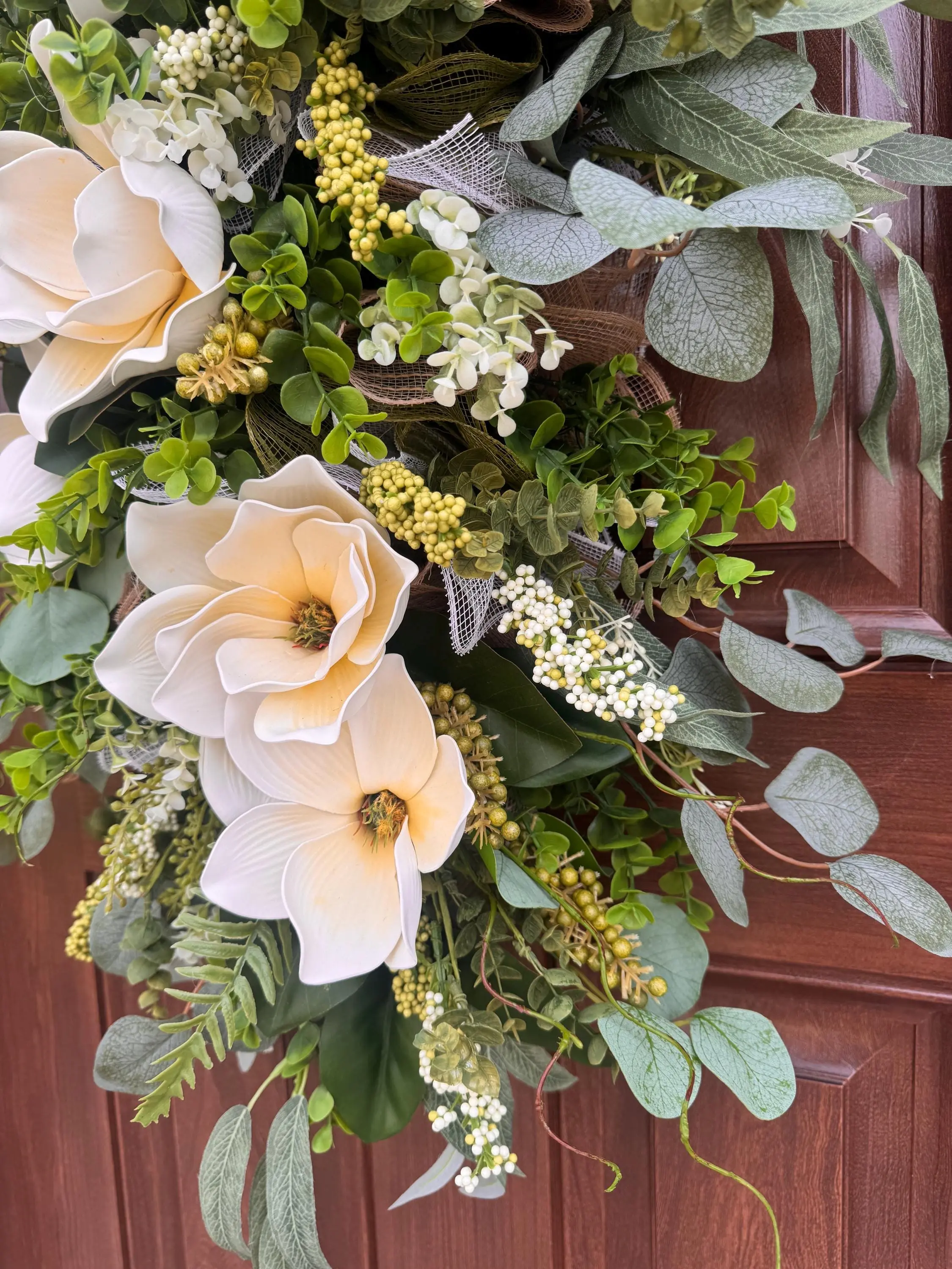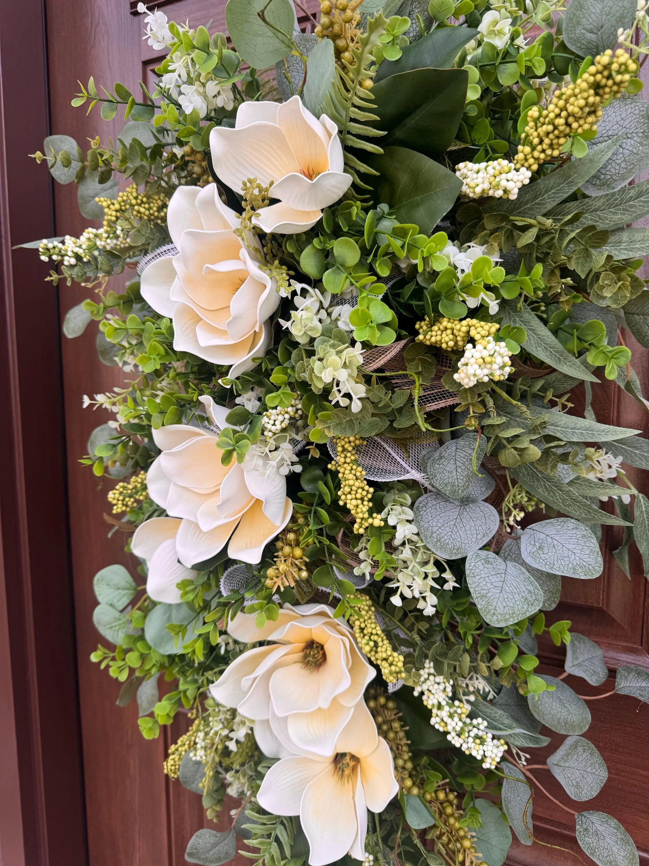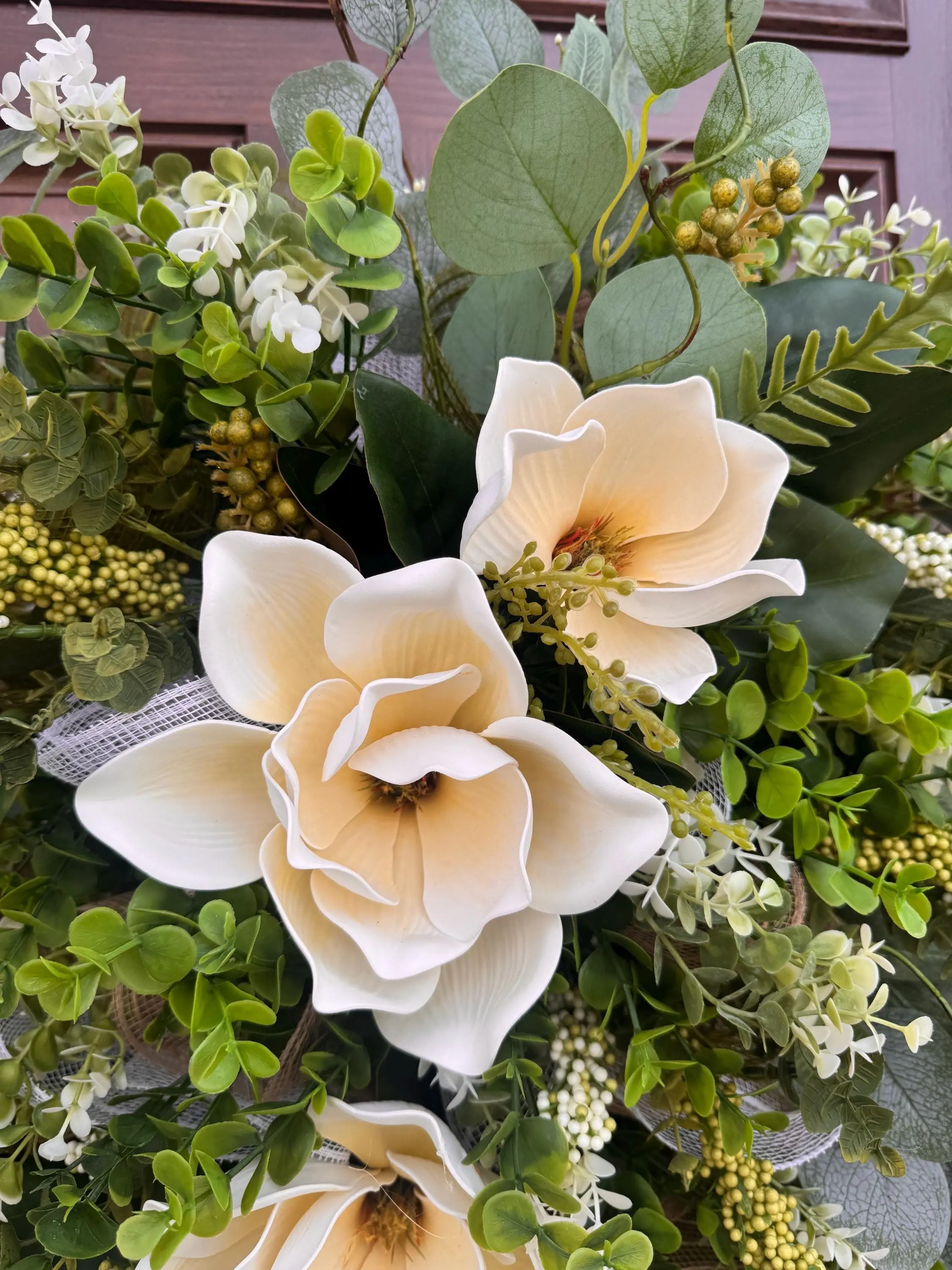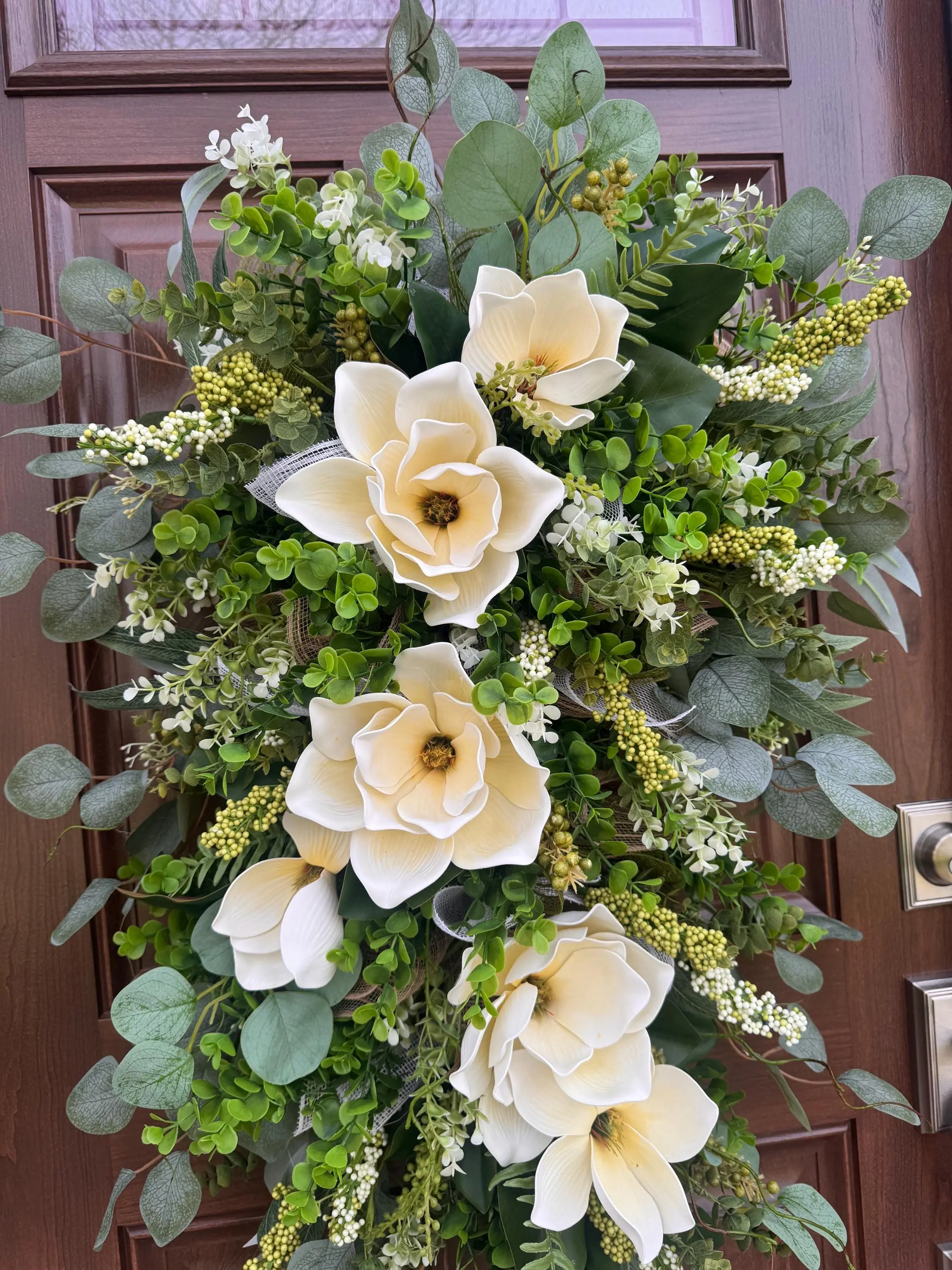 Welcome guests with timeless elegance using this XL Magnolia Door Swag, thoughtfully designed to bring fresh, natural beauty to your home. This handcrafted arrangement showcases soft cream magnolia blooms nestled among lush greenery, eucalyptus leaves, delicate white florals, and textured accents—creating a full, high-end designer look.