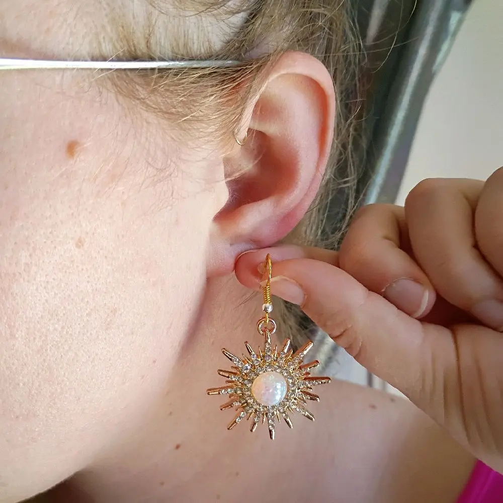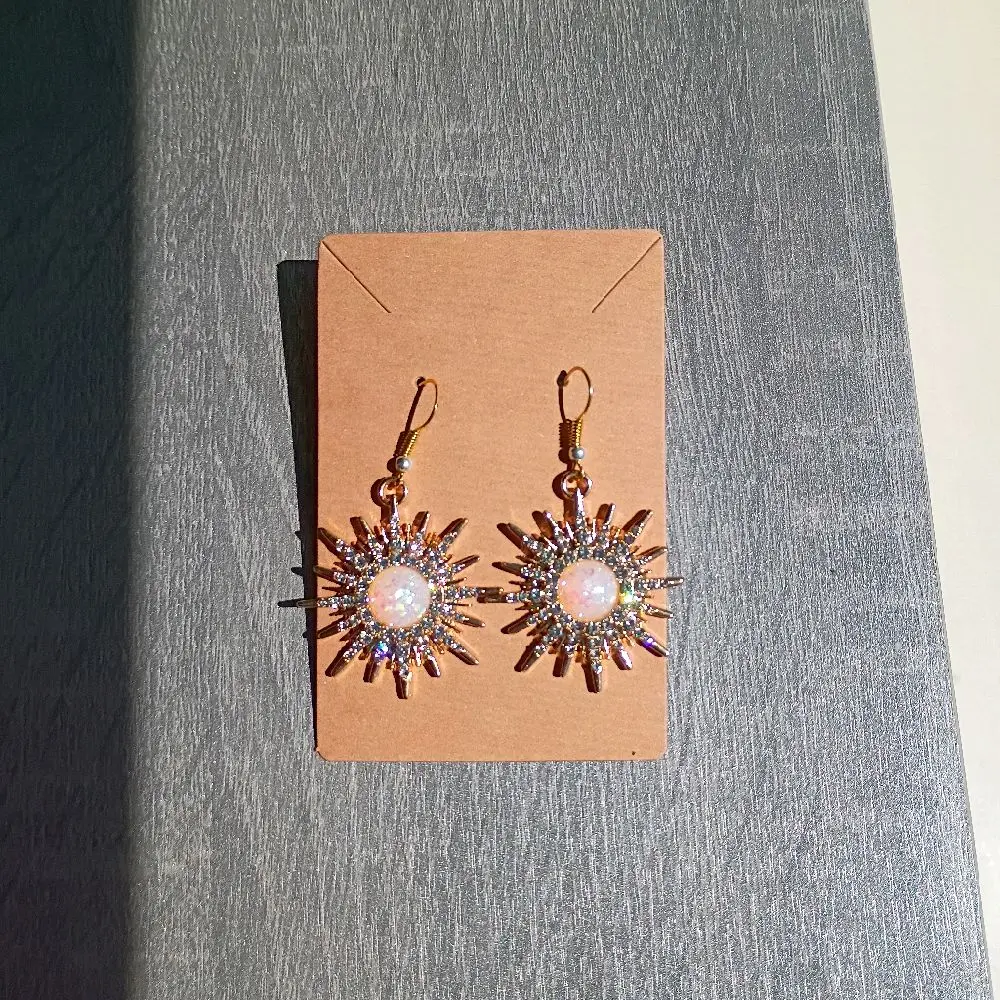 These Starburst Earrings feature a stunning artificial opal center that catches the eye. The unique starburst design adds a touch of glamour to any outfit. The artificial opal center is the focal point, drawing attention by glimmering brightly in the sunlight.