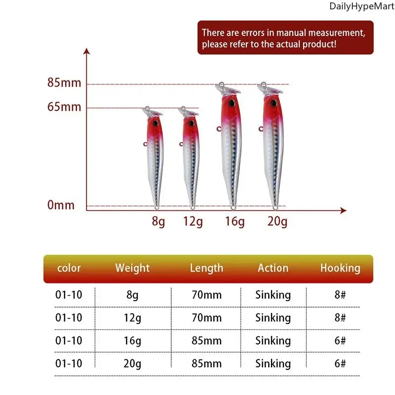 Upgrade your tackle box with these lifelike sinking minnow lures! Available in 4 sizes (8g/70mm, 12g/70mm, 16g/85mm, 20g/85mm) with 8#/6# hooks, these realistic hard baits mimic live bait to attract predatory fish. Perfect for saltwater and freshwater fishing, ideal for bass, trout, and more.