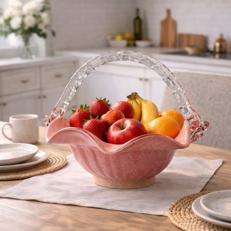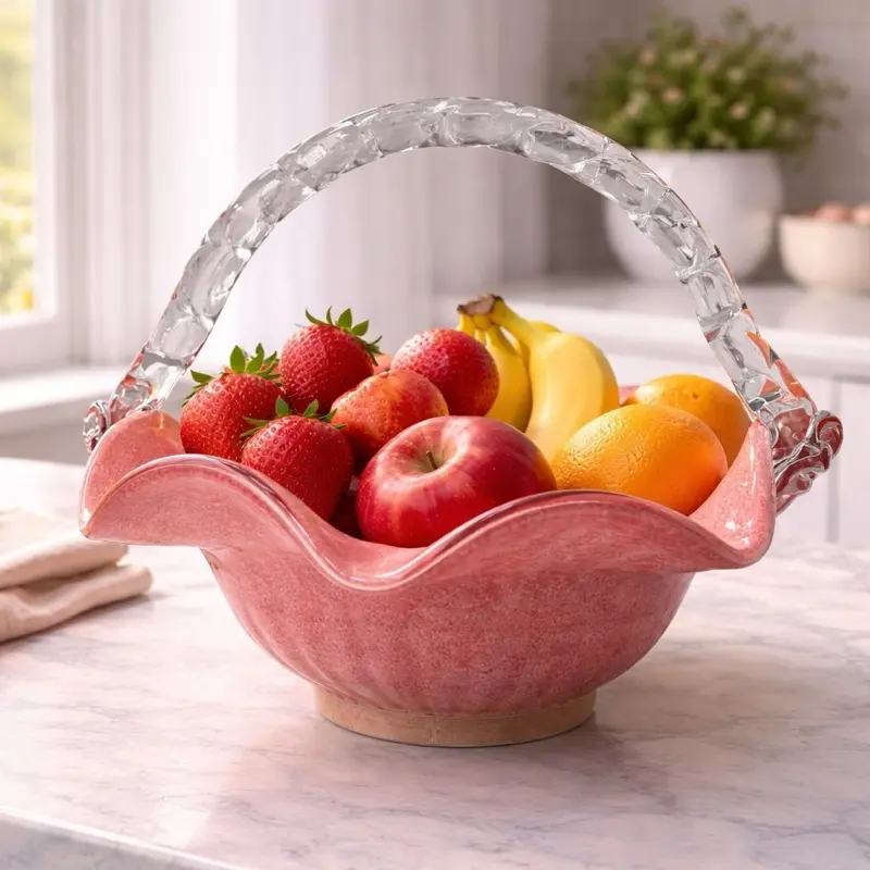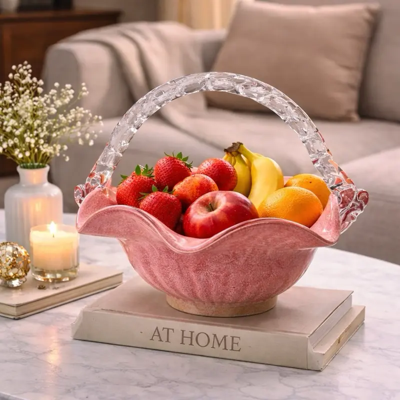 Add an elegant touch to your home decor with this charming decorative basket. The delicate pink-hued glass bowl features a gracefully ruffled edge that creates a beautiful wave-like pattern, perfectly complemented by a sleek silver-toned metal handle. The bowl's unique wavy design adds visual interest and makes it ideal for displaying candies, small ornaments, or as a standalone decorative piece. Its compact size makes it versatile enough to use as a centerpiece or accent piece on coffee tables, dining tables, or side tables. The glossy finish catches and reflects light beautifully, creating an eye-catching display wherever it's placed. The sturdy handle ensures easy transport while adding a sophisticated architectural element to the overall design.