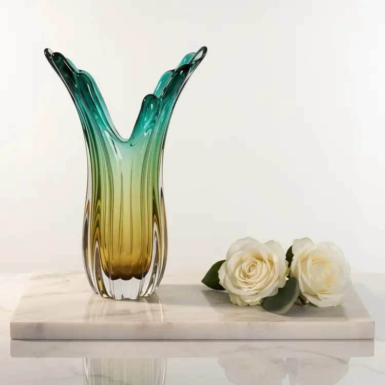 Transform your living space with this stunning decorative glass vase featuring an elegant ombre effect transitioning from emerald green to amber. The sophisticated ribbed design and graceful tulip shape add a touch of luxury to any room. Standing beautifully on a sturdy, crystal-clear base, this versatile vase is perfect for displaying fresh flowers, artificial arrangements, or as a standalone decorative piece. The generous opening and substantial depth accommodate various flower types, from long-stemmed blooms to full bouquets. Its striking gradient coloring creates a captivating visual display when light passes through, making it an eye-catching centerpiece for your dining table, mantel, or entryway. The premium glass construction ensures durability while maintaining its delicate appearance, making it an ideal gift for special occasions or a sophisticated addition to your home decor collection.