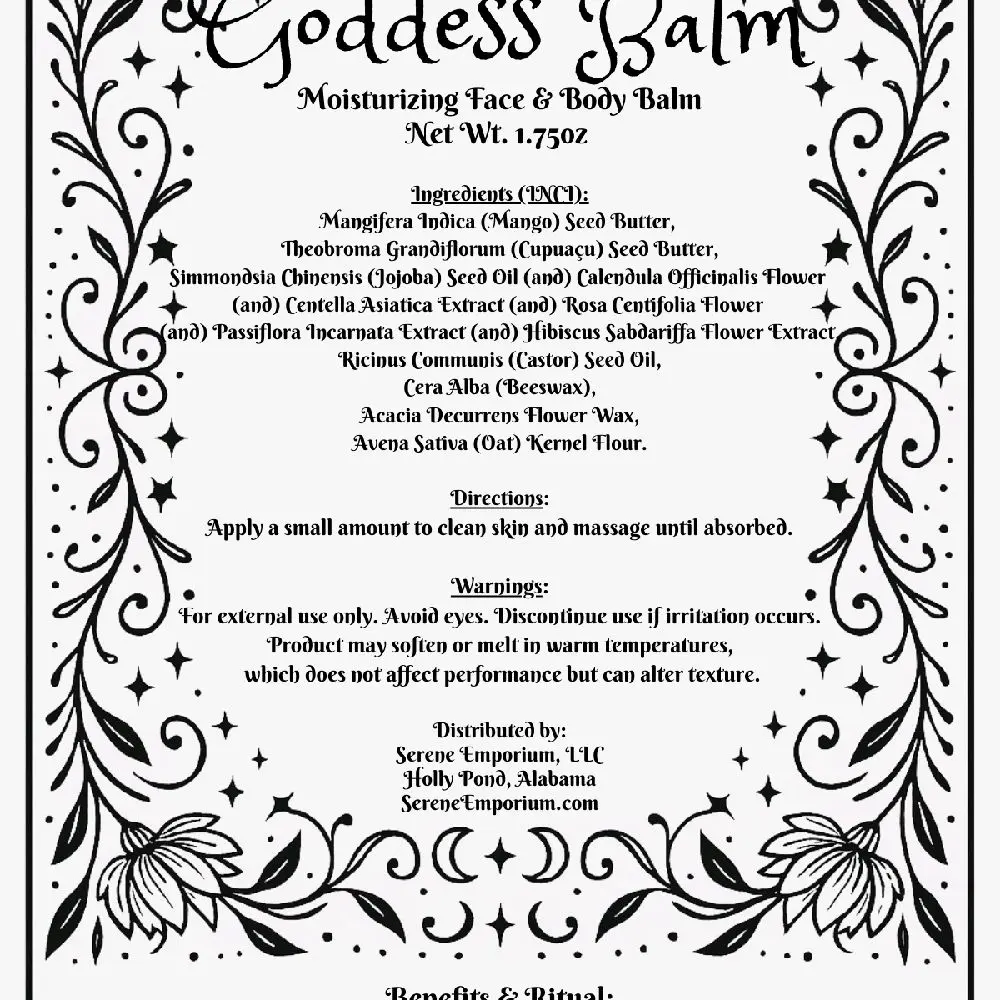 Goddess Balm is a rich, multi-purpose botanical balm crafted with calendula, gotu kola, rose, hibiscus, passion flower, colloidal oatmeal, and mimosa wax. It begins as a dense salve and melts effortlessly into warm skin, leaving it soft, nourished, and glowing.