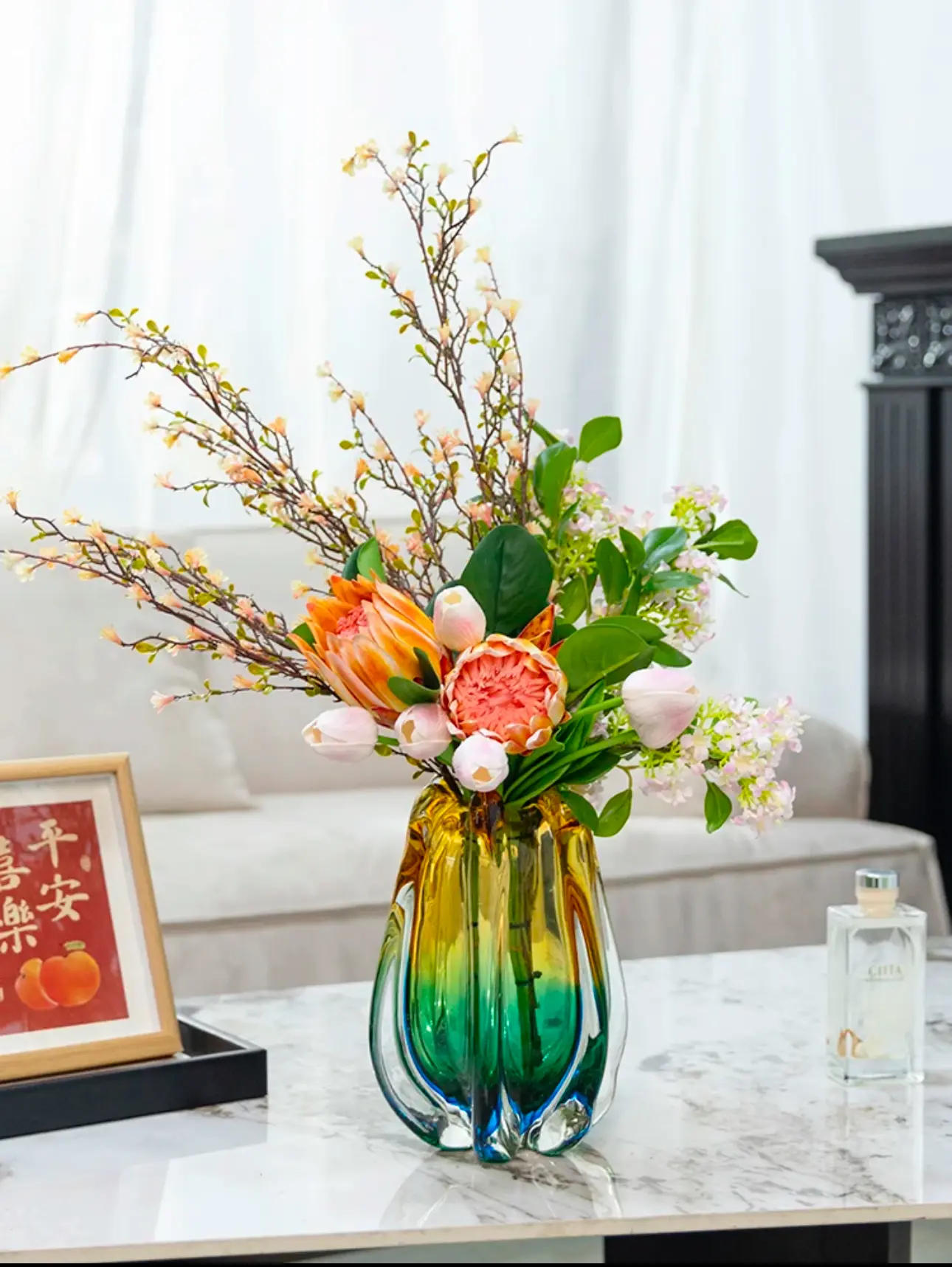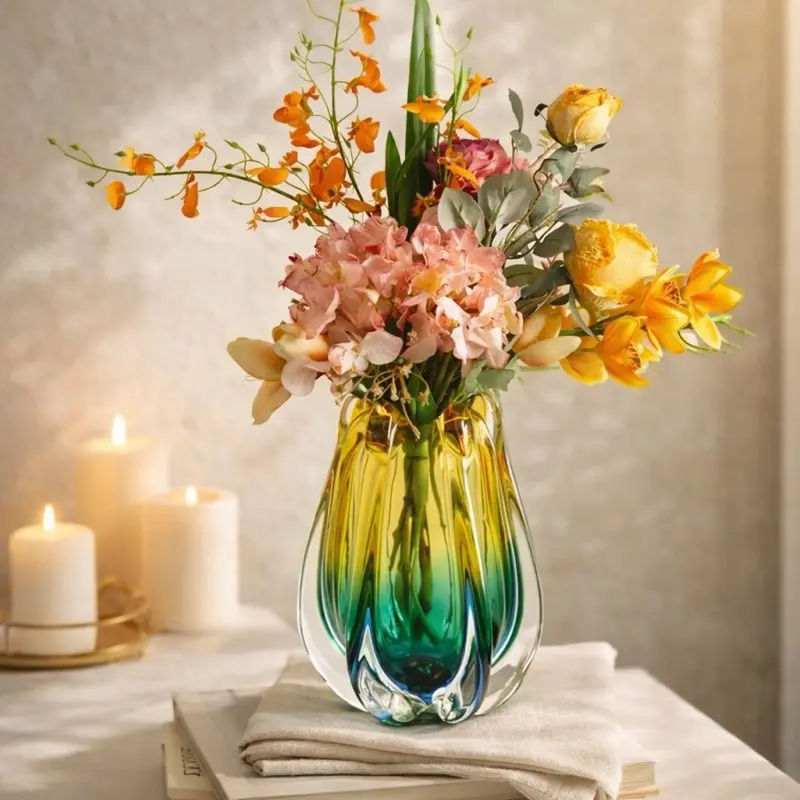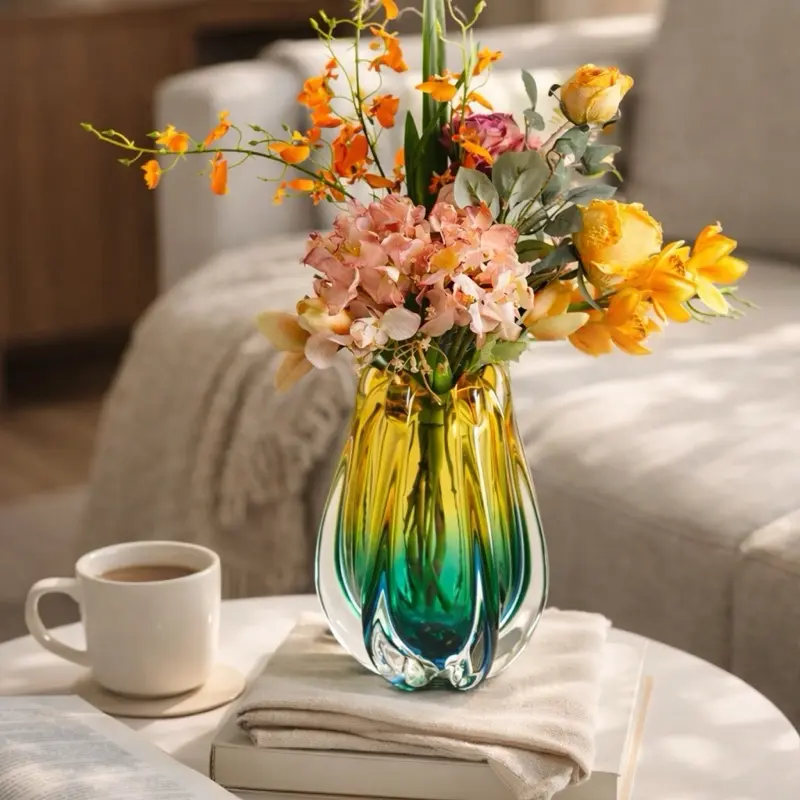 Transform your living space with this stunning decorative glass vase featuring a mesmerizing gradient from amber gold to emerald green to deep blue. The elegant, sculptural form with its curved silhouette and ribbed texture catches light beautifully, creating an eye-catching display piece even when empty. Standing gracefully on any surface, this contemporary vase is perfect for showcasing fresh-cut flowers, dried arrangements, or seasonal botanicals. The generous opening and stable base make it ideal for displaying both delicate stems and fuller bouquets. The harmonious color transition adds a modern artistic element while complementing both bold and subtle flower arrangements. This versatile piece works wonderfully as a centerpiece or accent decoration, adding sophistication to any room's decor. Each vase features unique handcrafted details that make it a distinctive decorative accent for your home.
