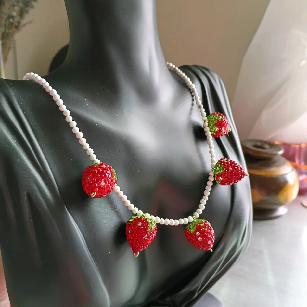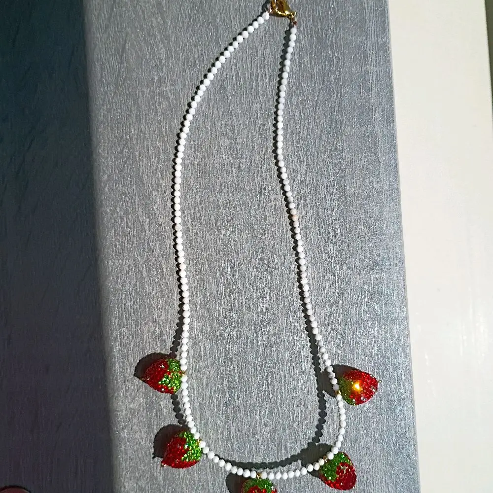 The Strawberry Howlite Necklace is a charming accessory for any outfit. It features five sparkly Strawberry beads on a string of small white Howlite crystal beads. The necklace is simple yet striking, making it a versatile piece for various occasions.