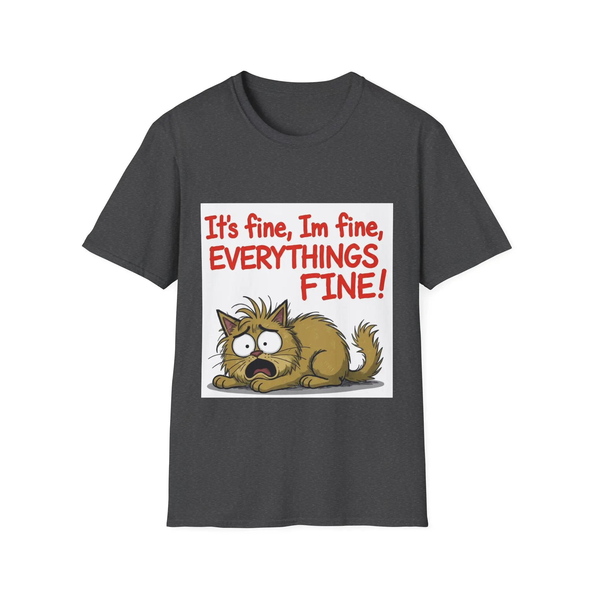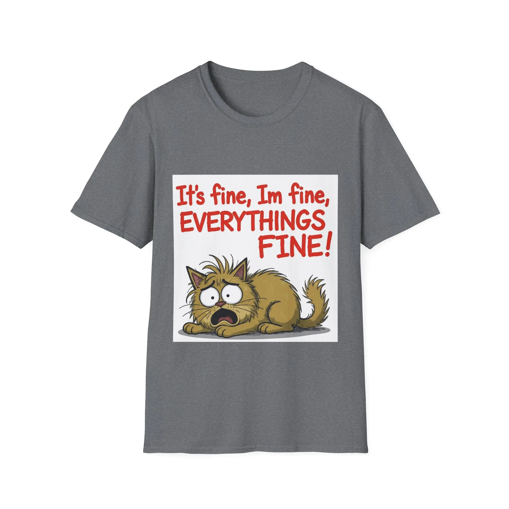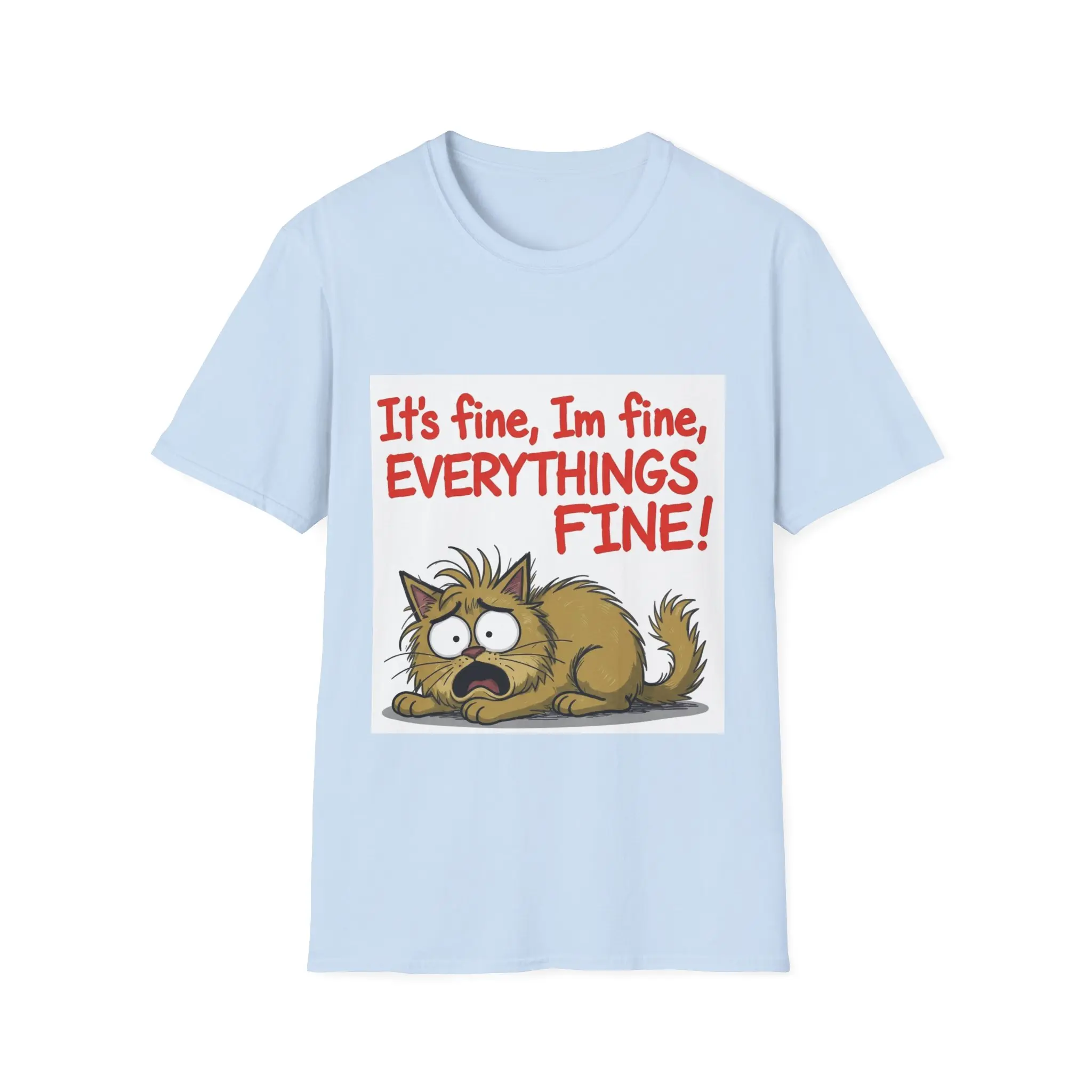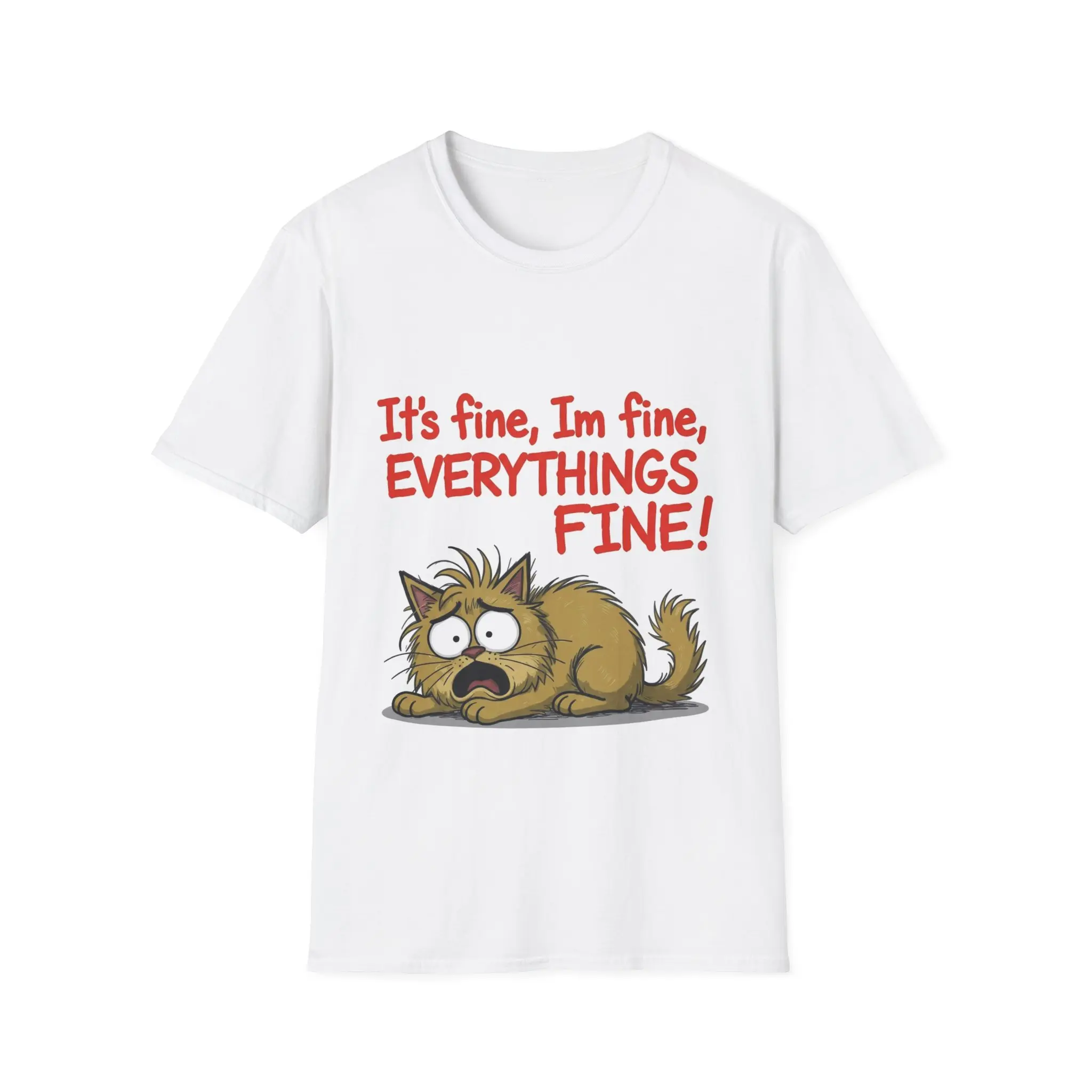 This lightweight crew-neck tee carries a desperate-but-funny energy: a frazzled cartoon cat curled low with wide, stressed eyes under bold hand-lettered text, “It’s fine, I’m fine, EVERYTHING’S FINE!” The soft ring-spun cotton feels gentle against the skin while the classic fit and clean neckline keep the design front-and-center. Wear it when you want to laugh at life’s chaos, commiserate with friends, or lighten a long day. The muted, natural fabric options and tear-away label make it comfortable for everyday wear, and durable printing methods keep the illustration crisp after many washes.