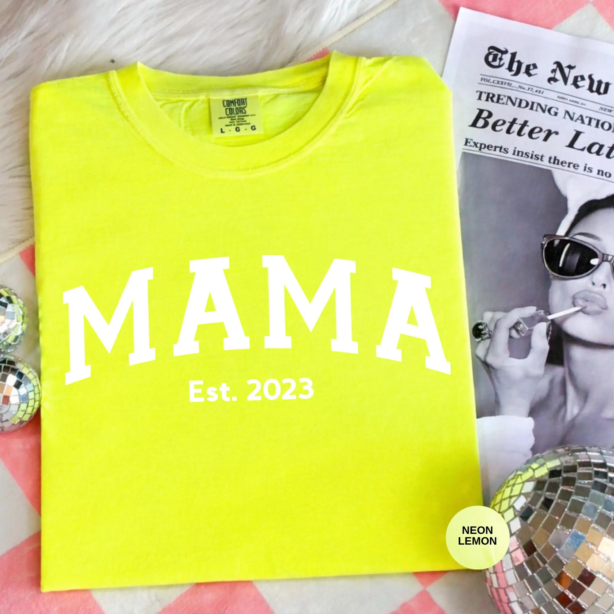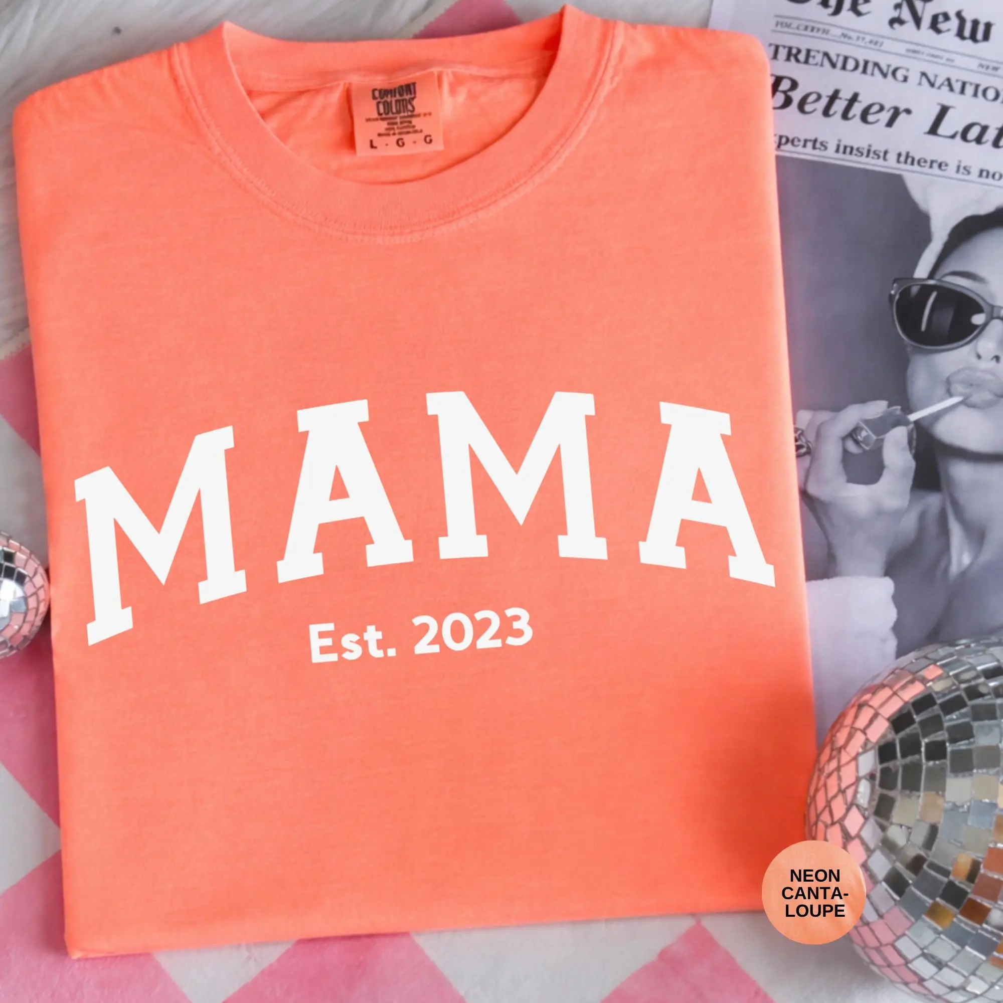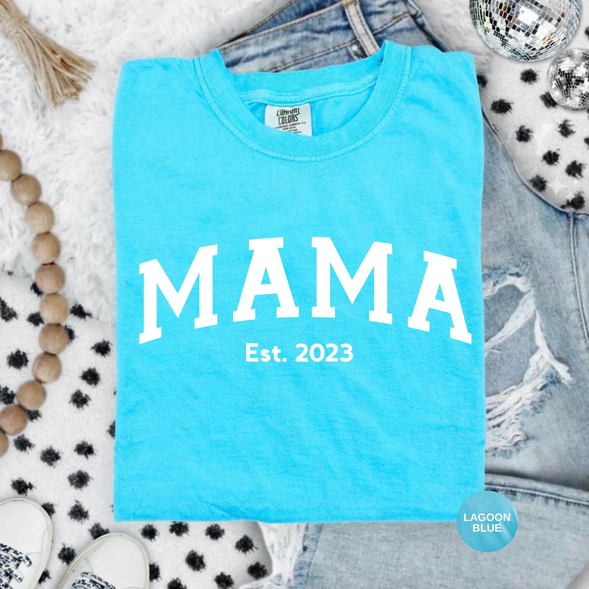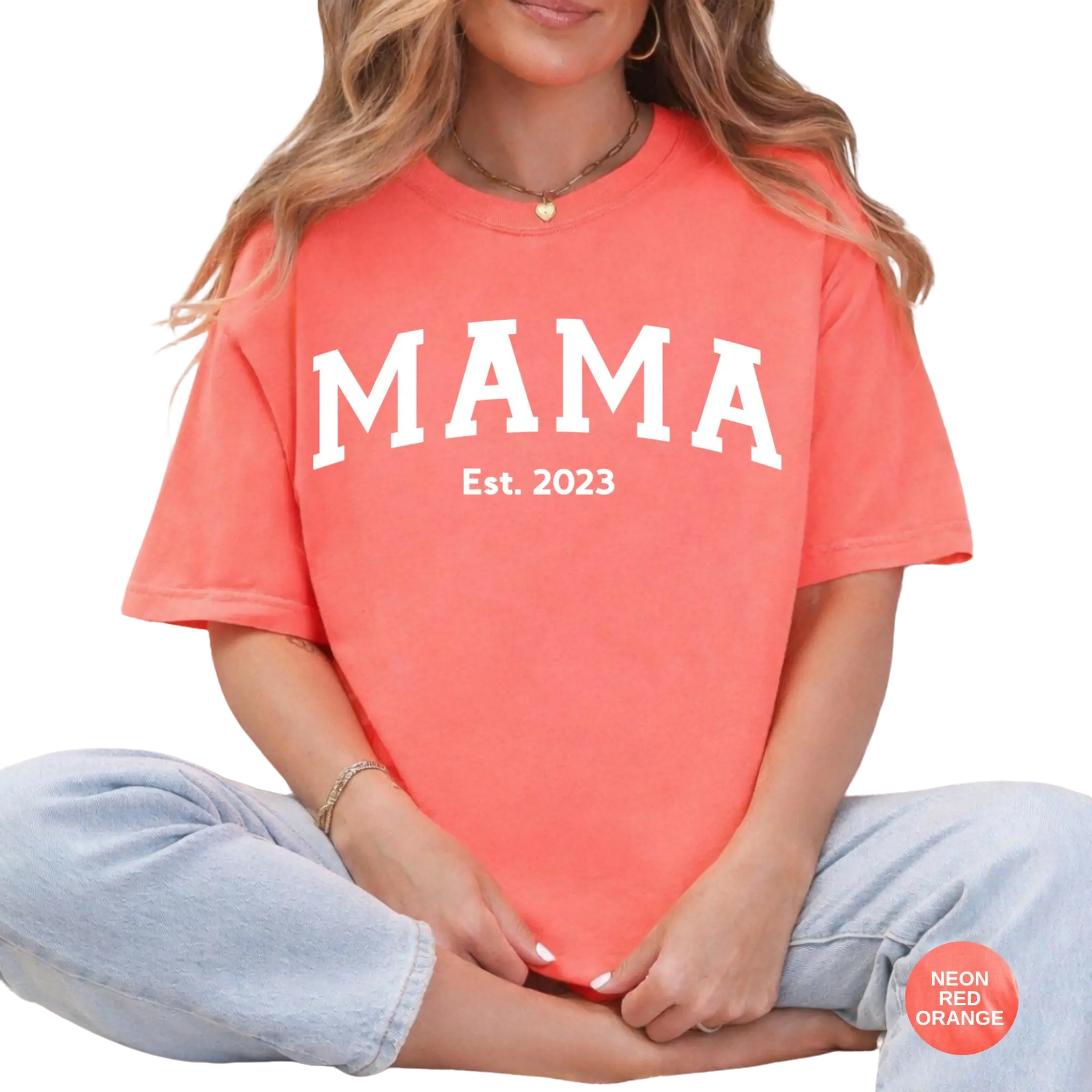 MAMA Est. Custom Tee Celebrate the year your favorite title began This custom “MAMA Est.” tee is the perfect everyday staple—made for busy moms who still want to look cute and feel comfortable.