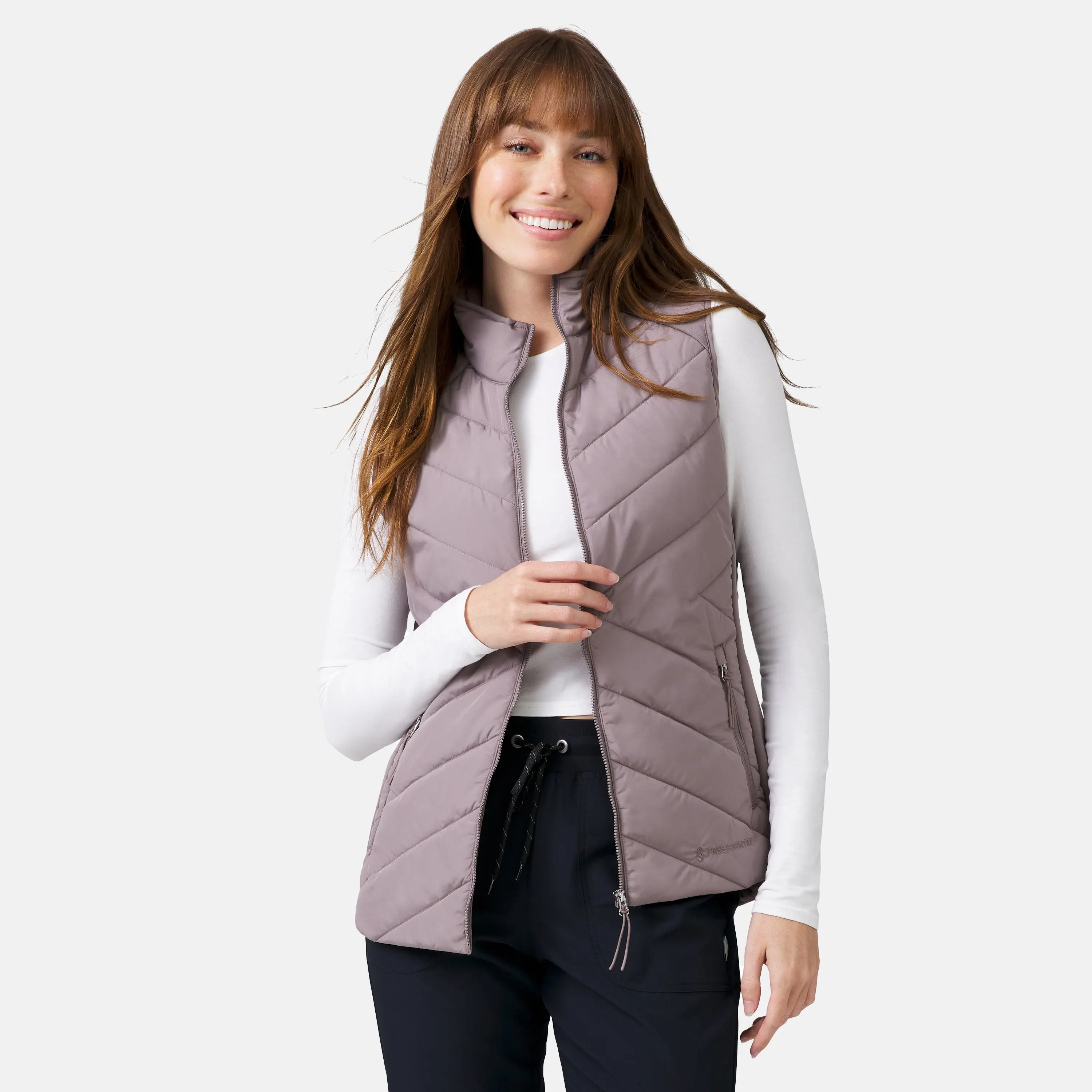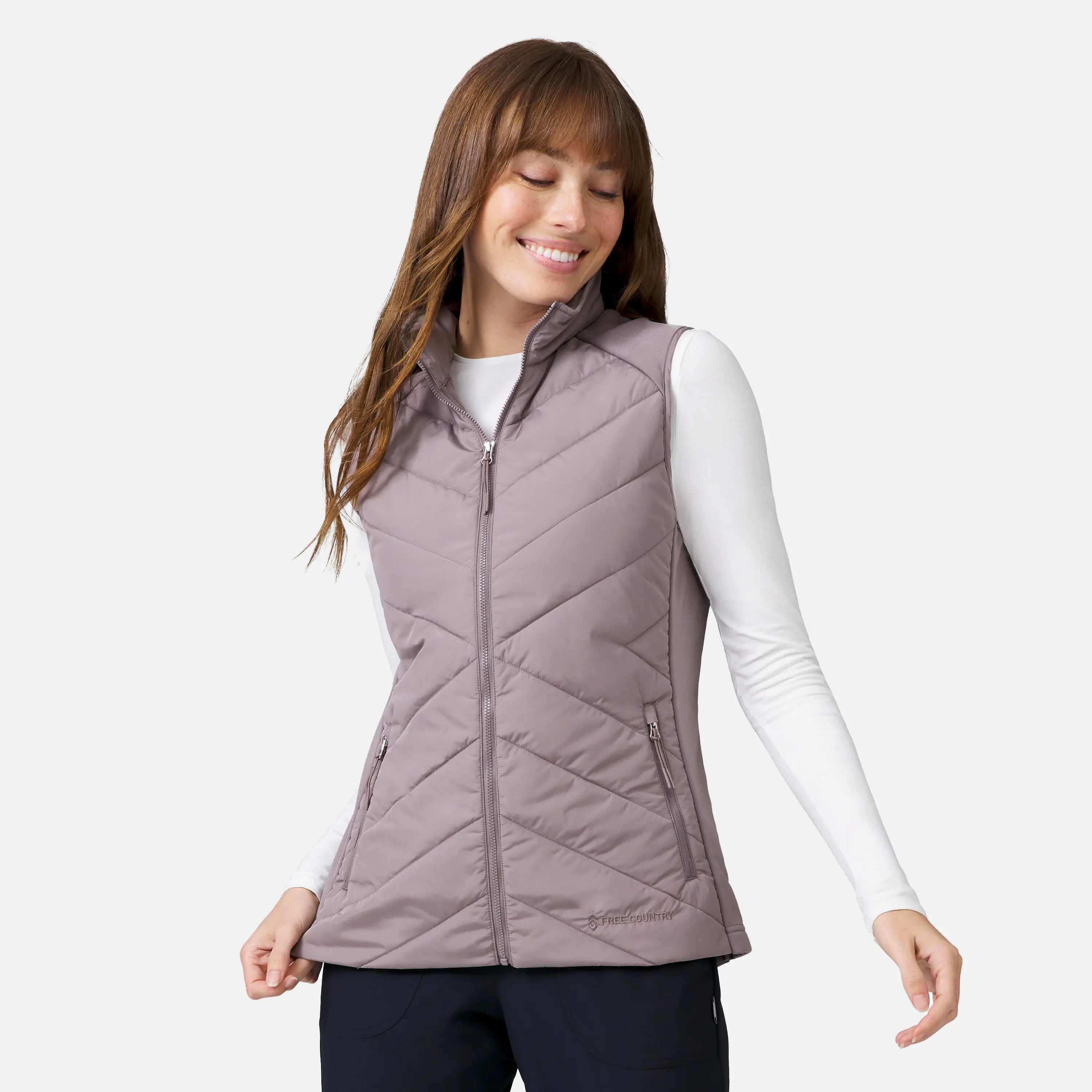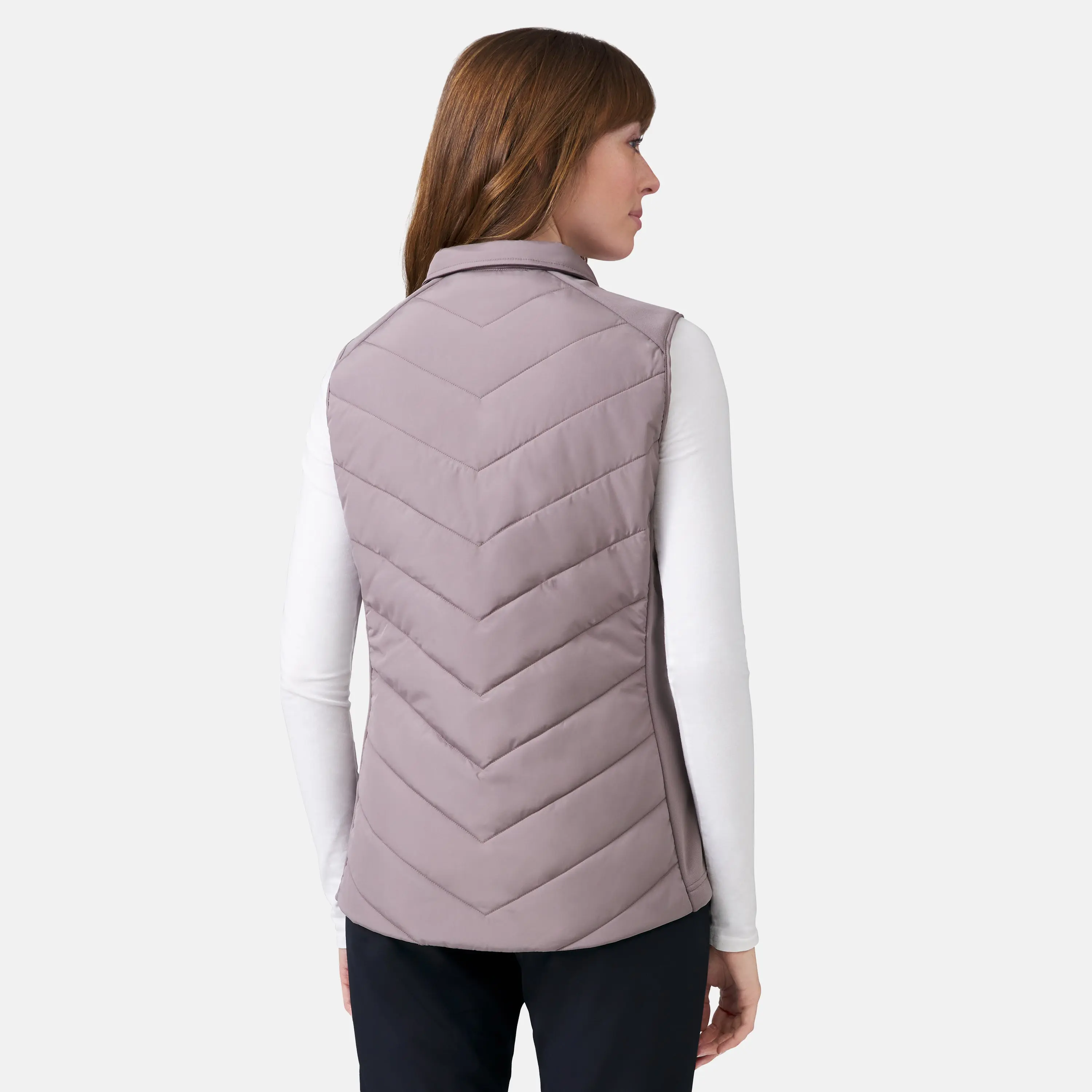 Get ready to elevate your outerwear game! This isn't just any vest—it's a stylish and sustainable choice for any activity. This layering MVP is lightweight yet warm thanks to its REPREVE® high-quality synthetic fill made with recycled plastic bottles. Designed with your comfort in mind, it boasts four-way stretch and features a unique quilted design with stretch knit panels. This means you can move freely and comfortably, whether you're out for a hike or just running errands.