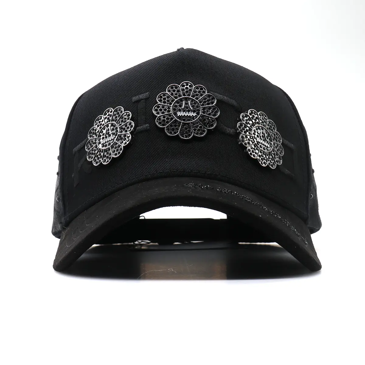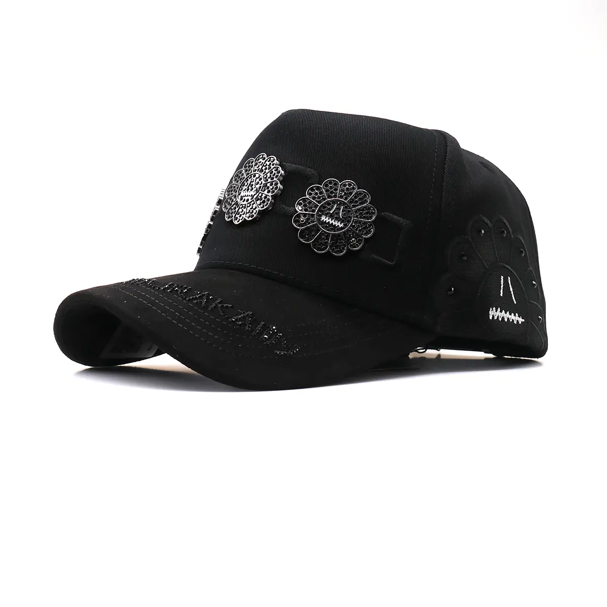 Gothic-Style "Smiley Flower" Streetwear Cap — Fully Embellished Rhinestone Hip-Hop Baseball Hat, Adjustable Black Suede-Brimmed "Dad Hat"