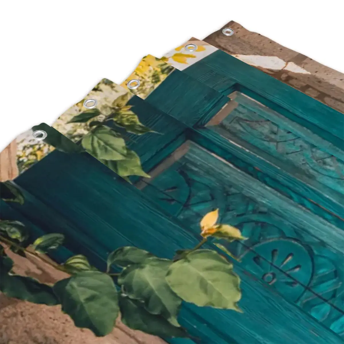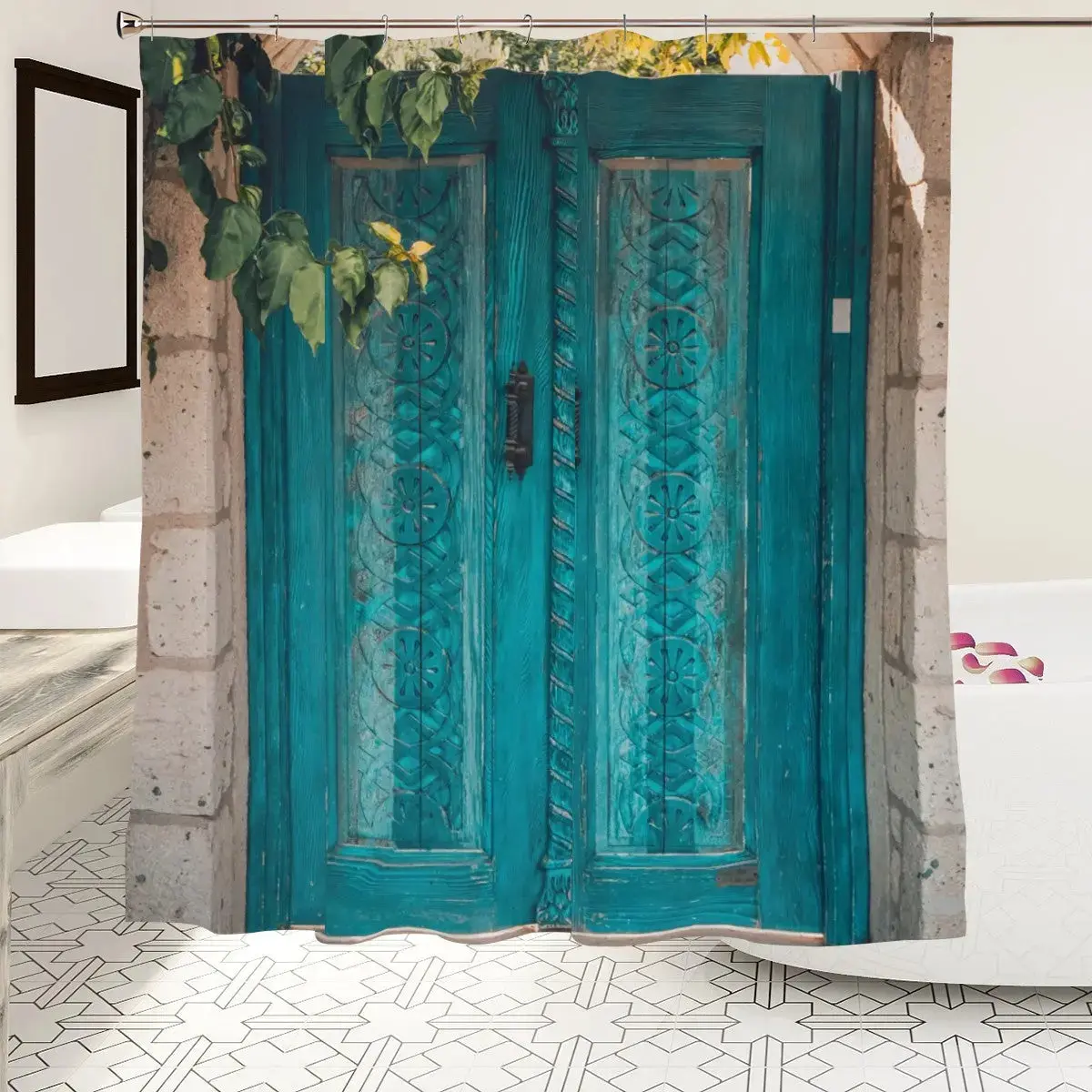 A shower curtain that brings a quiet, sun-warmed doorway into your bathroom. The rich teal door with carved details and climbing vine accents creates a calm, slightly weathered look—like a coastal cottage or an old-world studio you can step through every morning. The textured color and subtle shadows give depth without shouting; it’s for someone who loves lived-in character and small, restorative moments at home.