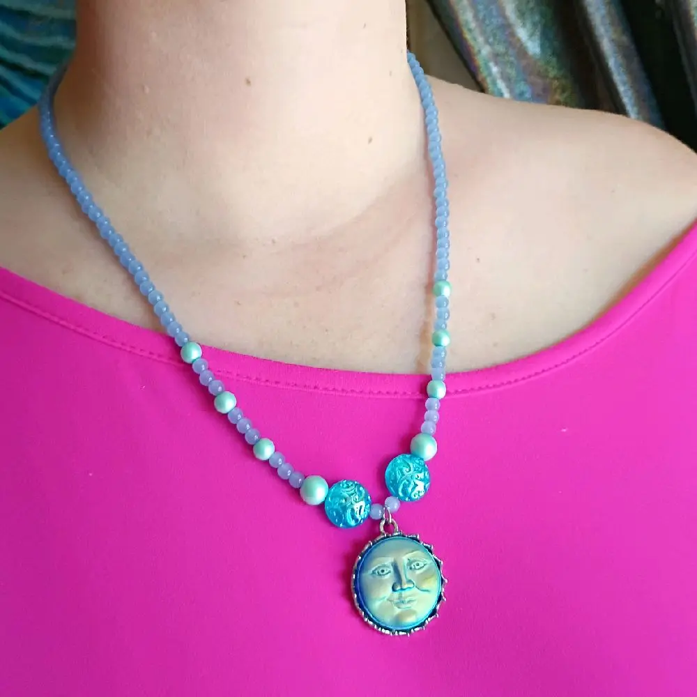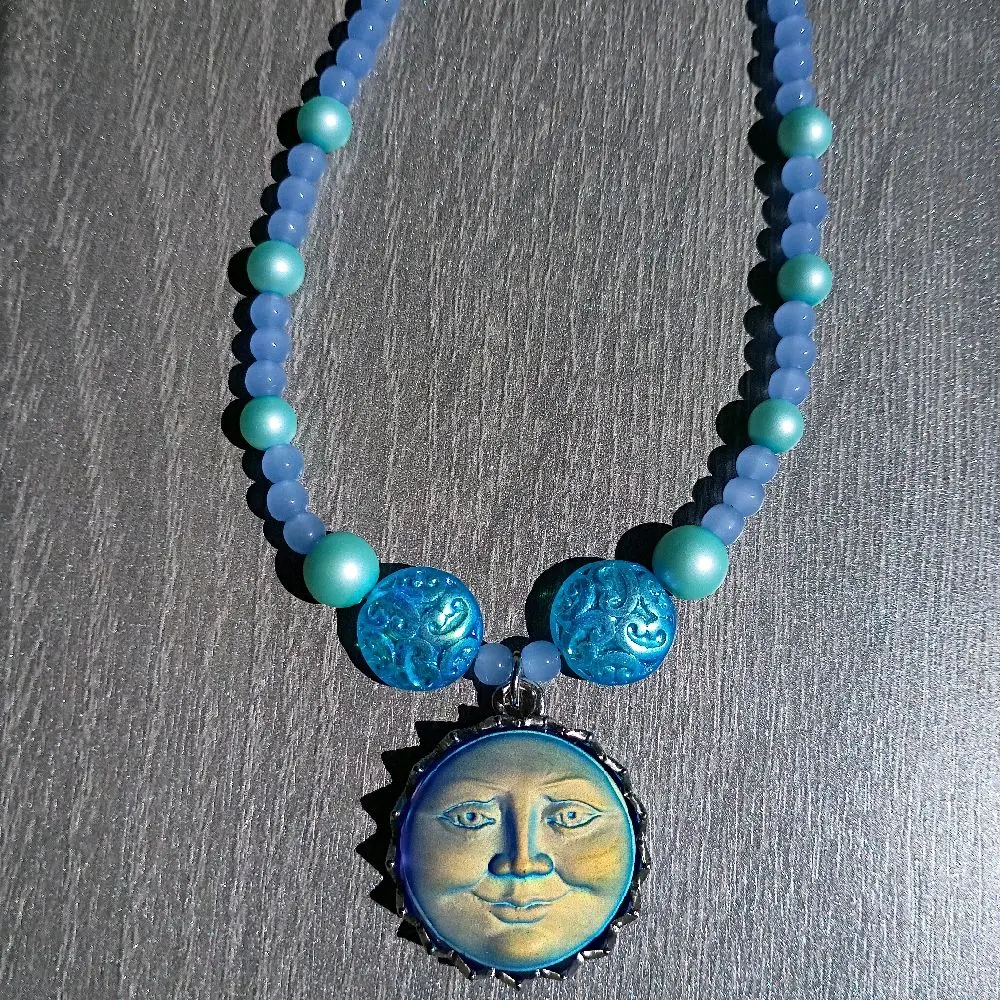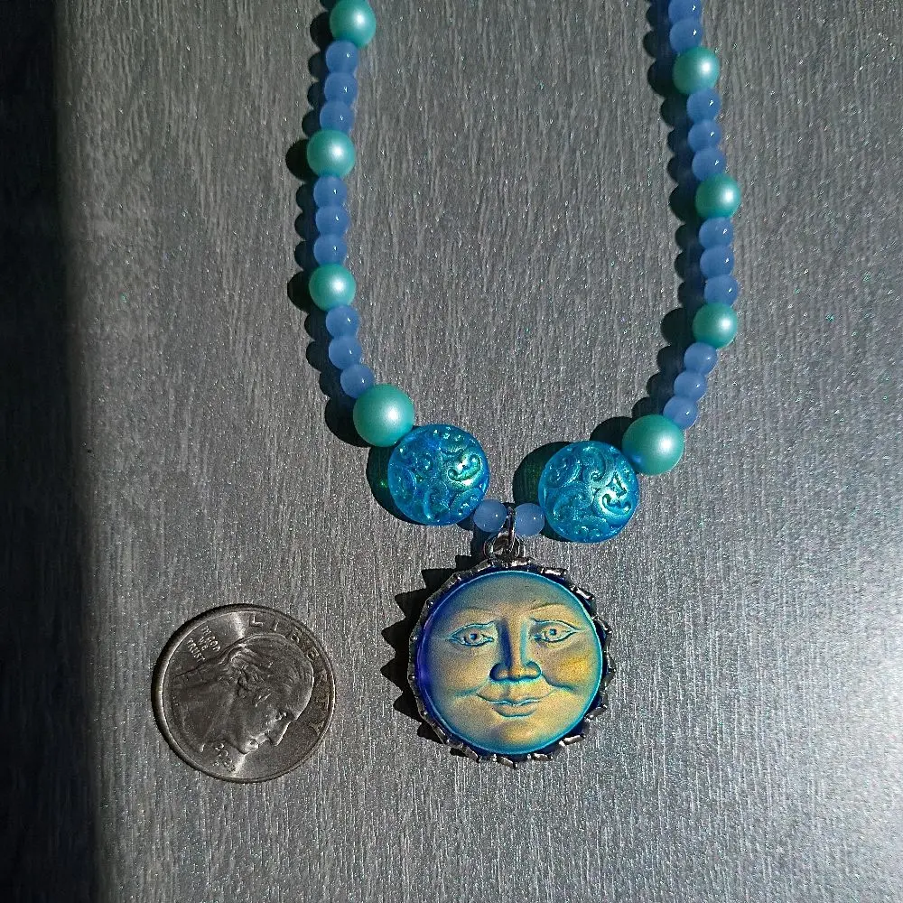 The moon motif adds a touch of mystique to your look. The variety of glass beads showcase striking shades of blue, similar to the sky.