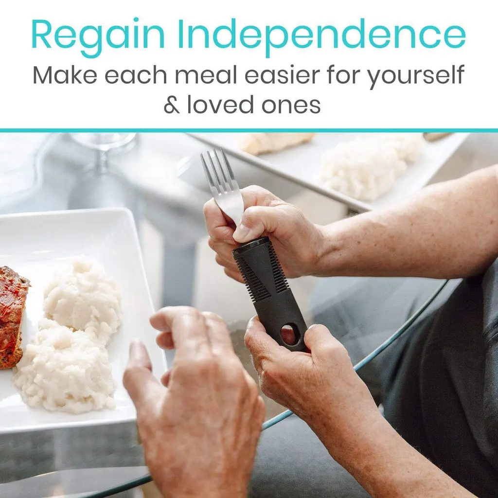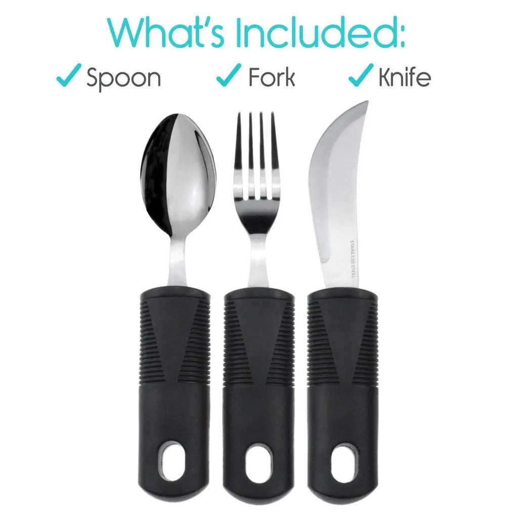 Make mealtimes easier with the Vive Health Adaptive Utensil Set. This three-piece flatware set is designed for individuals who require extra stability and control while eating. Each utensil features a wide, built-up handle with a ribbed texture to ensure a secure, non-slip grip, even for those with limited hand strength or tremors.