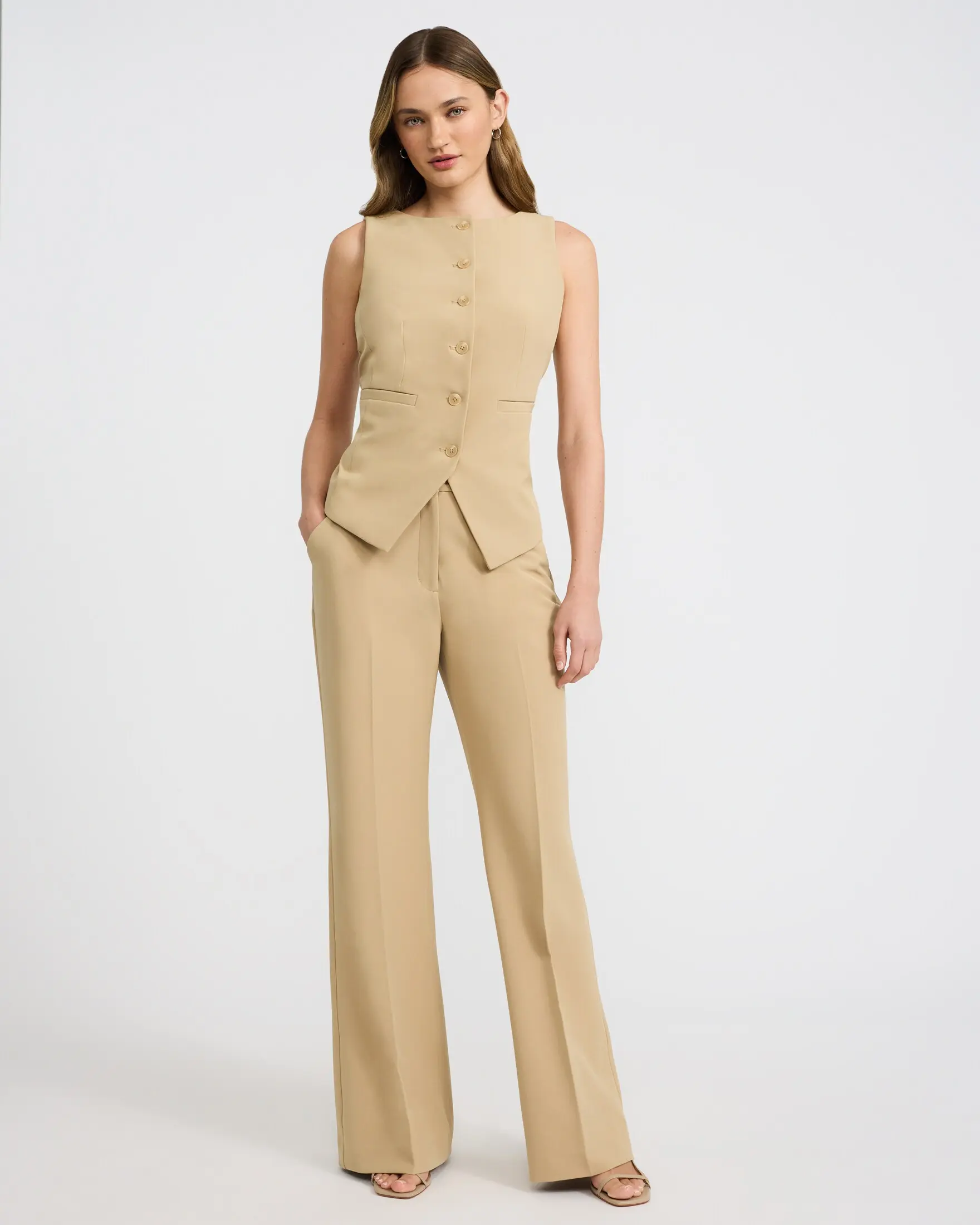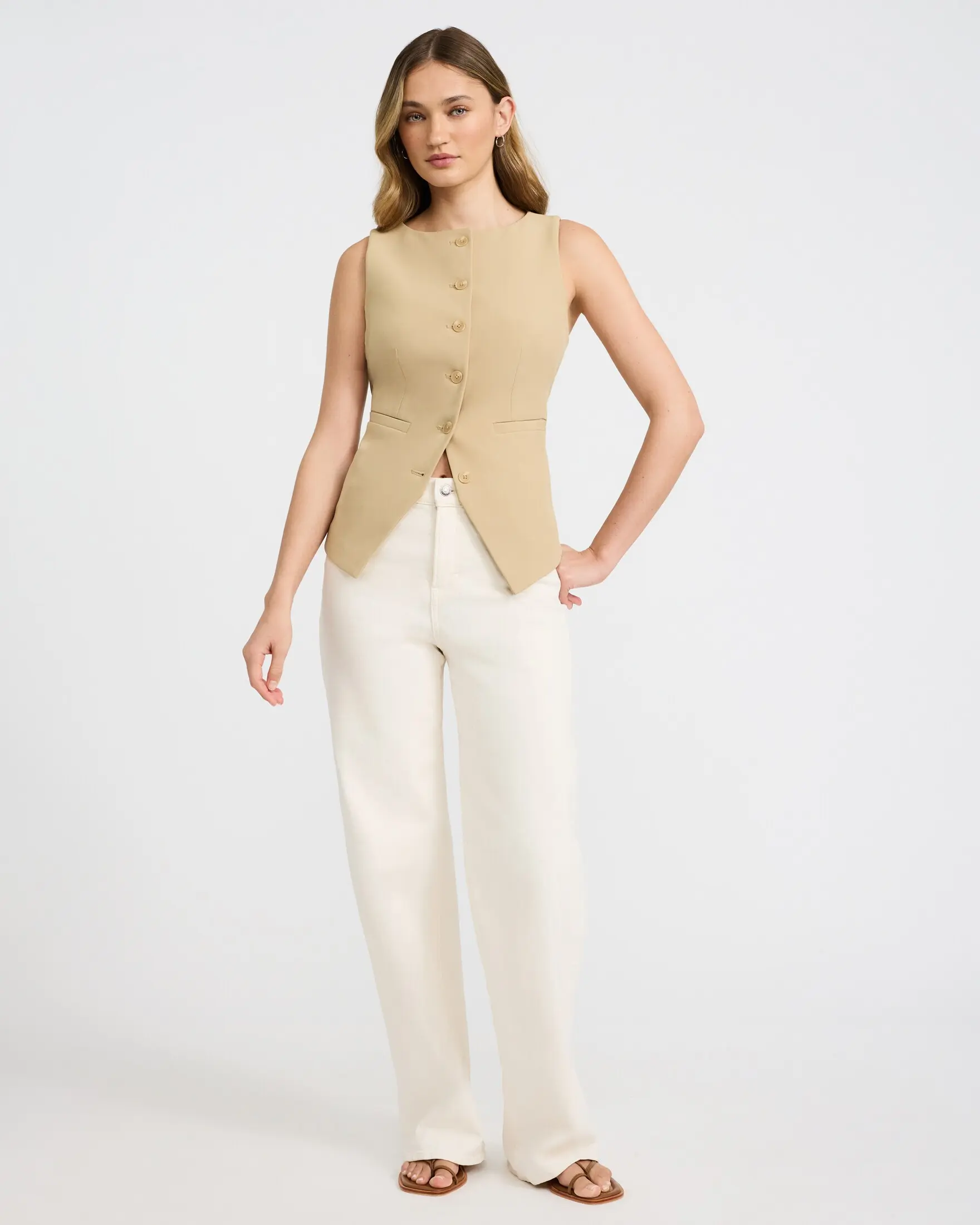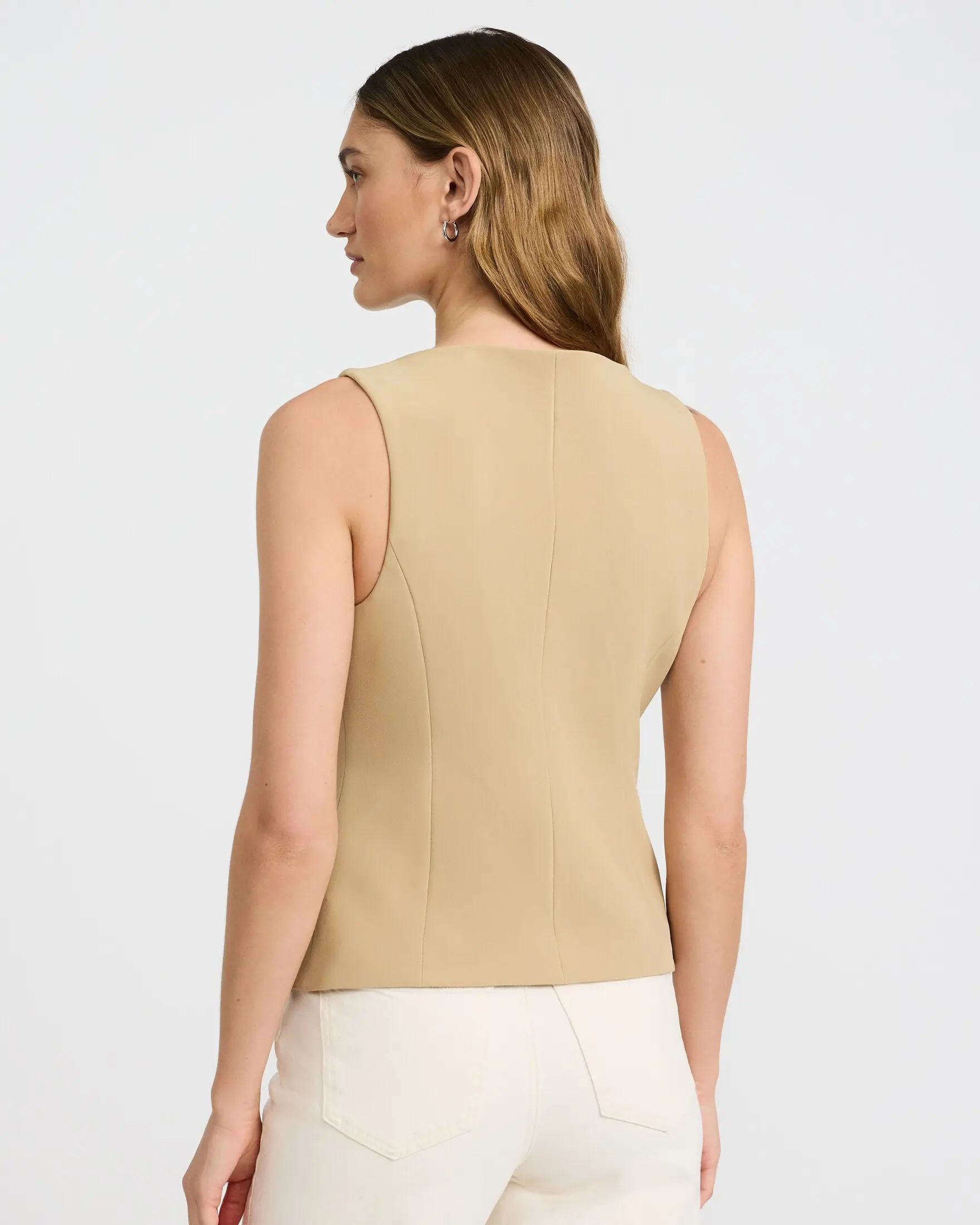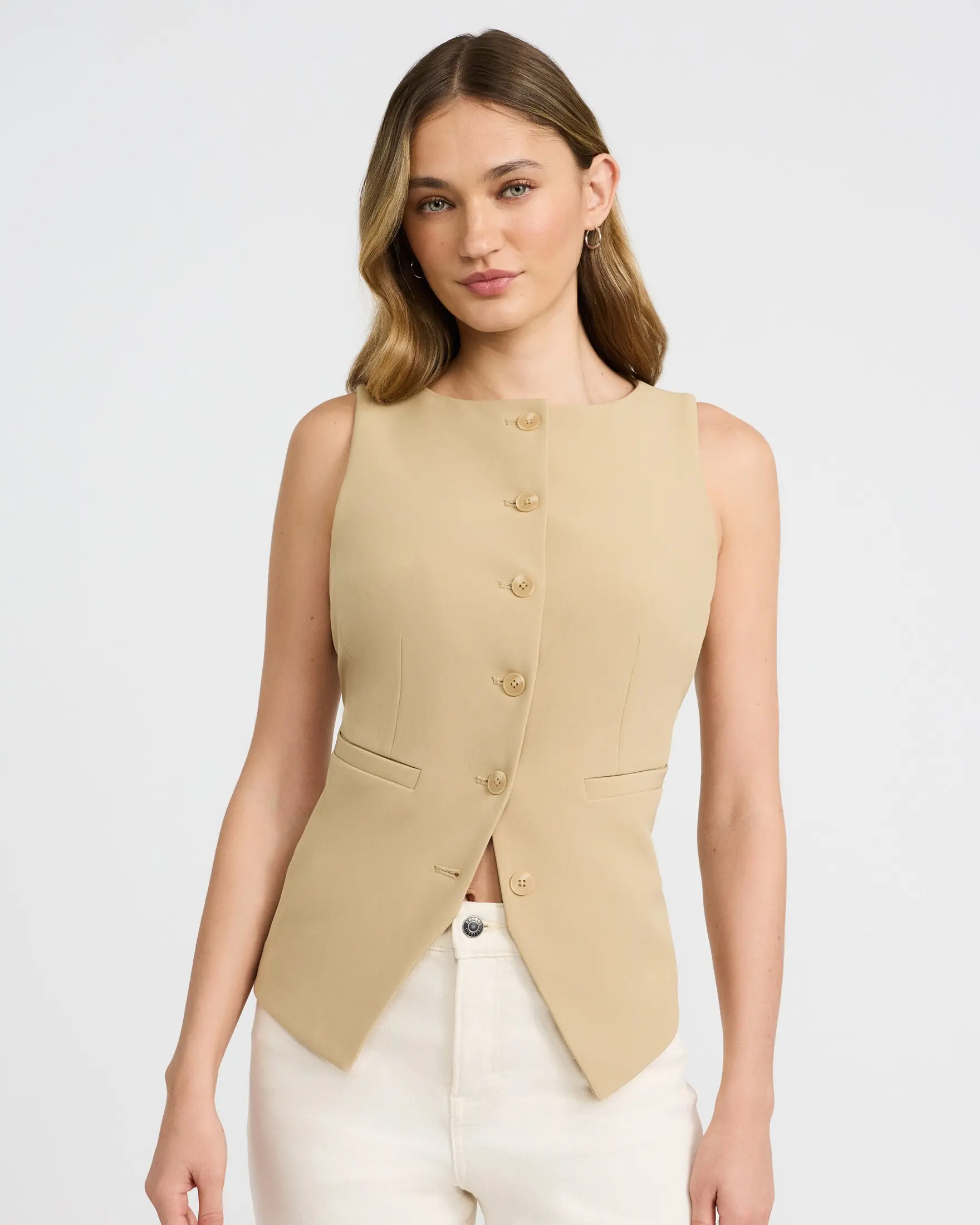 This blazer vest is expertly tailored to hug every curve, for comfortable confidence all day long. Created with a chic boat neckline, a five button closure, and a cutaway hem for a timeless and flattering look. Pair with: #07442984, #06747794