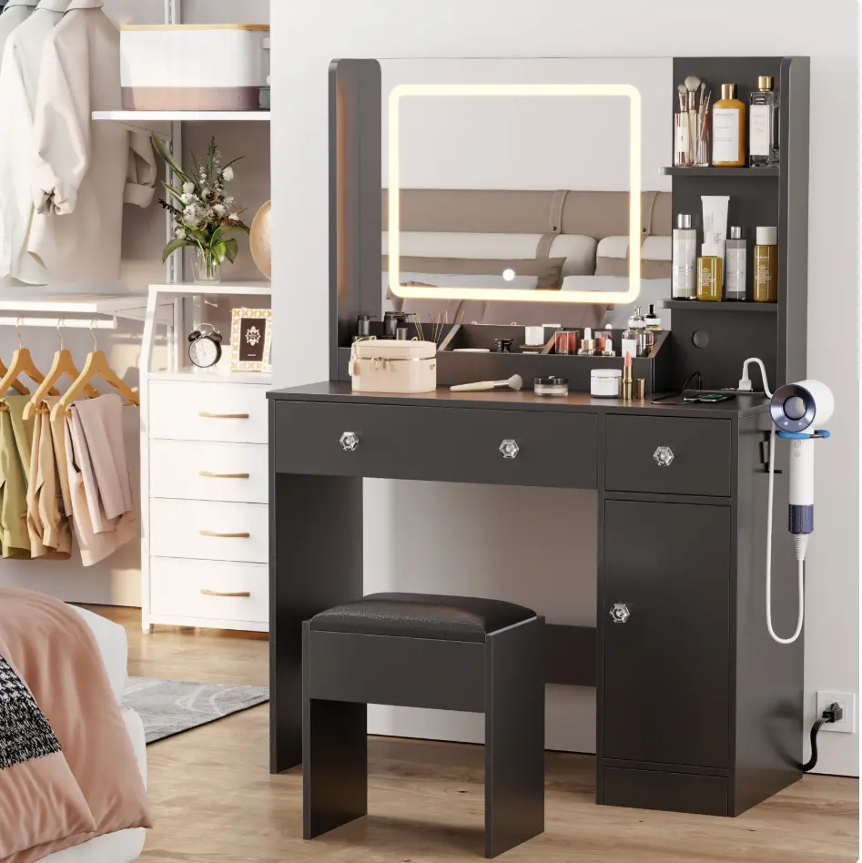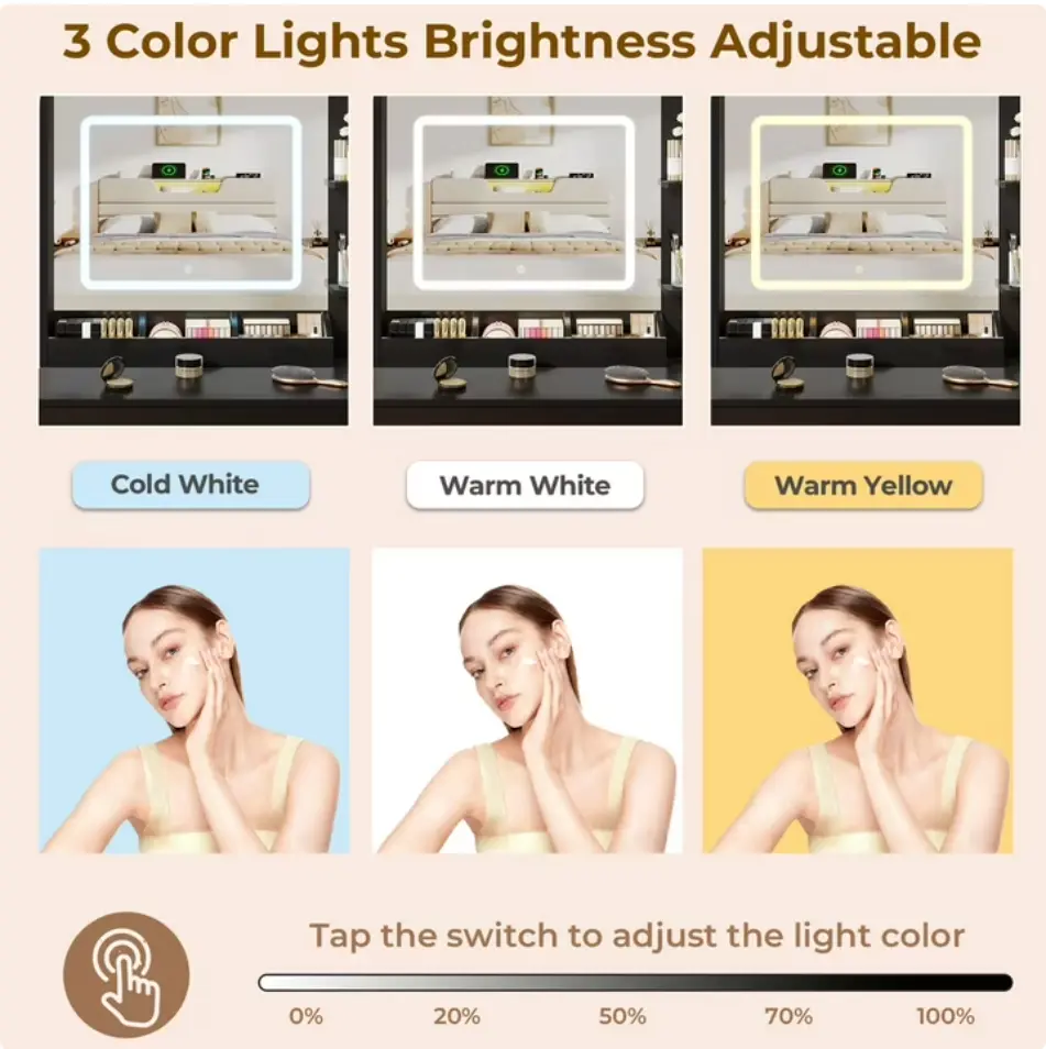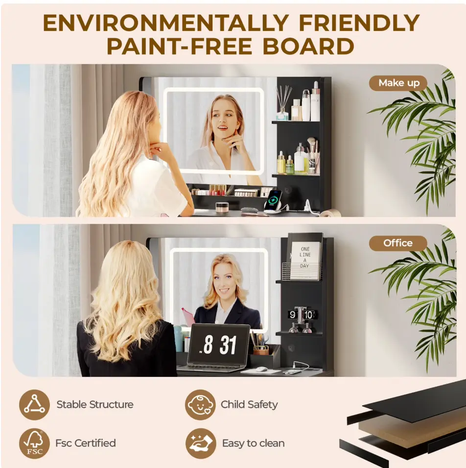 Transform your beauty routine with our Makeup Desk with Charging Station. Tired of juggling power cords and struggling with poor lighting? This all-in-one vanity desk provides the perfect solution. Combining elegance and functionality, it’s designed to make your daily makeup and hairstyling experience seamless and enjoyable.