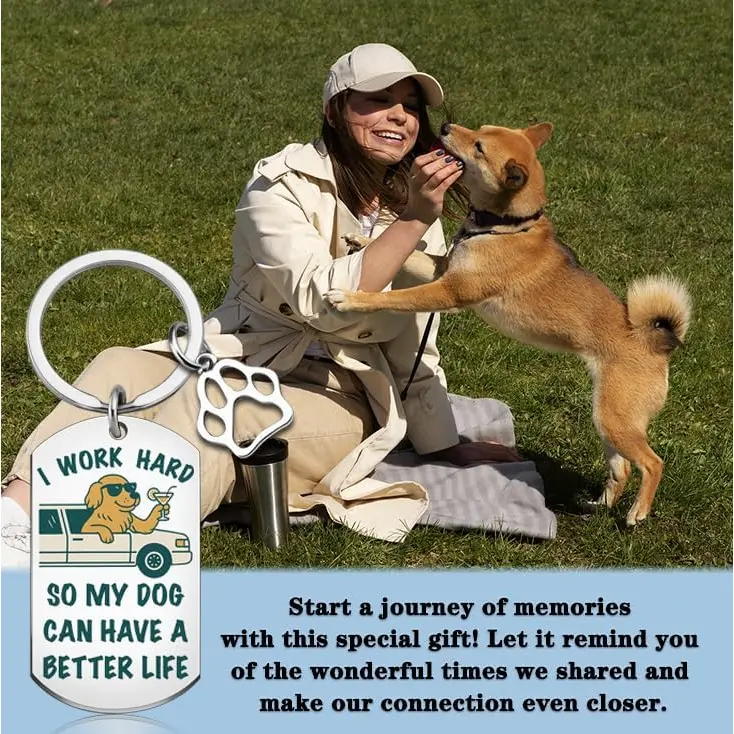 Personalized Dog Gifts/Dog Keychain Gifts for Dog Lover: This dog keychain features the heartfelt inscription "I work hard so my dog can have a better life," complemented by an adorable engraving of a dog lounging with sunglasses and a juice cup, making it a perfect gift for dog lovers, dog dad, dog mom, pet parents, dog owners and veterinarian lovers.