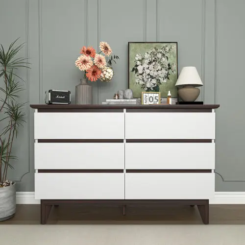 Transform your bedroom or living room with this versatile and spacious 6-drawer cabinet. Designed for modern living, this piece combines a sleek white and walnut finish with practical storage solutions. Its wide 47-inch design offers ample space for clothing, linens, media, or office supplies, helping you declutter and organize any room with style. Engineered from durable particle board, it provides reliable, long-lasting storage that fits seamlessly into your home decor.