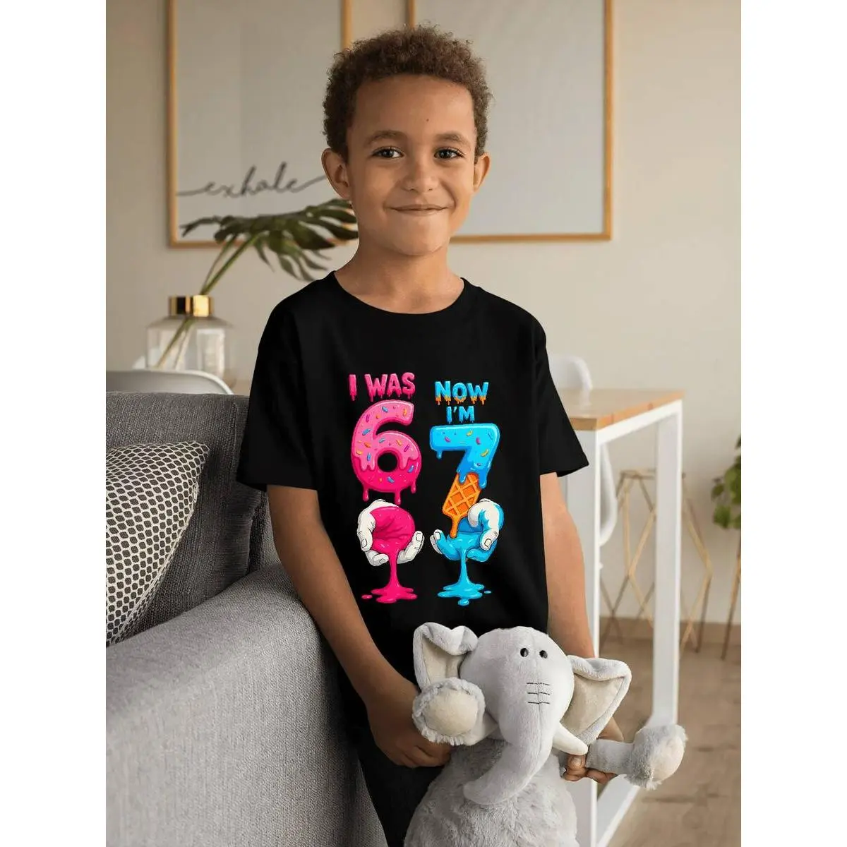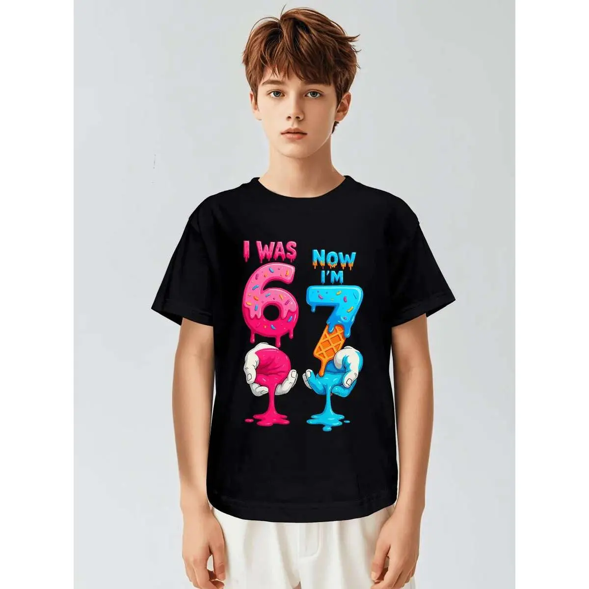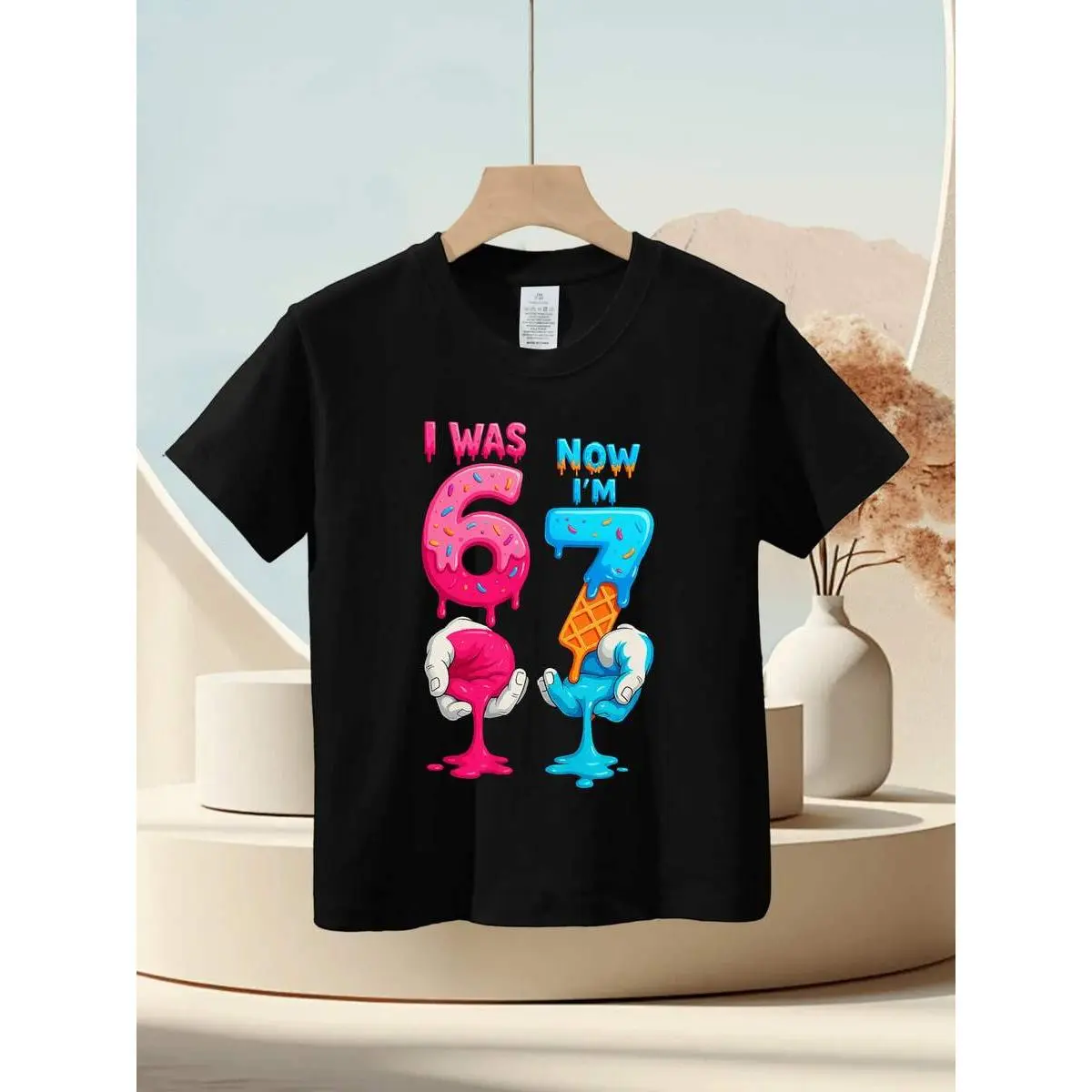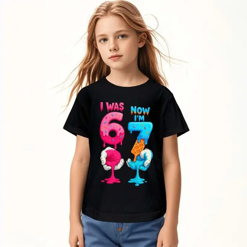This KidsCotton T-Shirt is perfect for 6th & 7th birthdays. It features a fun "I Was 6 Now I Am 7" design with a 67 number. Made from cotton, it offers a loose fit and round neck. Ideal for spring and summer, this casual outfit is suitable for children over 3 years old.🌞