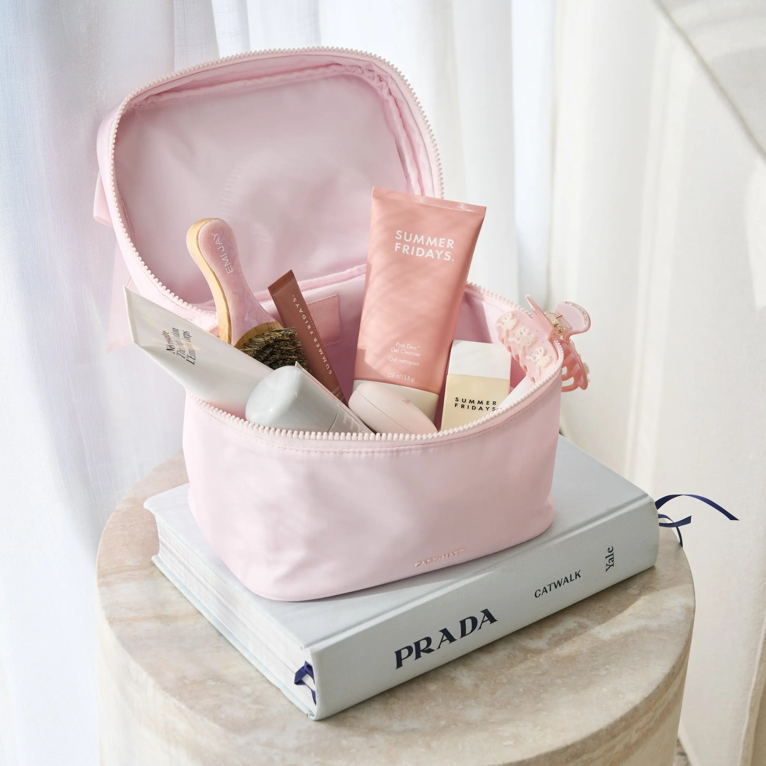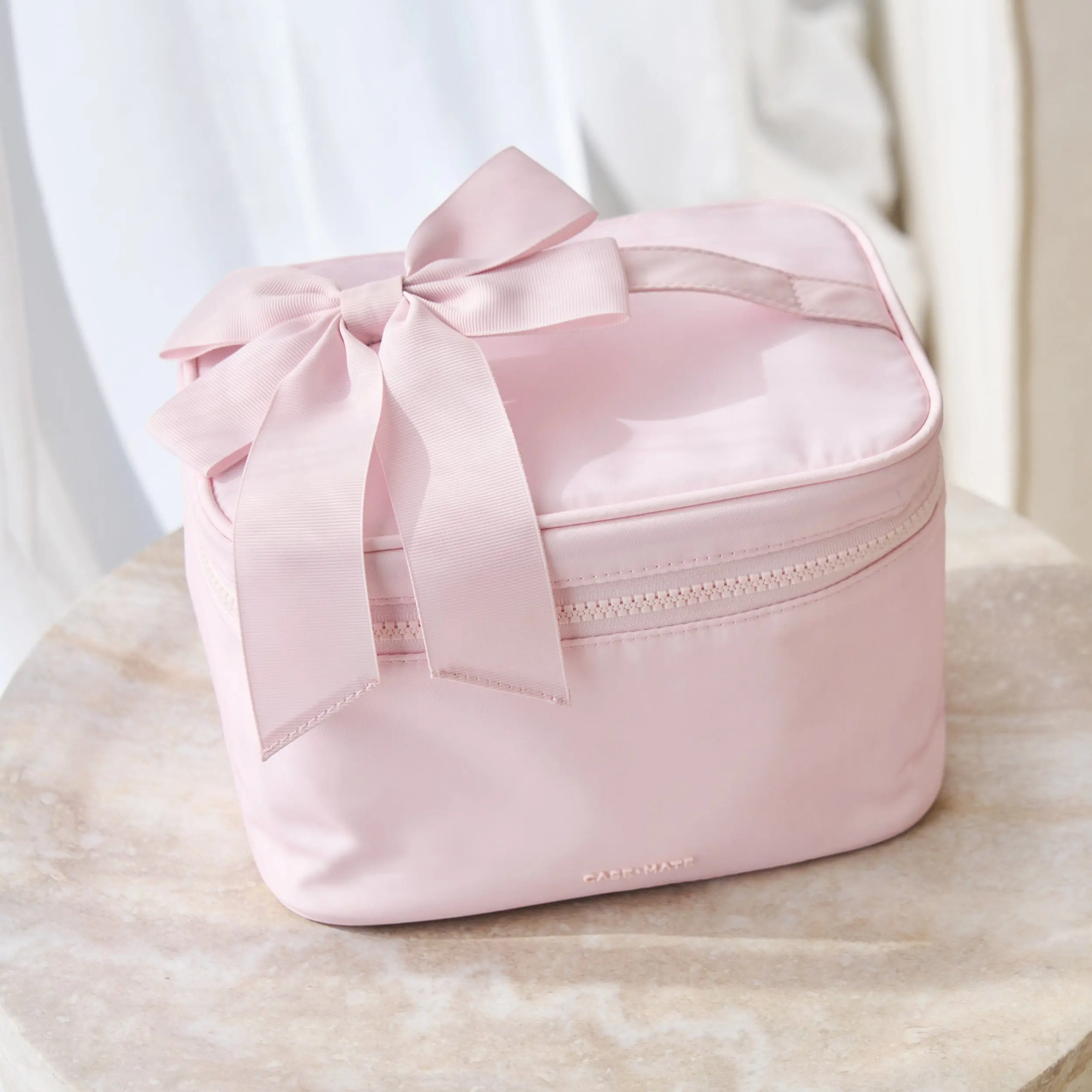 This is the train case you and your makeup routine have been waiting for. The Train Case has a flat bottom that sits nicely on any surface and unzips wide for easy access to every product. From weekday mornings to weekends away, you can fit all of your favorite beauty, skincare, makeup essentials, and more. A statement bow accents the carrying handle, perfectly matching the signature detail of our Bow Jelly Tote. It’s also machine-washable and designed with waterproof fabric, so spills and smudges wipe away effortlessly. Whether it’s packed in your tote or sitting pretty on your counter, this Train Case is perfect for beauty on the go or at home.