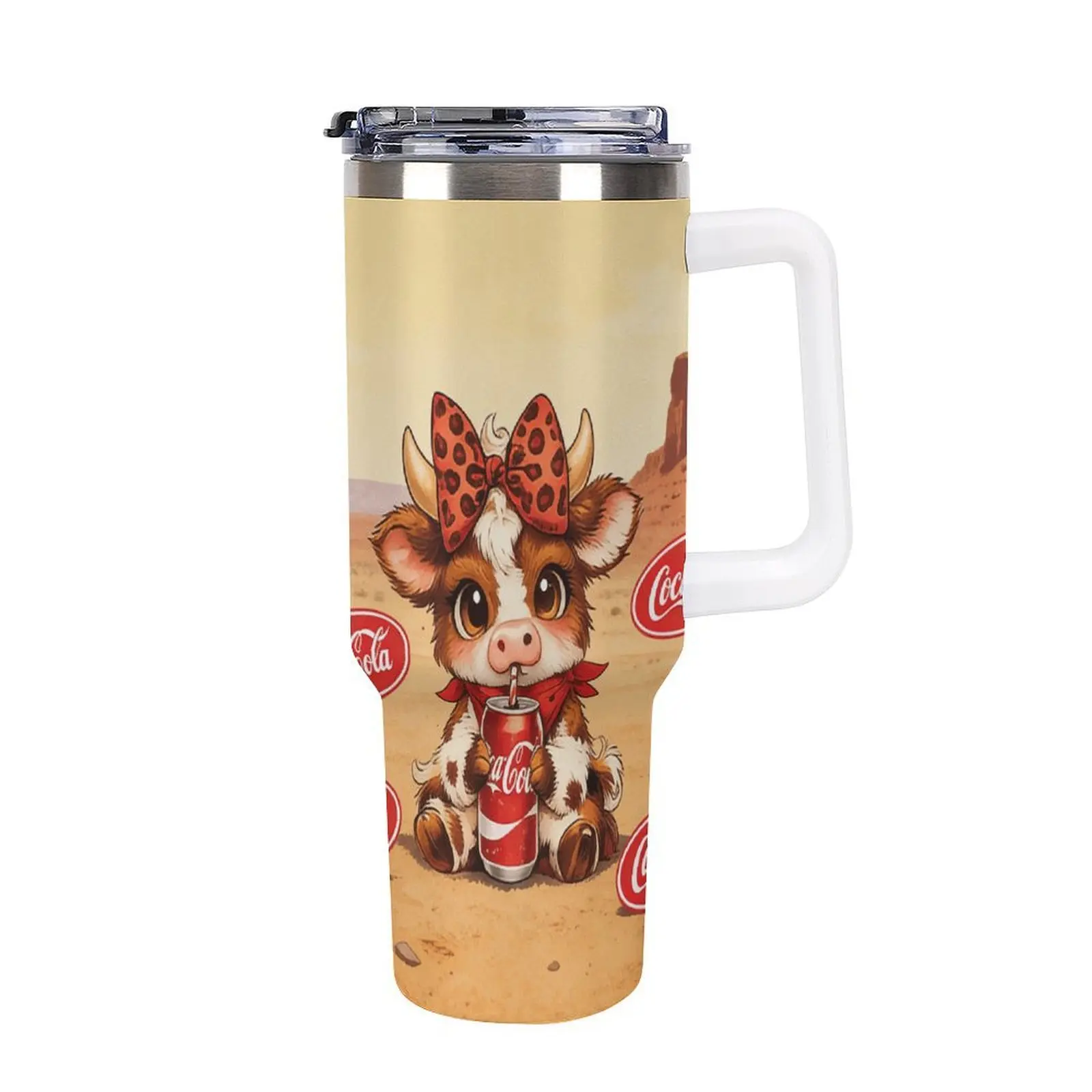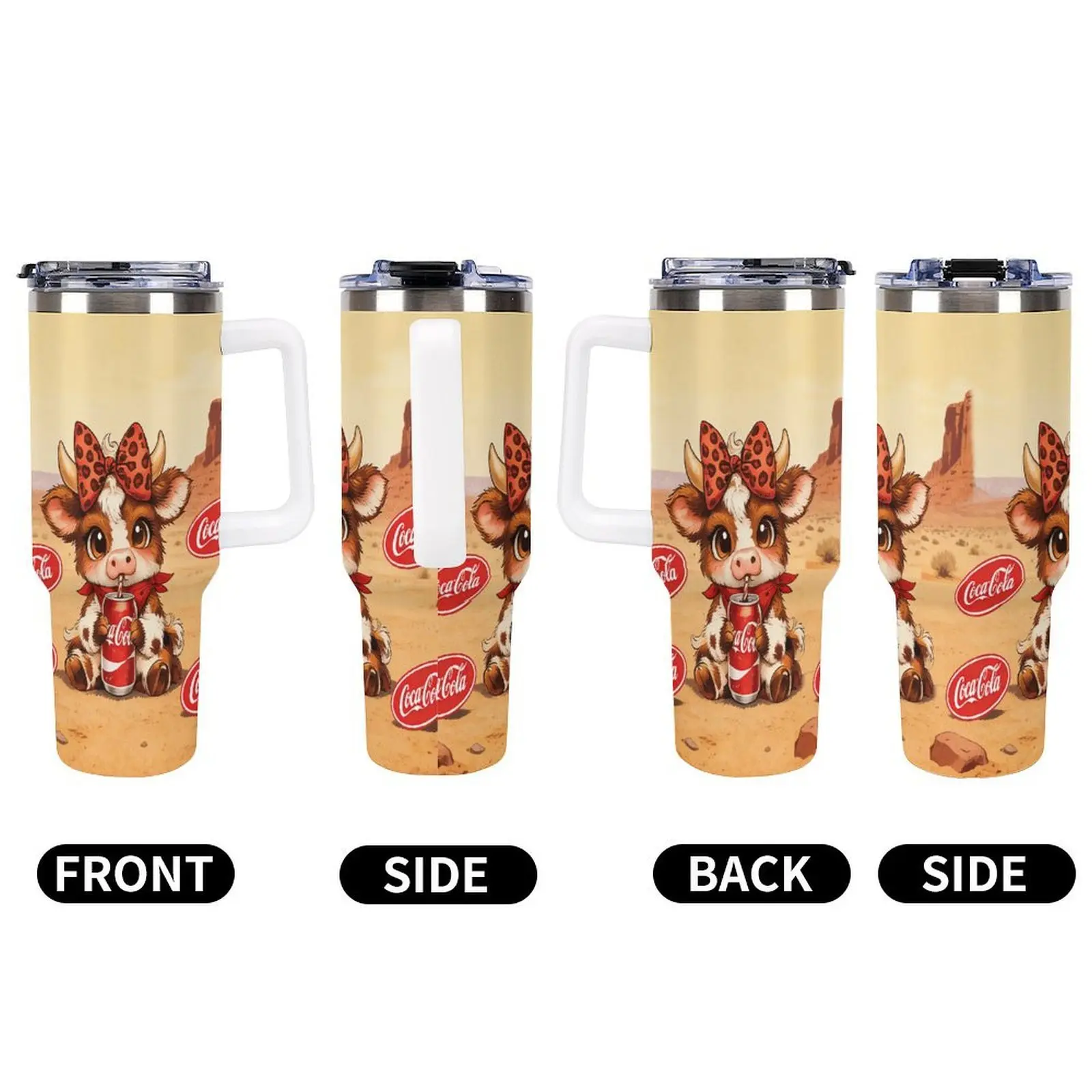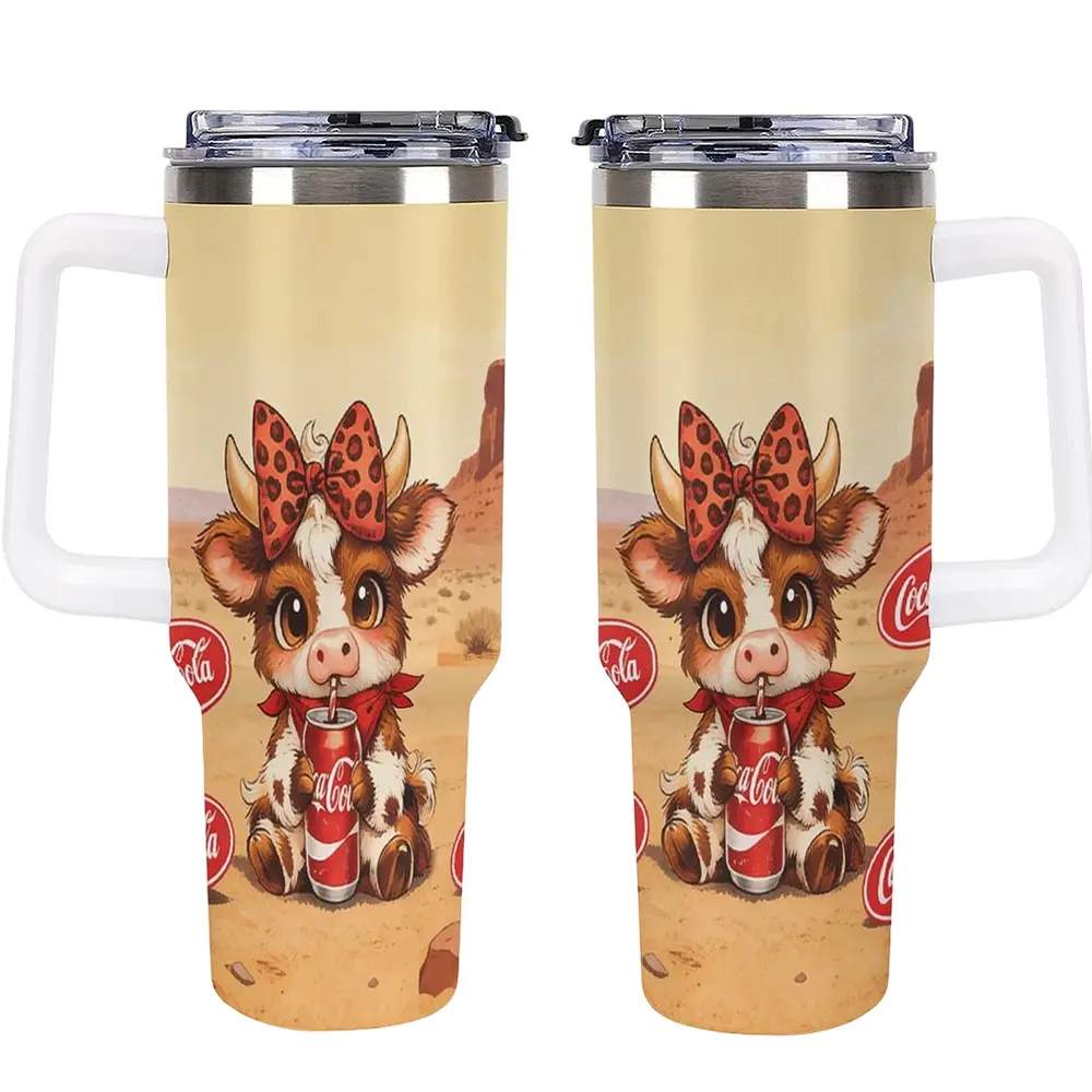 Western Cow Coca-Cola Insulated Tumbler 40oz with Handle, Cute Cow Leopard Print Soda Travel Cup, Gift for Coca-Cola Fans, Desert Cowgirl Tumbler for Soda Lovers